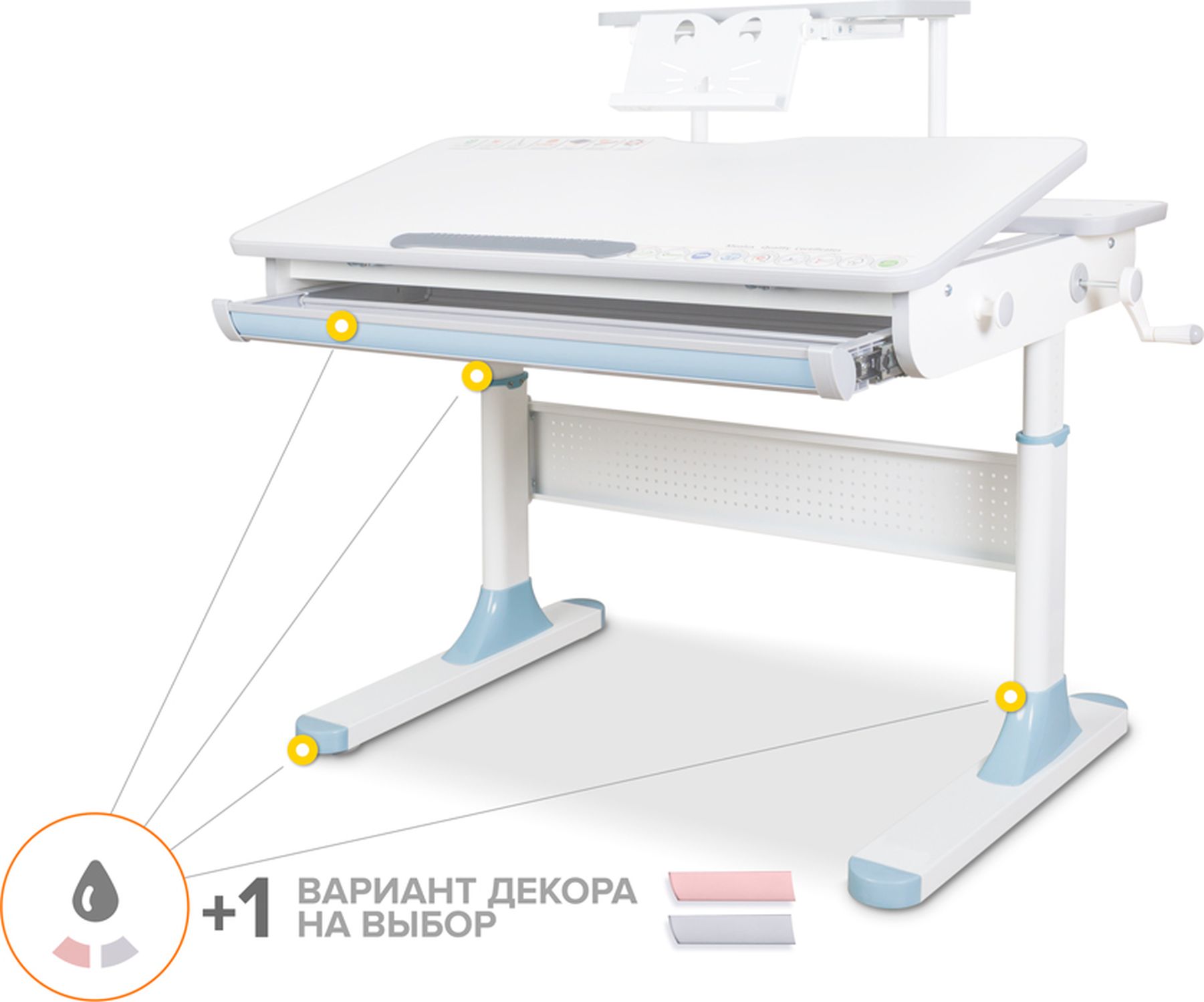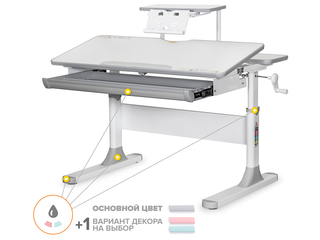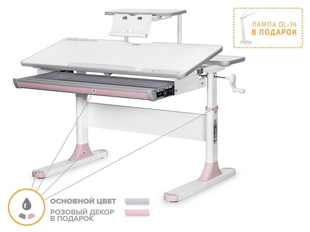 Приятные особенности:Одной из важных особенностей детской парты BD-610 Edmonton Lite является наличие цветных накладок в подарок! Приобретайте растущий стол и получите один з цветных наборов накладок совершенно бесплатно! Накладки представлены в розовом и голубом цветах. Стол имеет большой выдвижной органайзер, размещенный под столешницей, который изготовлен из прочного, безопасного пластика. Lite версия стола представлена как с полкой, так и без полки. Детский письменный стол BD-610 Mealux Edmonton с полкой S50 сочетает в себе стильный дизайн и высококачественные материалы. Эта модель позволит удобно разместить книгу или планшет на выдвижной металлической подставке для книг, которой укомплектована полка S50. Это доступный по цене детский письменный стол, с помощью которого создаются условия для комфортной работы и сохранения здоровья ребенка на протяжении всего срока обучения. Высота стола регулируется с помощью червячного механизма ручкой, которую при сборке можно установить либо справа, либо слева. С помощью газлифта столешница меняет угол наклона до 60 градусов, что помогает сохранить правильную осанку при работе за столом. Наличие съемного прорезиненного барьера на столешнице предотвратит скатывание предметов во время выполнения домашнего задания. В комплект к столу входит металлический крючок для размещения рюкзака или спортивной формы. Металлические ножки стола дополнены специальными регулировочными мебельными опорами для обеспечения его устойчивости.