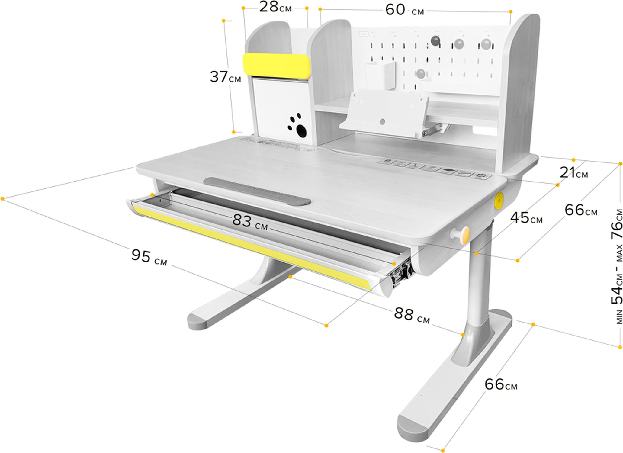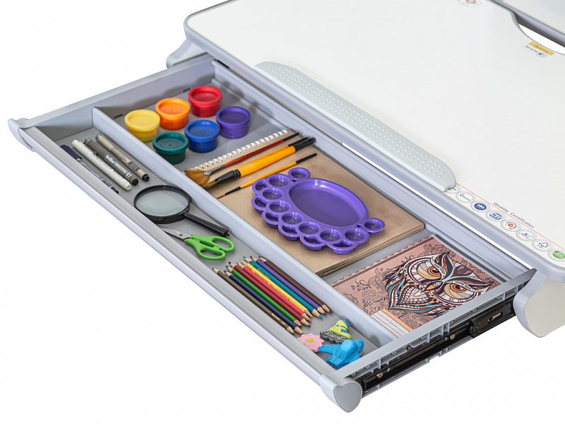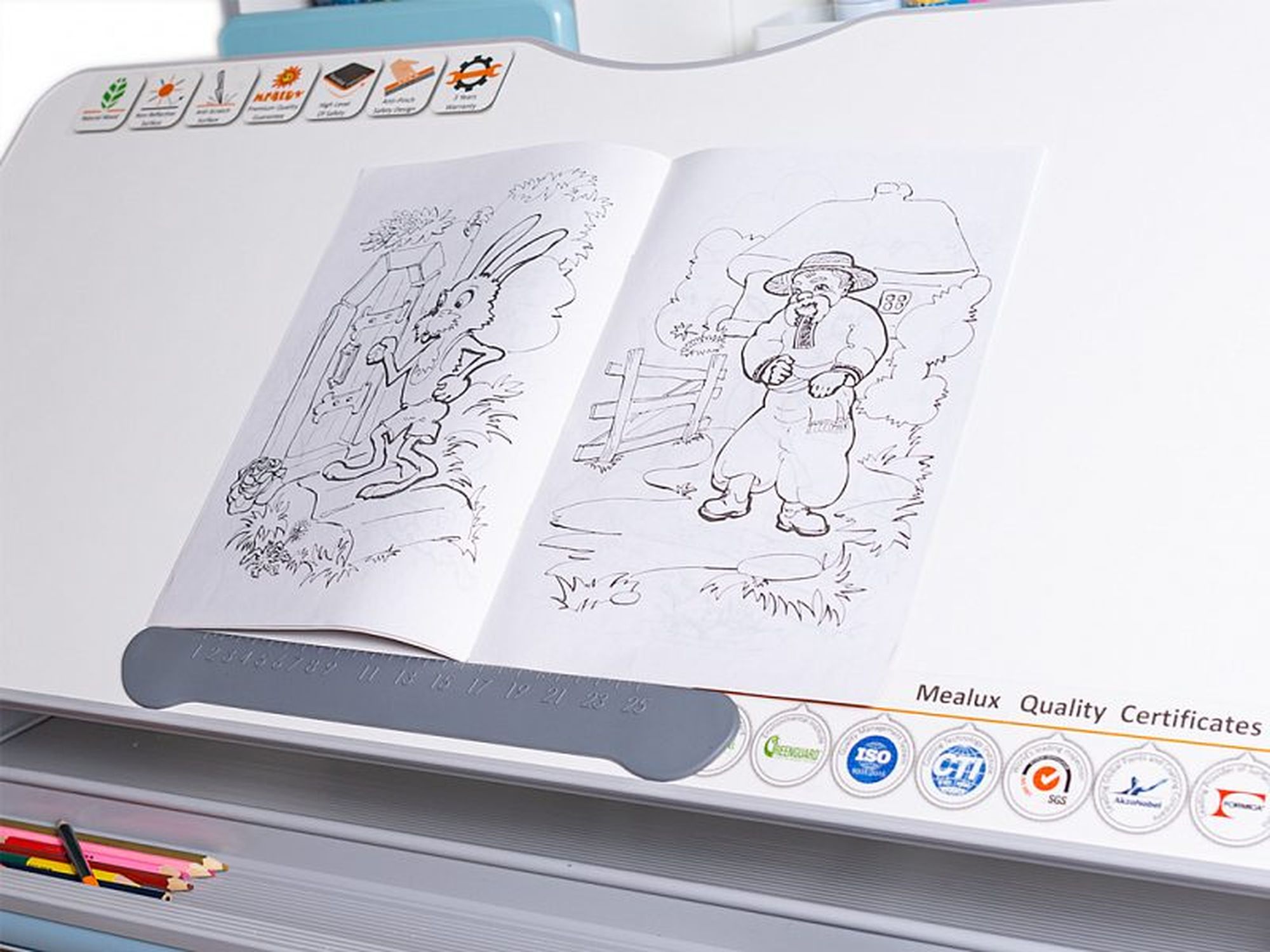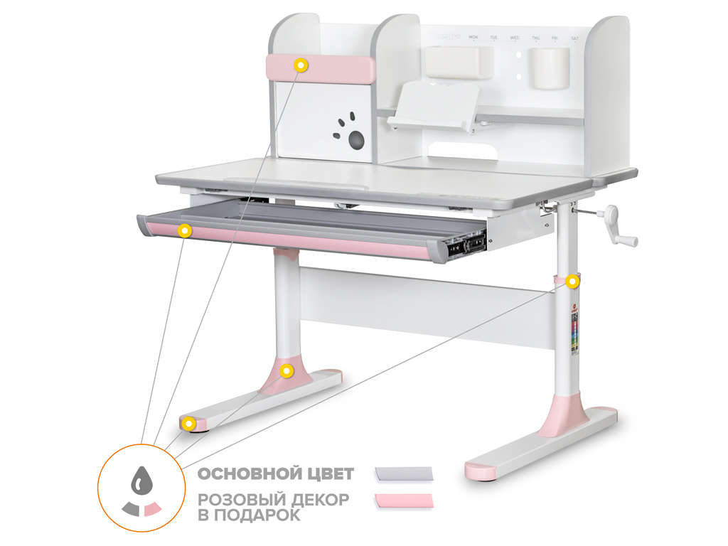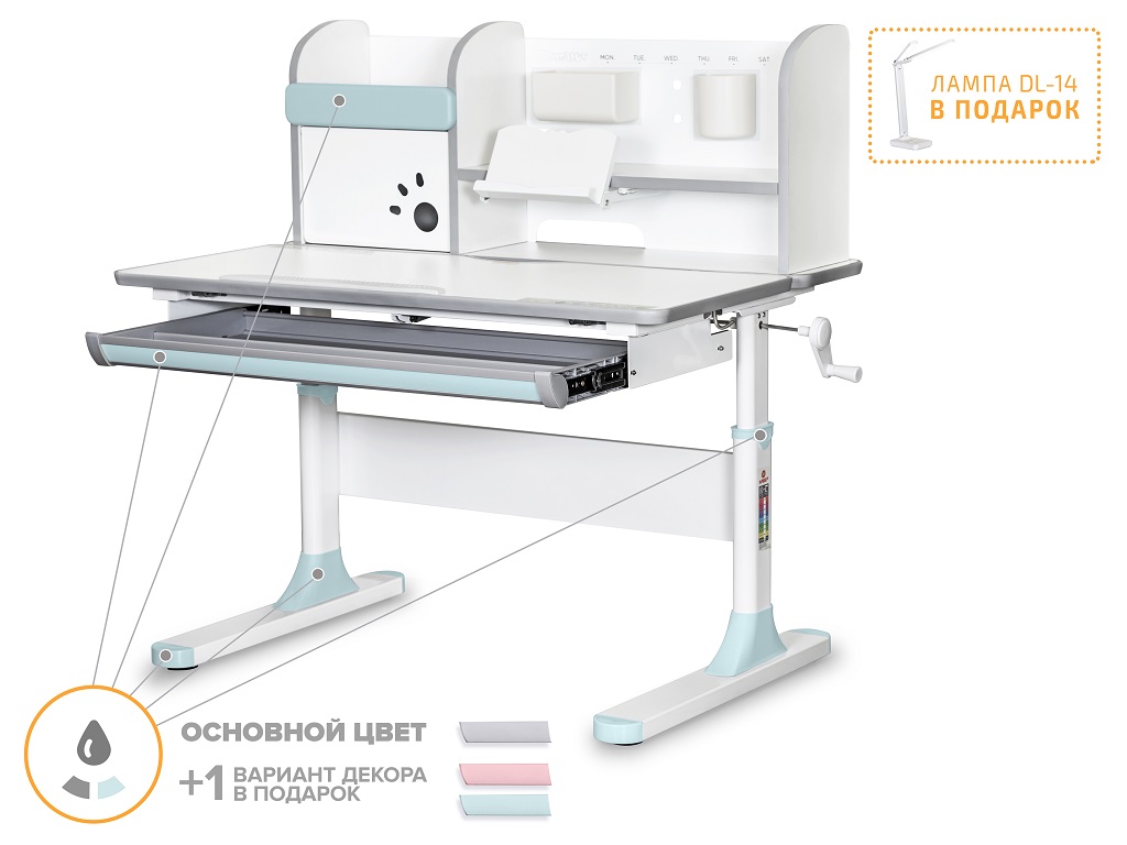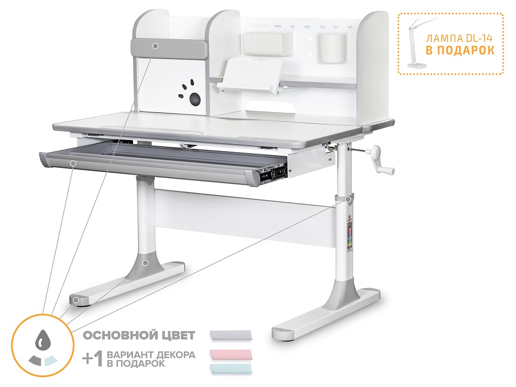 Приятные особенности:Детский стол-парта Mealux Edmonton Multicolor - эргономичная, регулируемая по высоте школьная парта для детей. Белый каркас дополнен цветными вставками розового, серого и голубого оттенков. Накладки всех цветов уже включены в комплект, меняйте их на Ваш вкус, сочетая с обстановкой. На наклонной поверхности удобно писать, читать книги, рисовать, используя вместо мольберта. Чтобы книги и тетради не скатывались вниз, столешница дополнена противоскользящим барьером. Снизу размещен компактный выдвижной пенал-органайзер для канцтоваров. А сверху располагается невысокая надстройка с полочками, металлической доской и закрытым шкафчиком. На доску с помощью магнитных держателей крепятся стикеры, «напоминалки» и различные заметки, а также есть отверстия для установки подвесных пеналов. Шкафчик закрывается оригинальной металлической дверцей с прорезью в форме лапки. Дверца открывается вверх. Выдвижная подставка позволит расположить книгу на оптимальном расстоянии на уровне глаз. Для портфеля предусмотрен крепкий металлический крючок. Широкие опоры оснащены накладками для выравнивания.