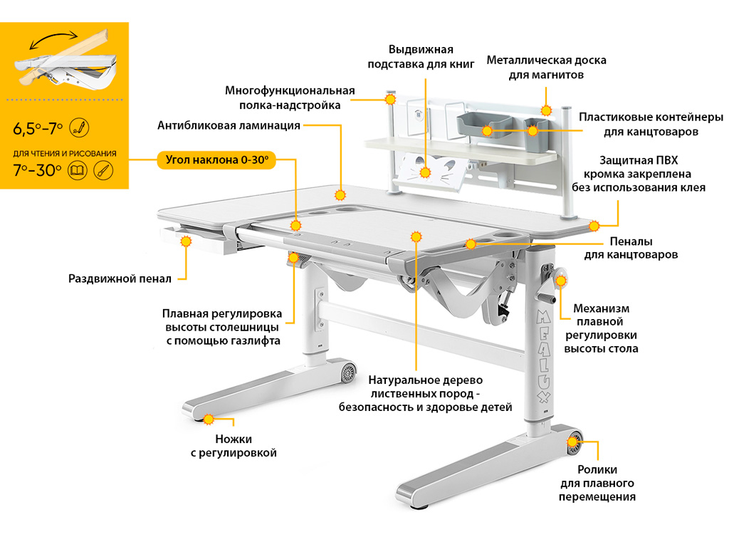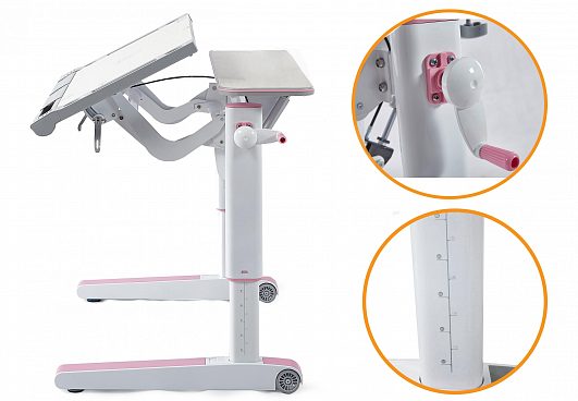 Приятные особенности : Детский стол-парта Mealux Kingwood Multicolor (BD-820) + полка изготовлен из материалов премиального качества. Столешница - натуральное дерево, которое сверху покрыто износоустойчивой, матовой ламинацией Formica, которая защищает стол от влаги и механических повреждений. Устойчивость всей конструкции стола обеспечивается массивным металлическим ножкам. Ножки дополнены специальными накладками для нивелирования стола. Специальным рычагом можно устанавливать оптимальный угол наклона в зависимости от занятий (письмо, чтение, рисование). С помощью специальной ручки можно регулировать высоту рабочей части столешницы. Заданная высота устанавливается независимо от высоты всей конструкции стола. Под статичной часть столешницы размещен выдвижной органайзер с разделителями для удобного хранения канцтоваров и прочих школьных принадлежностей. По периметру рабочей поверхности размещены пеналы для хранения канцтоваров. По бокам размещены пластиковые пеналы-накладки, а cнизу, вдоль столешницы, размещены металлические пеналы. Угол наклона столешницы регулируется в диапазоне 0-30 градусов, плавность регулировки обеспечивается высококачественным механизмом газ-лифт. Благодаря широкому диапазону регулировки высоты, данный стол отлично подходит, как для малышей, так и для взрослых. Высота стола легко регулируется специальной механической ручкой, а на ножках стола размещена специальная шкала соотношения высоты стола и роста ребенка. В результате стол и ребенок будут "расти" вместе и у ребенка будет формироваться правильная осанка. Также, стоит отметить, что регулируемая часть столешницы регулируется независимо от высоты всей конструкции стола. Одно из главных преимуществ данного стола - он подходит для работы стоя. Стоит отметить рекомендацию специалистов ортопедов, которая заключается в том, что для повышения эффективности выполнения заданий, а также улучшению общего состояния организма, необходимо менять положение "сидя-стоя" каждые 30-45 минут. Столешница разделена на две функциональные части: левая часть статичная, а правая часть - рабочая поверхность с возможностью независимой регулировки высоты и угла наклона. Также, задняя часть столешницы отлично подходит для хранения книг и тетрадей.
