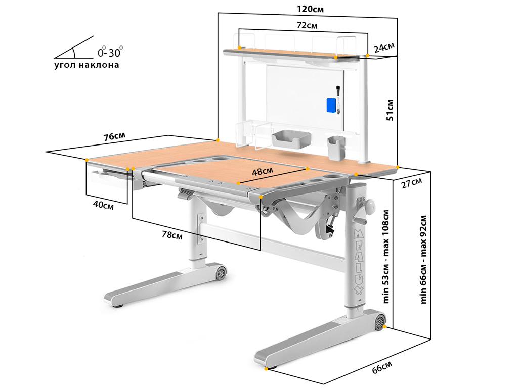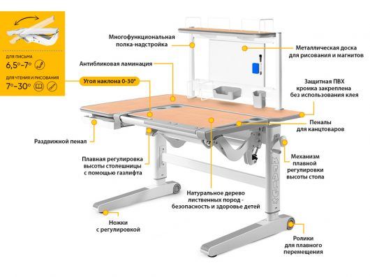Приятные особенности :Детский стол-парта Mealux Kingwood Multicolor (BD-820) + полкаизготовлен из материалов премиального качества. Столешница - натуральное дерево, которое сверху покрыто износоустойчивой, матовой ламинацией Formica, которая защищает стол от влаги и механических повреждений.Устойчивость всей конструкции стола обеспечивается массивным металлическим ножкам. Ножки дополнены специальными накладками для нивелирования стола. Специальным рычагом можно устанавливать оптимальный угол наклона в зависимости от занятий (письмо, чтение, рисование). С помощью специальной ручки можно регулировать высоту рабочей части столешницы. Заданная высота устанавливается независимо от высоты всей конструкции стола. Под статичной часть столешницы размещен выдвижной органайзер с разделителями для удобного хранения канцтоваров и прочих школьных принадлежностей. По периметру рабочей поверхности размещены пеналы для хранения канцтоваров. По бокам размещены пластиковые пеналы-накладки, а cнизу, вдоль столешницы, размещены металлические пеналы. Угол наклона столешницы регулируется в диапазоне 0-30 градусов, плавность регулировки обеспечивается высококачественным механизмом газ-лифт. Благодаря широкому диапазону регулировки высоты, данный стол отлично подходит, как для малышей, так и для взрослых. Высота стола легко регулируется специальной механической ручкой, а на ножках стола размещена специальная шкала соотношения высоты стола и роста ребенка. В результате стол и ребенок будут "расти" вместе и у ребенка будет формироваться правильная осанка. Также, стоит отметить, что регулируемая часть столешницы регулируется независимо от высоты всей конструкции стола. Одно из главных преимуществ данного стола - он подходит для работы стоя. Стоит отметить рекомендацию специалистов ортопедов, которая заключается в том, что для повышения эффективности выполнения заданий, а также улучшению общего состояния организма, необходимо менять положение "сидя-стоя" каждые 30-45 минут. Столешница разделена на две функциональные части: левая часть статичная, а правая часть - рабочая поверхность с возможностью независимой регулировки высоты и угла наклона. Также, задняя часть столешницы отлично подходит для хранения книг и тетрадей