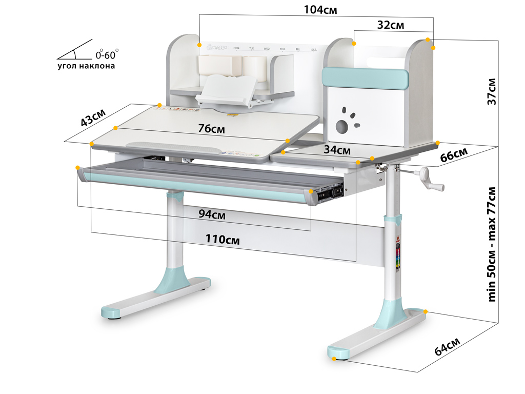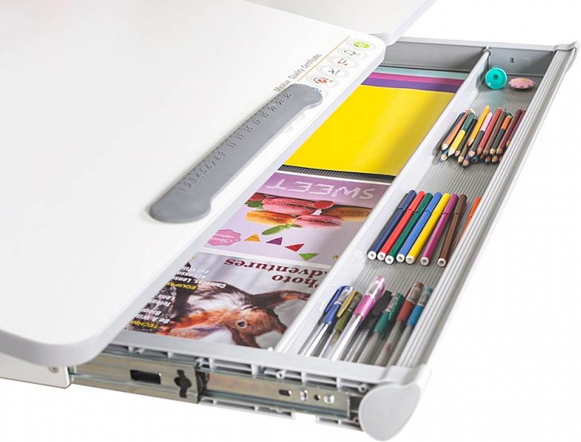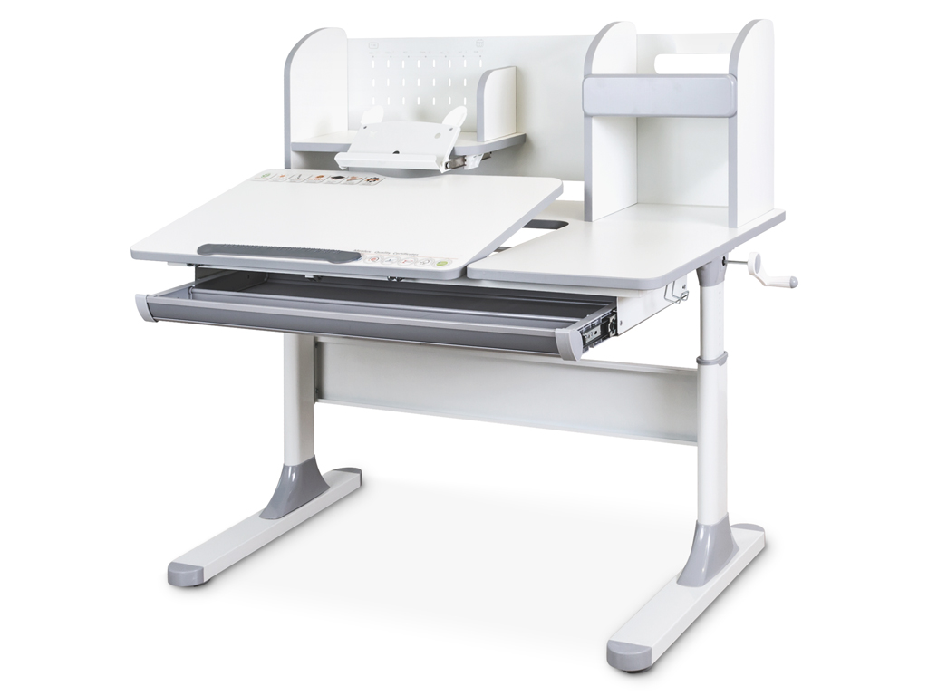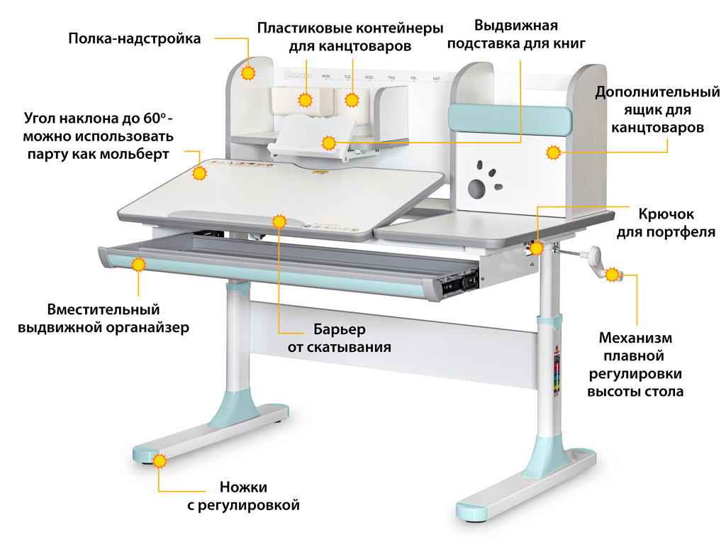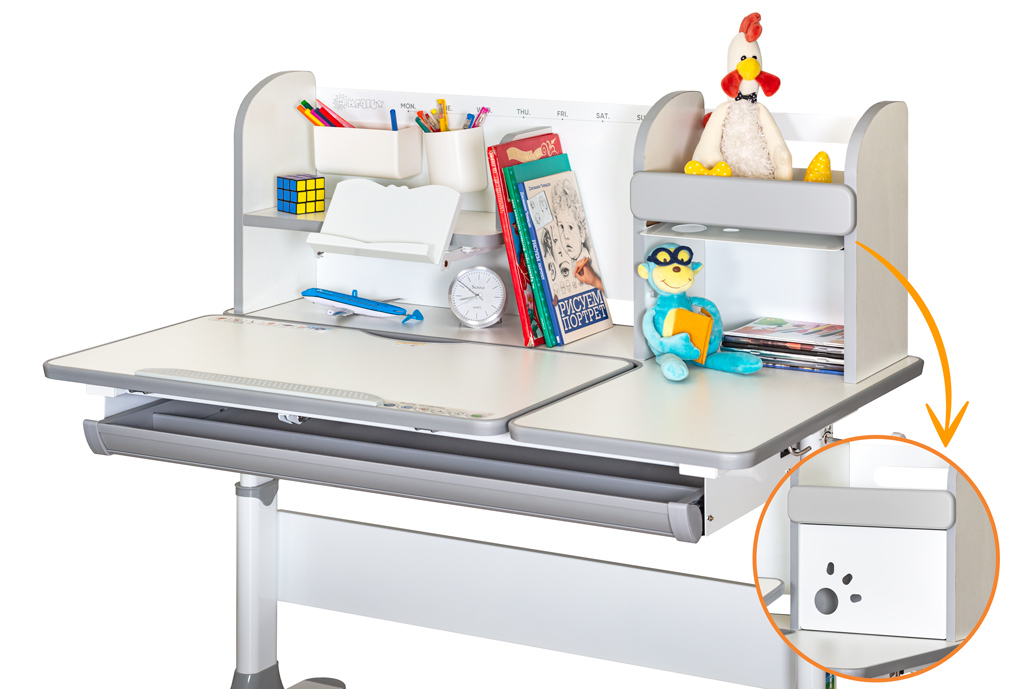 Приятные особенности:Важной особенностью детского стола-парты Mealux Vancouver Multicolor является наличие сменных цветных накладок. Приобретайте полную комплектацию стола в сером цвете и получите розовые либо голубые накладки совершенно бесплатно! Накладки меняются на ножках, выдвижном органайзере и полке надстройке. Меняйте цвет в зависимости от настроения!Под столешницей размещается большой и прочный органайзер для хранения школьных принадлежностей. В большое отделение ребенок может класть тетради, альбом для рисования, а в маленькое – мелкую и крупную канцелярию: ручки, карандаши, краски для рисования и многое другое.На множестве полочек можно размещать учебники и другую литературу. Задняя стенка надстройки сделана из металла, поэтому вы легко можете использовать ее как место крепления заметок с помощью магнитов. Важным дополнением полки-надстройки является наличие выдвижной металлической подставки для книги.Высота всего стола плавно регулируется с помощью специальной механической ручки, которая расположена сбоку. Шкала соотношения роста ребенка, что изображена на ножках, поможет самостоятельно подобрать оптимальную высоту.Подвижная часть столешницы меняет свой угол наклона с помощью специального газлифта. Одно плавное нажатие и вы трансформируете рабочую зону для письма и чтения, а благодаря большому углу наклона (до 60 градусов) столешницу можно использовать для рисования, как мольберт. Чтобы ребенок не травмировался, когда самостоятельно будет менять угол наклона, на столешнице есть безопасный зазор.На краю подвижной части столешницы прикреплен прорезиненный барьер, предотвращающий скатывание предметов.Сбоку, у стола крепится металлический крючок, на который ребенок может повесить портфель или спортивную форму.Устойчивость всей конструкции стола обеспечивается массивным металлическим ножкам. Ножки дополнены специальными накладками для регулировки уровня пола.