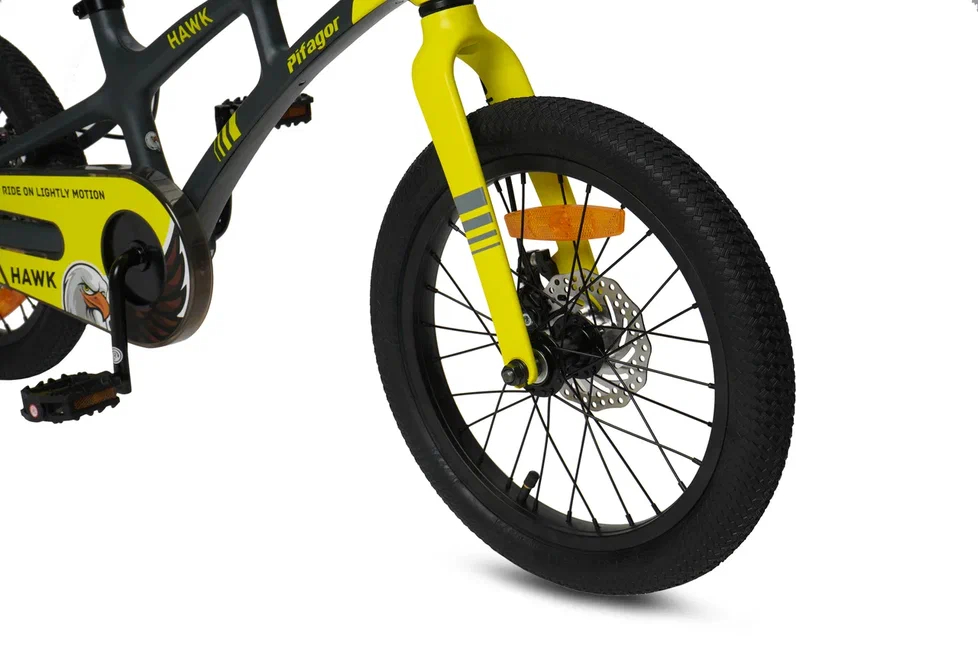 Приятные особенности: Детский велосипед Pifagor Hawk 16прекрасный выбор для начинающих. Предназначен для ребят 4-6 лет для катания по городским и парковым дорожкам. Приобрести такой можно, как мальчику, так и девочке. Данная модель собрана на основе облеченной рамы из магниевого сплава, оснащен жесткой облегченной вилкой из того же материала, имеет промышленные подшипники каретки, надежные дисковые механические тормоза (ручные) и полноразмерную защиту цепи. У велосипеда Pifagor Hawk 16 регулируется седло по высоте и наклону, а также наклон руля.