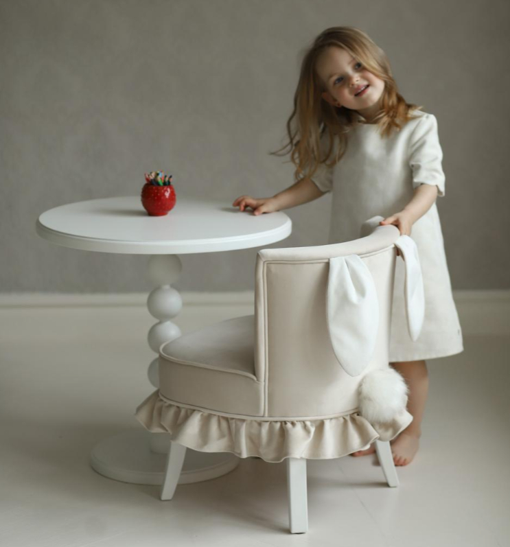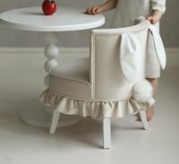 Приятные особенности: Стул Amari модель зайка в светло бежевом молочном антивандальном велюре с юбкой рюшей и белыми ушками и хвостом. Эргономика стула рассчитана на ребенка до 8 лет, но благодаря широкому полноразмерному сидению на стуле комфортно сидеть даже взрослому человеку. За таким стульчиком ребенку понравится заниматься и творить, ведь на нем очень удобно и мягко. Высота сидения стула от пола до сидения 32 см рассчитана под высоту стола 50-55 см. Каркас стула массив бука, покраска светлое дерево. Обивка мебельный моющийся велюр.