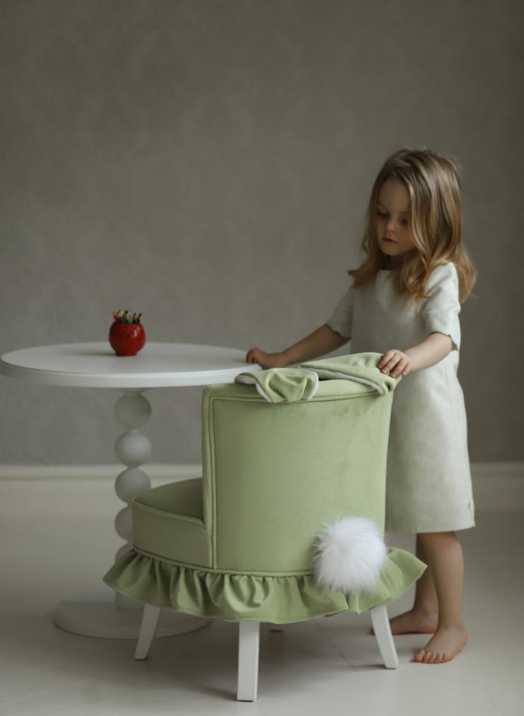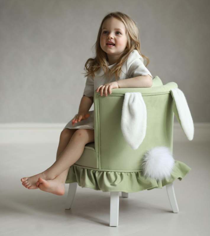 Приятные особенности: Стул Amari модель зайка Оливка с подушечкой и юбкой в моющемся антивандальном велюре. Эргономика стула рассчитана на ребенка до 8 лет, но благодаря широкому полноразмерному сидению на стуле комфортно сидеть даже взрослому человеку. За таким стульчиком ребенку понравится заниматься и творить, ведь на нем очень удобно и мягко. Высота сидения стула от пола до сидения 32 см рассчитана под высоту стола 50-55 см. Каркас стула массив бука, покраска светлое дерево. Обивка мебельный моющийся велюр.