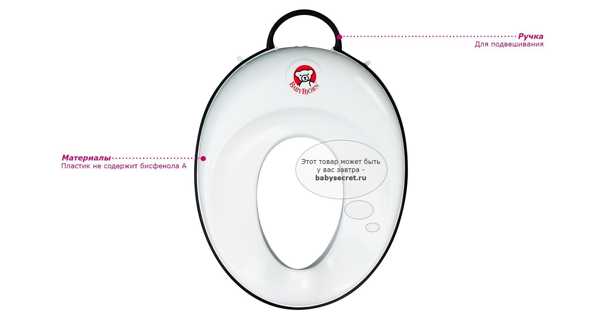 Приятные особенности детского сидения для унитаза BabyBjorn Toilet Trainer:для того чтобы научиться чему-то новому, требуется время. При помощи сиденья для унитаза вашему ребенку будет легче научиться пользоваться туалетом. Мягкие формы сиденья для унитаза позволяют ребенку удобно и правильно сидеть. Никакие острые края не касаются кожи ребенка. Отрегулируйте cиденье для унитаза при первом использовании, чтобы оно подходило для вашего туалета, после чего ребенок сможет легко его класть и снимать сам. Сиденье для унитаза легко содержать в чистоте, а защита от брызг с наклоном вовнутрь предотвращает разбрызгивание. Сиденье снабжено практичной ручкой, на которую его легко вешать, когда оно не используется .С сиденьем для туалета Toilet Trainer малыш быстро, безопасно и с комфортом научится пользоваться туалетом и чувствовать себя взрослым!