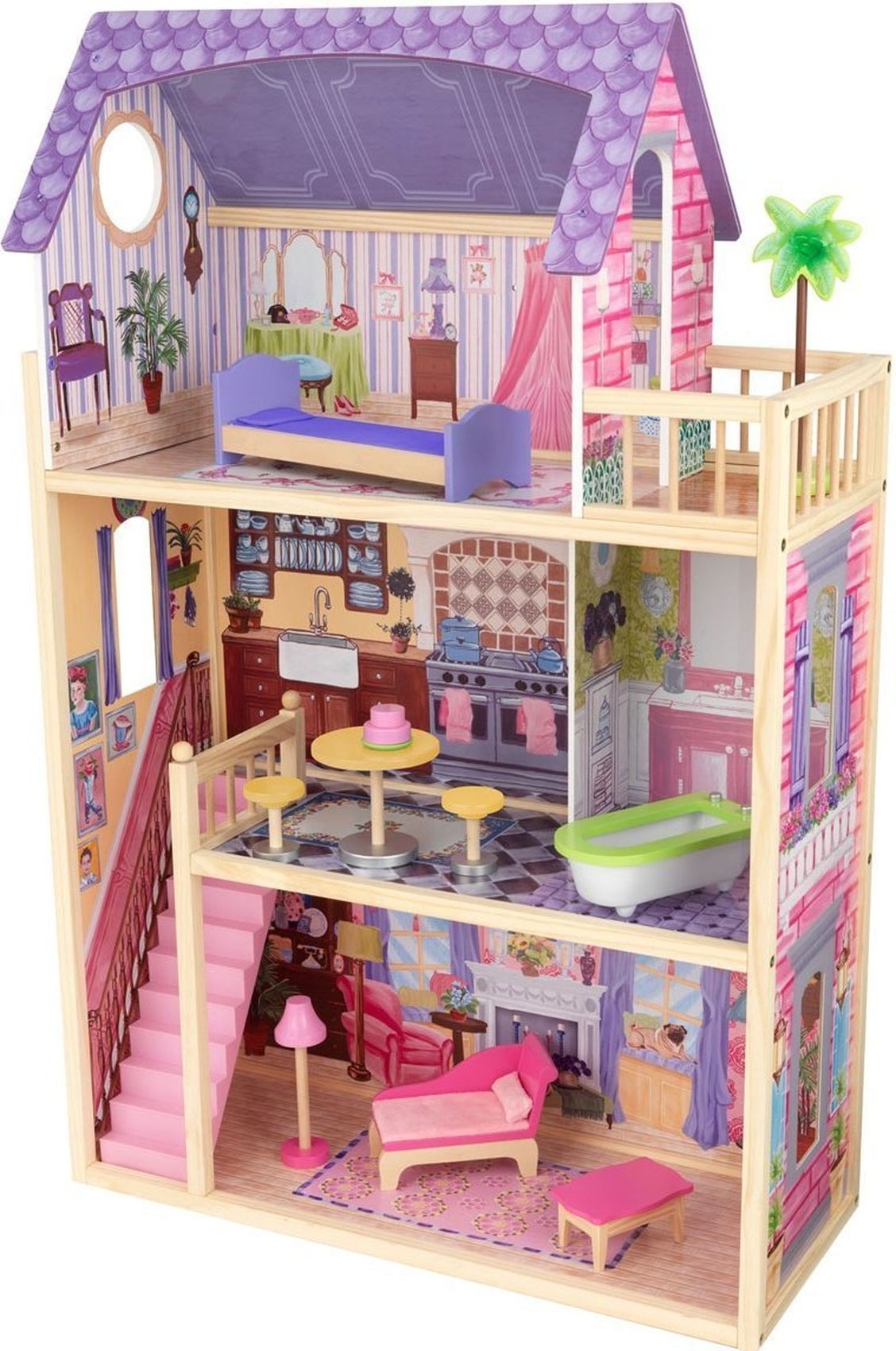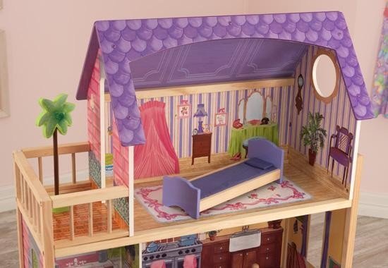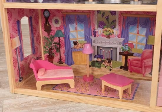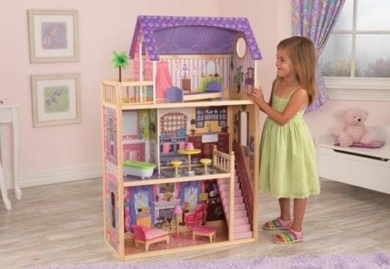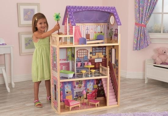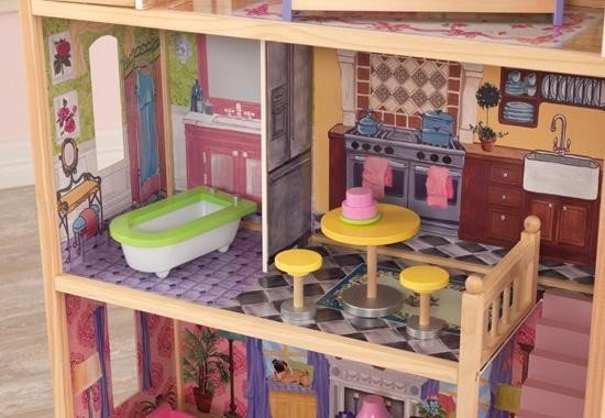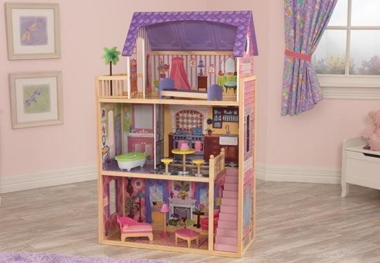 Приятные особенности кукольного домика с мебелью KidKraft "Кайла": идеальный презент для ребенка на день рождение. Это место будет любимым местом обитанием кукол ростом до 30 см. Розовыми и сиреневыми оттенками пестрит этот особняк. Боковые стенки выполнены в виде рисунка с имитацией массивной кладки из кирпича. Элементы фасада сделаны с использованием различных оттенков василькового цвета. Такие тона создают эффект легкости, богатства и воздушности. Конструкция домика продумана до самых мельчайших подробностей. Здесь созданы условия для комфортного и уютного отдыха. Внутренняя часть помещения выполнена в современном стиле с использованием традиционной классики. Для изображения напольных и настенных покрытий используются ламинат, обои, керамическая плитка и тому подобное. Внешний вид особняка заставляет задуматься о спокойной и размеренной жизни. Домик имеет 4 комнаты. Каждая из них имеет свои отличительные черты и особенности. На нижнем этаже расположена уютная гостиная с камином. На 2-м этаже – ванная и кухня. Спальная комната находится на 3-ем этаже. Чтобы подняться на второй этаж, можно воспользоваться маленькой и компактной лестницей. В наборе имеются 10 дополнительных мебельных аксессуаров, которые будут гармонично сочетаться с интерьером комнаты. Даже самому захочется пожить в таком роскошном, красивом и ярком домике!