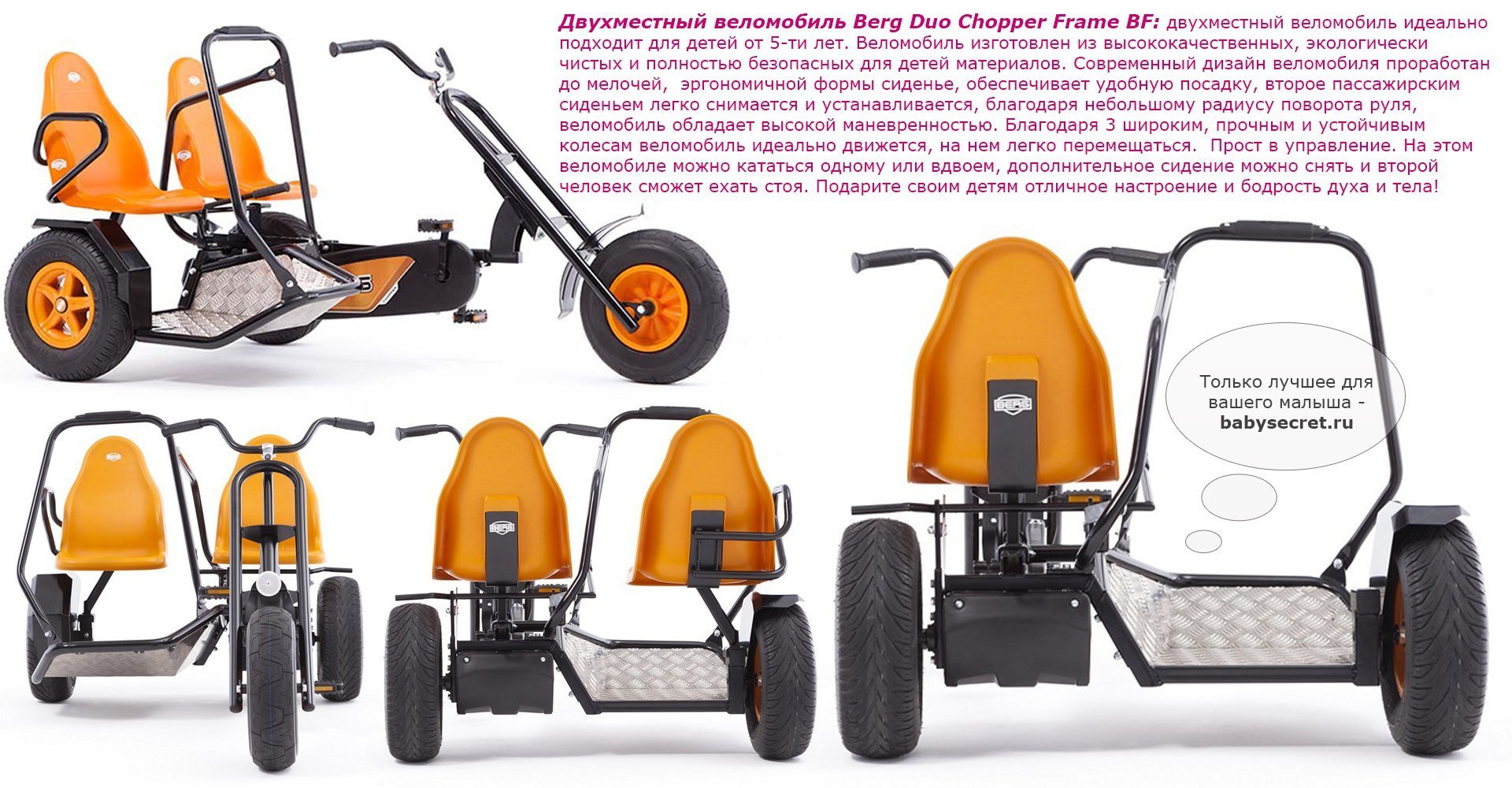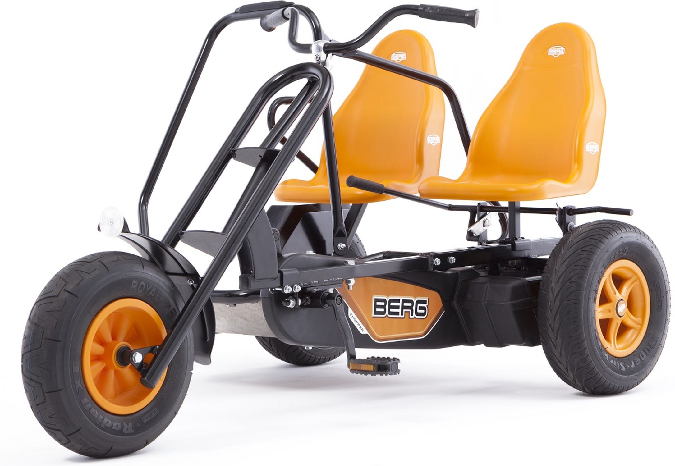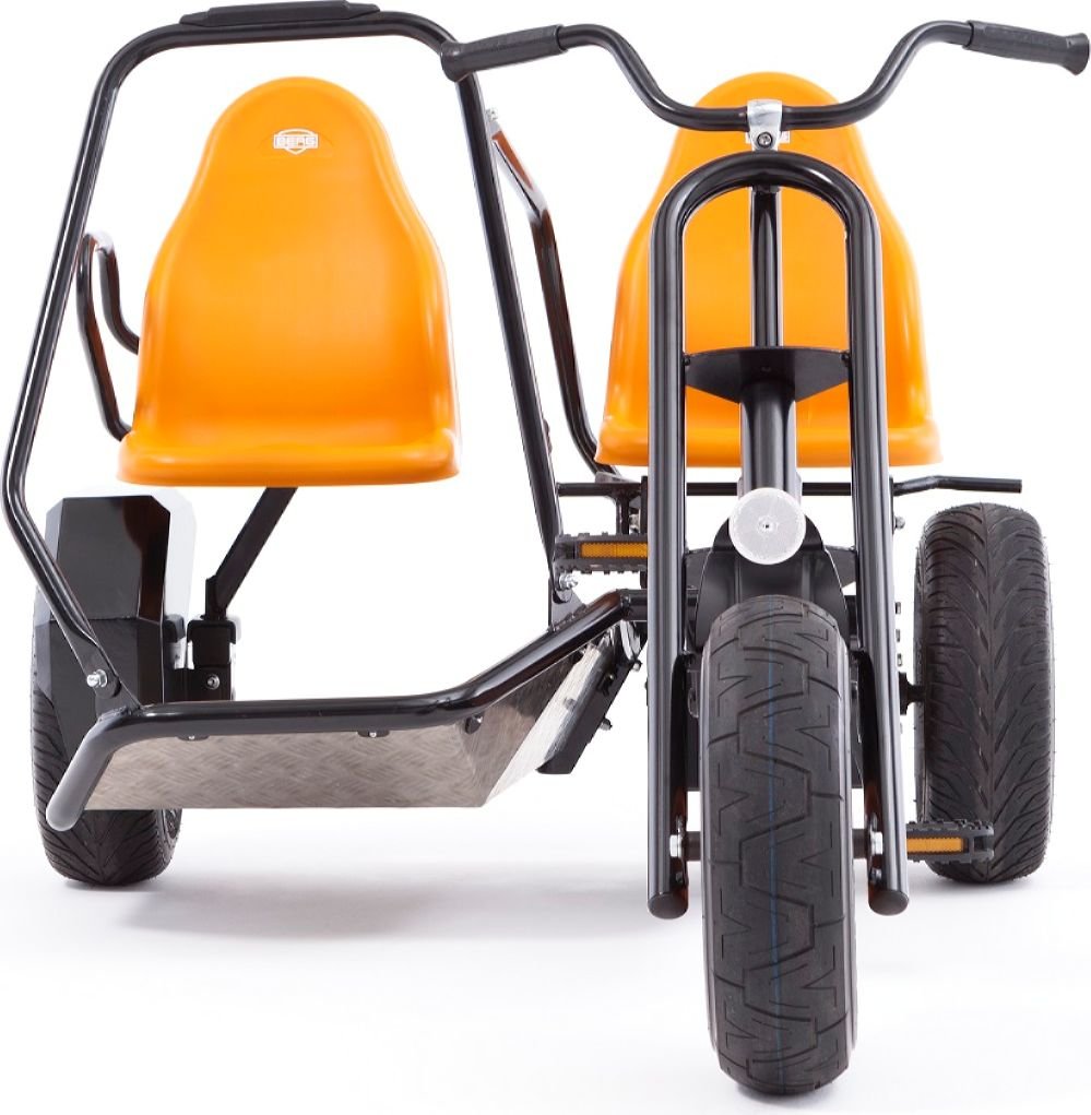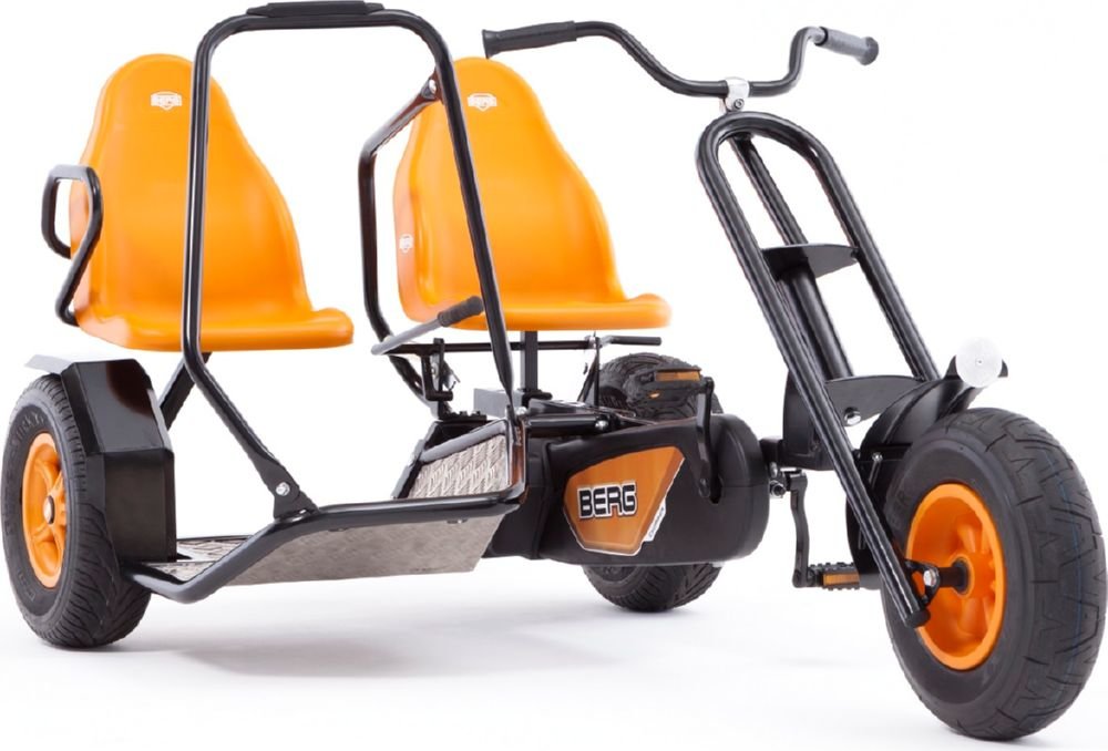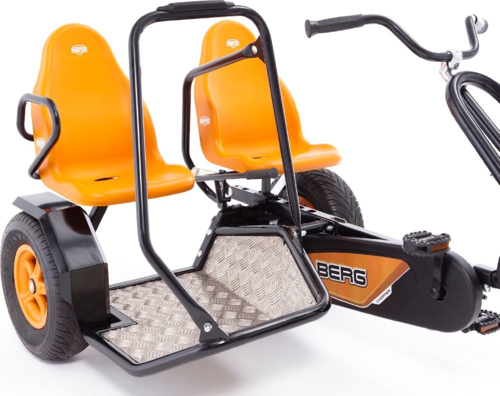 Приятные особенности веломобиля BergDuo Chopper BFR:Отличительной особенностью веломобиля Duo Chopper является возможность кататься вдвоем! Пассажирское сиденье, можно снять и держась за поручень, продолжить движение стоя! При этом, если пассажир захочет присесть, вместо сиденья он может использовать заднее крыло. В связи с особенносятми конструкции, ручной тормоз блокирует только левое заднее колесо.Chopper - особенные веломобили, которые выделяются на фоне других моделей, тем, что в их основе трехколесная база. Преимущество трехколесной базы в том, что радиус их поворота чрезвычайно мал и позволяет веломобилям совершать красивые пируэты, без проблем проходя крутые повороты.BERG Duo Chopper оснащен приводом BF , что позволяет веломобилю двигаться вперед и тормозить педалями. Задних ход ограничен, в целях безопасности из-за габаритов веломобиля. Для более уверенного торможения, веломобиль оснащен ручным тормозом, который блокирует левое заднее приводное колесо.На веломобилях Duo Chopper можно кататься вдвоем. Пассажирское сиденье не регулируется, однако его можно снять и, держась за поручень, продолжить движение стоя!