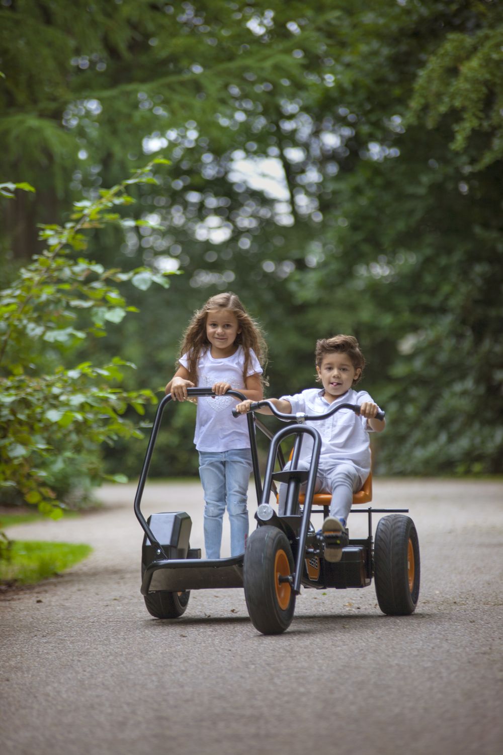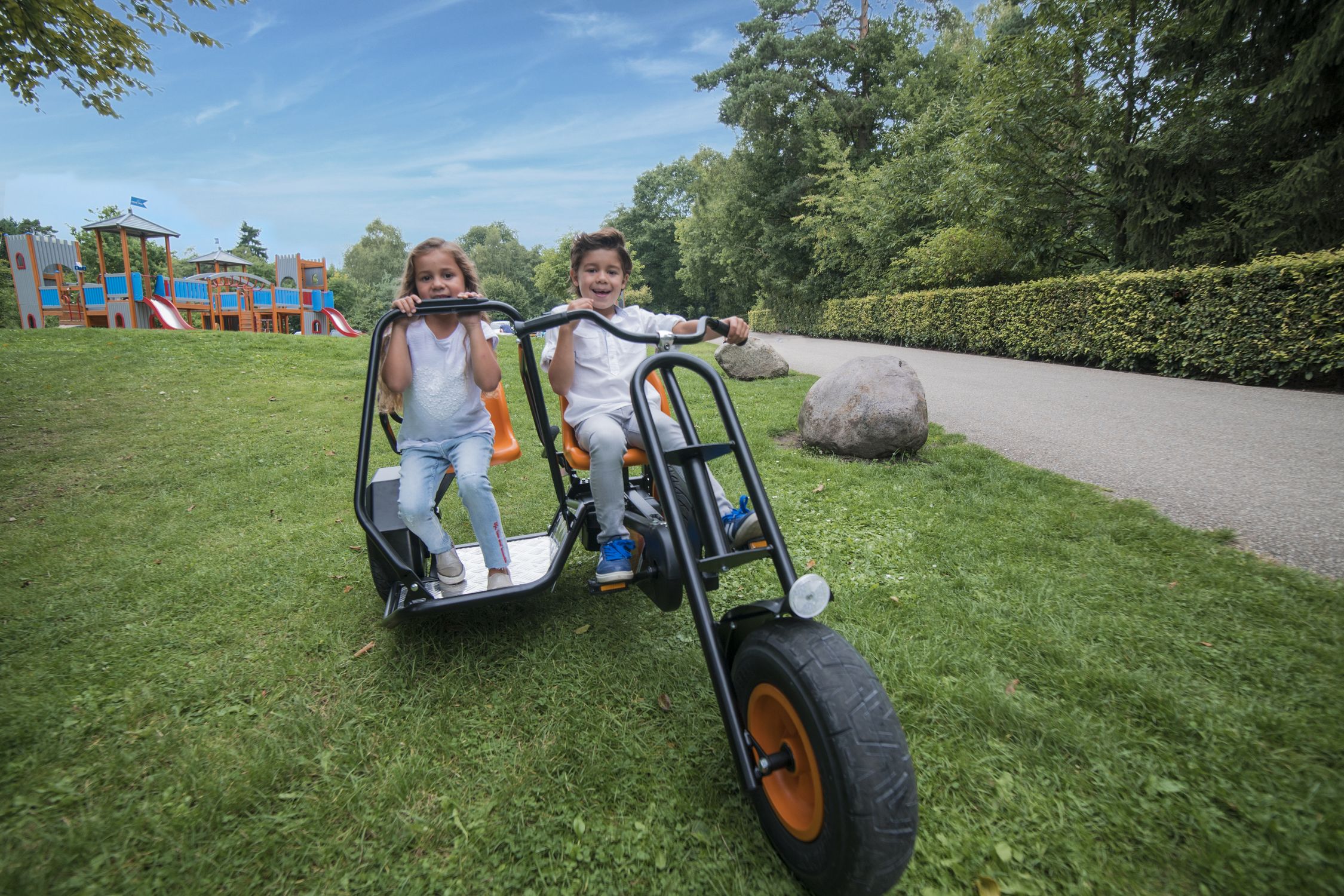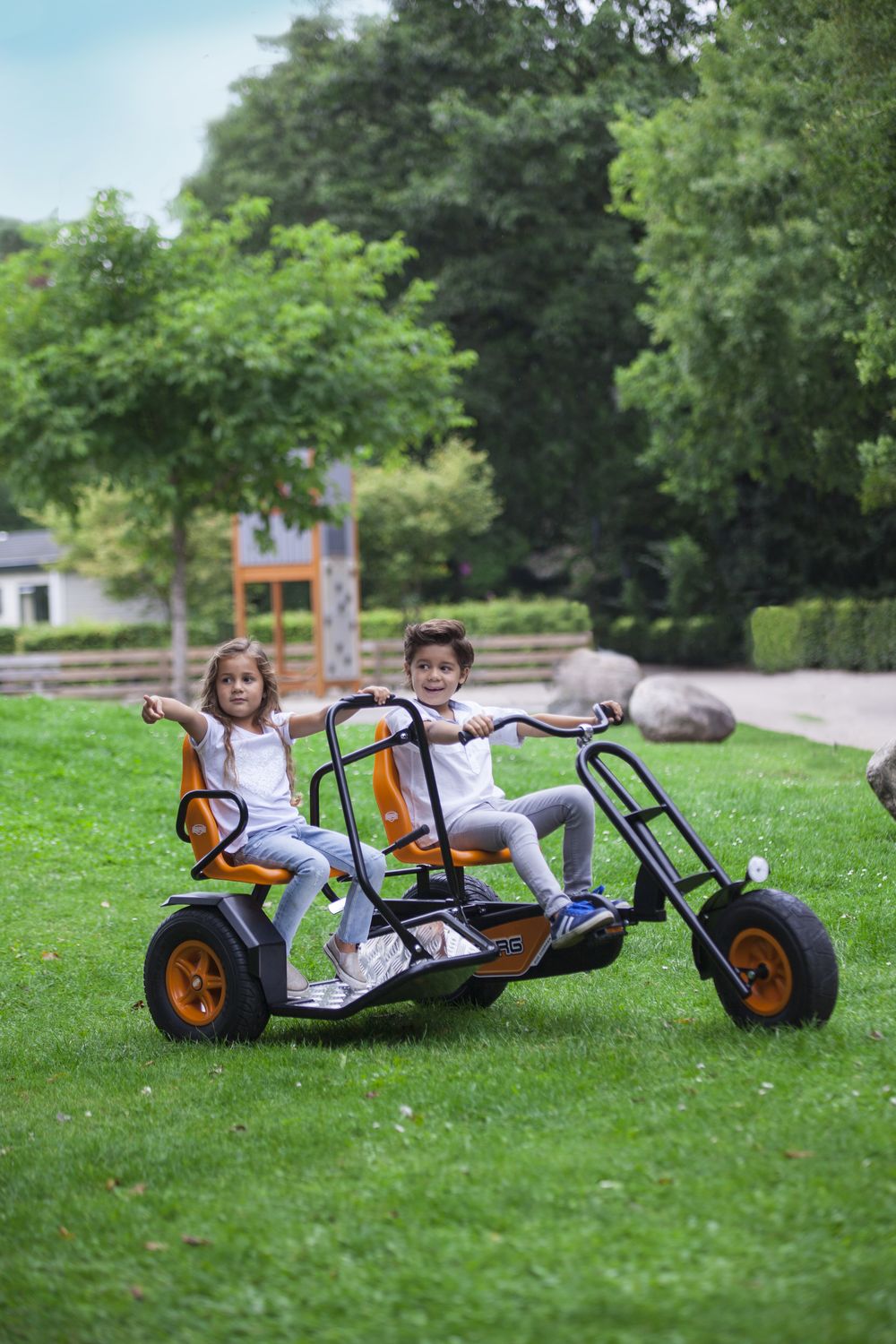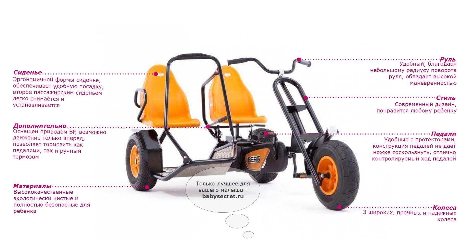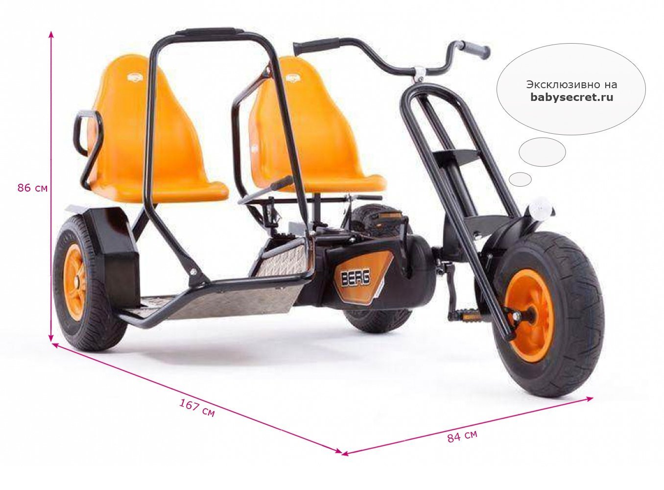Приятные особенности веломобиля BergDuo Chopper BFR:Отличительной особенностью веломобиля Duo Chopper является возможность кататься вдвоем! Пассажирское сиденье, можно снять и держась за поручень, продолжить движение стоя! При этом, если пассажир захочет присесть, вместо сиденья он может использовать заднее крыло. В связи с особенносятми конструкции, ручной тормоз блокирует только левое заднее колесо.Chopper - особенные веломобили, которые выделяются на фоне других моделей, тем, что в их основе трехколесная база. Преимущество трехколесной базы в том, что радиус их поворота чрезвычайно мал и позволяет веломобилям совершать красивые пируэты, без проблем проходя крутые повороты.BERG Duo Chopper оснащен приводом BF , что позволяет веломобилю двигаться вперед и тормозить педалями. Задних ход ограничен, в целях безопасности из-за габаритов веломобиля. Для более уверенного торможения, веломобиль оснащен ручным тормозом, который блокирует левое заднее приводное колесо.На веломобилях Duo Chopper можно кататься вдвоем. Пассажирское сиденье не регулируется, однако его можно снять и, держась за поручень, продолжить движение стоя!