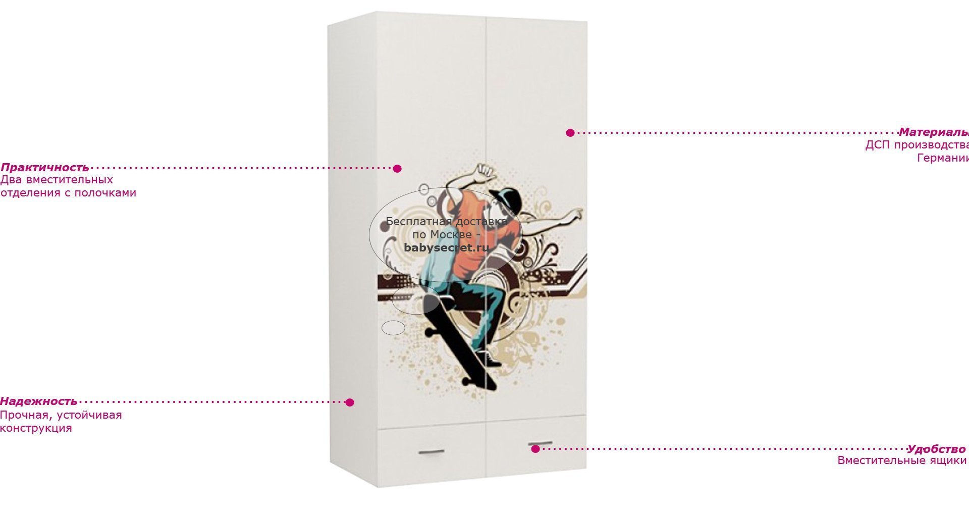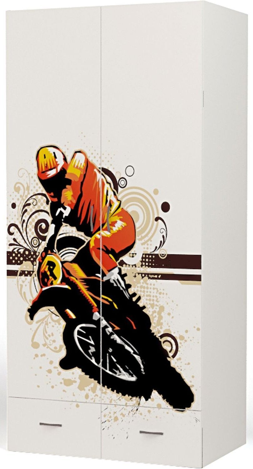 Приятные особенности двустворчатого шкафаABC King Extreme Moto:сделан из экологически чистых материалов, безопасных для детей. Основой является ДСП производства Германии, где предъявляются самые строгие требования к качеству.У мебели Адвеста есть преимущество, которое понравится, как детям, так и взрослым. Детскую мебель можно красиво оформить специальными картинками, которые изготовлены из прочных и долговечных материалов, позволяющих проводить влажную уборку. Картинки, украшающие фасады мебели нарисованы акриловыми красками, которые безвредны для человека, экологически чисты, долго держатся и не выцветают.