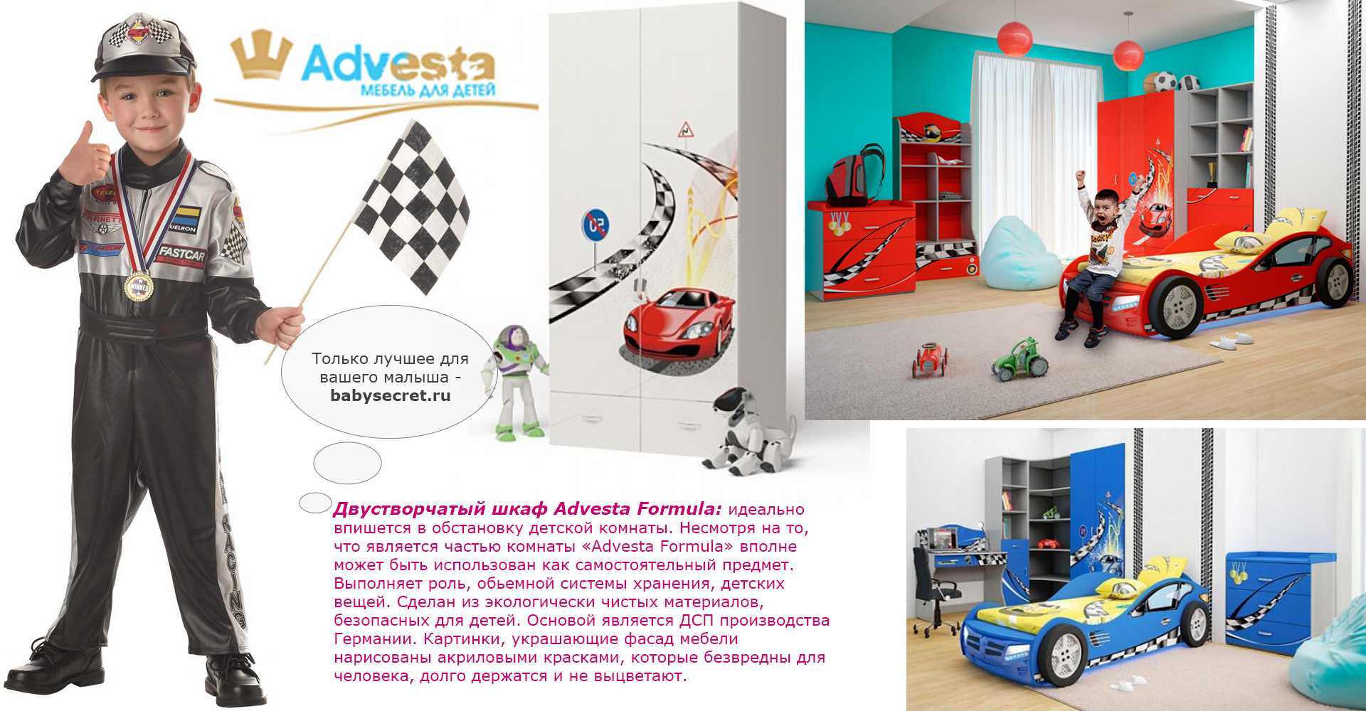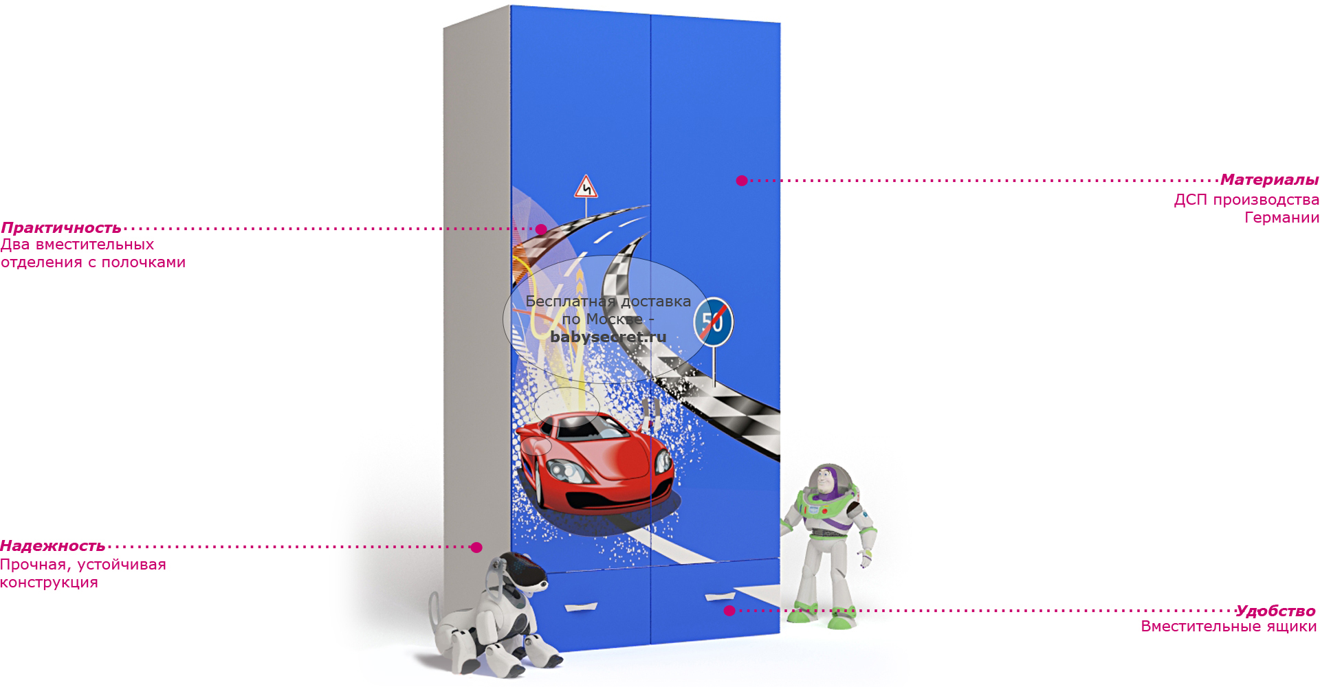 Приятные особенностишкафа Formula:сделан из экологически чистых материалов, безопасных для детей. Основой является ДСП производства Германии, где предъявляются самые строгие требования к качеству. У мебели есть преимущество, которое понравится, как детям, так и взрослым. Детскую мебель можно красиво оформить специальными картинками, которые изготовлены из прочных и долговечных материалов, позволяющих проводить влажную уборку. Картинки, украшающие фасады мебели нарисованы акриловыми красками, которые безвредны для человека, экологически чисты, долго держатся и не выцветают.