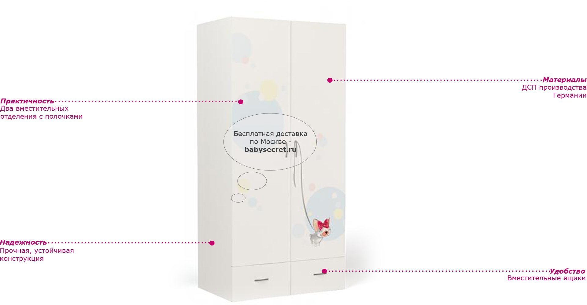 Приятные особенности шкафа Molly: сделан из экологически чистых материалов, безопасных для детей. Основой является ДСП производства Германии, где предъявляются самые строгие требования к качеству. На фасады нанесен яркий рисунок, что непременно порадует вашего ребенка.