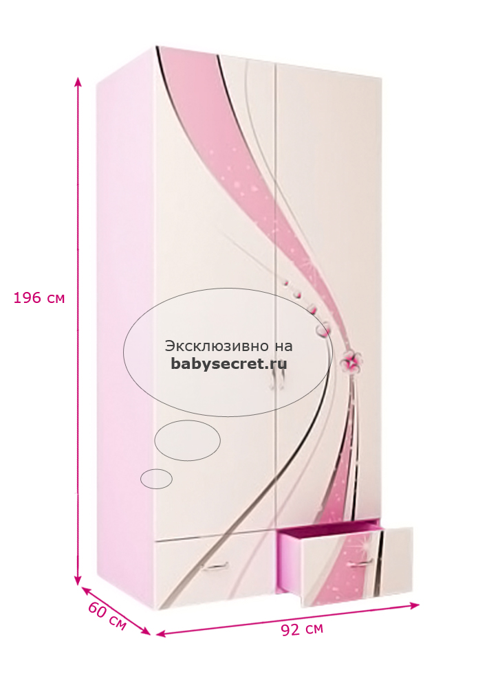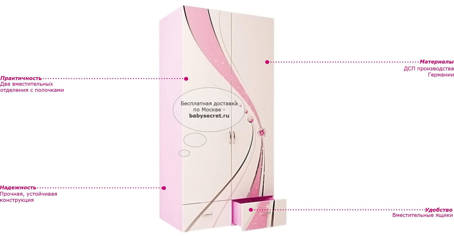 Приятные особенности шкафа Princess: сделан из экологически чистых материалов, безопасных для детей. Основой является ДСП производства Германии, где предъявляются самые строгие требования к качеству. У мебели есть преимущество, которое понравится, как детям, так и взрослым. Детскую мебель можно красиво оформить специальными картинками, которые изготовлены из прочных и долговечных материалов, позволяющих проводить влажную уборку. Картинки, украшающие фасады мебели нарисованы акриловыми красками, которые безвредны для человека, экологически чисты, долго держатся и не выцветают.