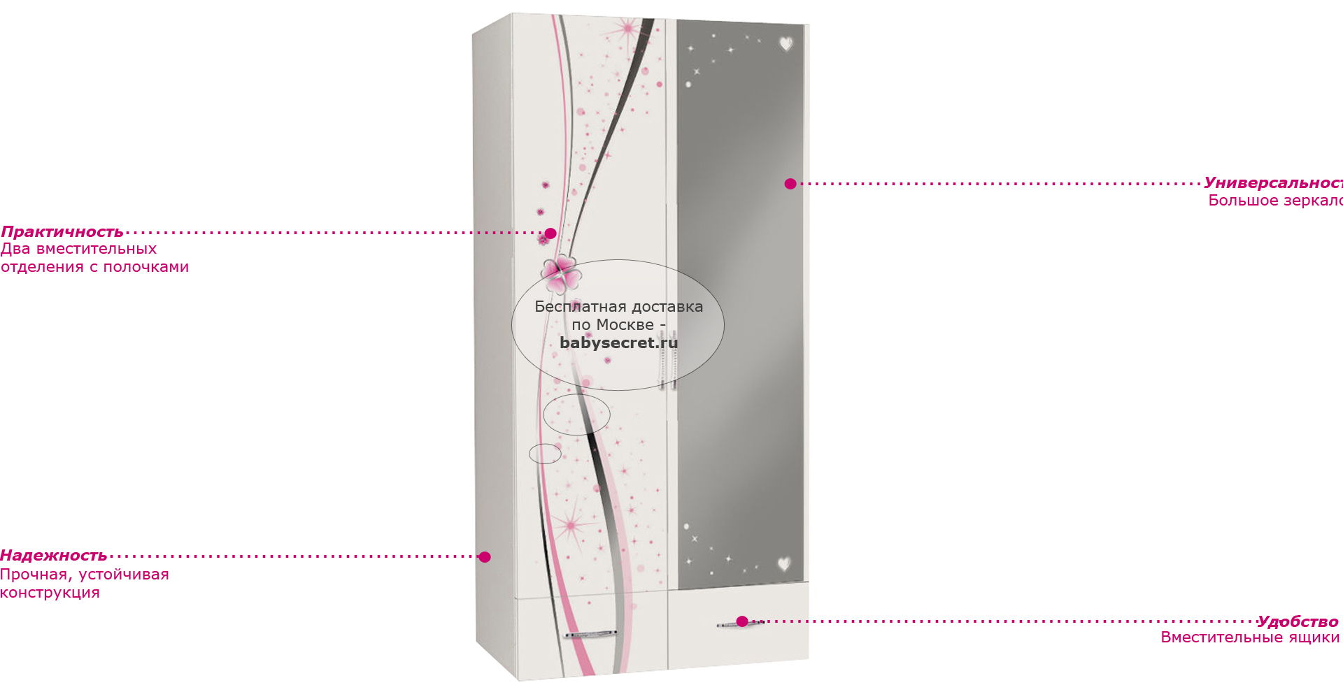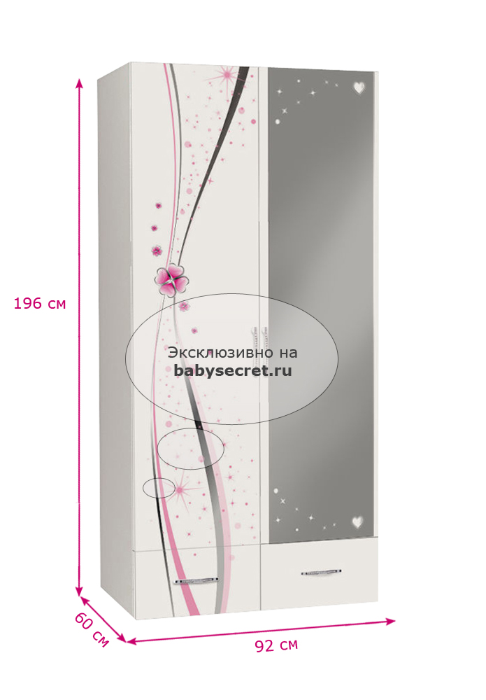 Приятные особенности двустворчатого шкафа Princess с зеркалом: сделан из экологически чистых материалов, безопасных для детей. Основой является ДСП производства Германии, где предъявляются самые строгие требования к качеству. У мебели есть преимущество, которое понравится, как детям, так и взрослым. Детскую мебель можно красиво оформить специальными картинками, которые изготовлены из прочных и долговечных материалов, позволяющих проводить влажную уборку. Картинки, украшающие фасады мебели нарисованы акриловыми красками, которые безвредны для человека, экологически чисты, долго держатся и не выцветают.