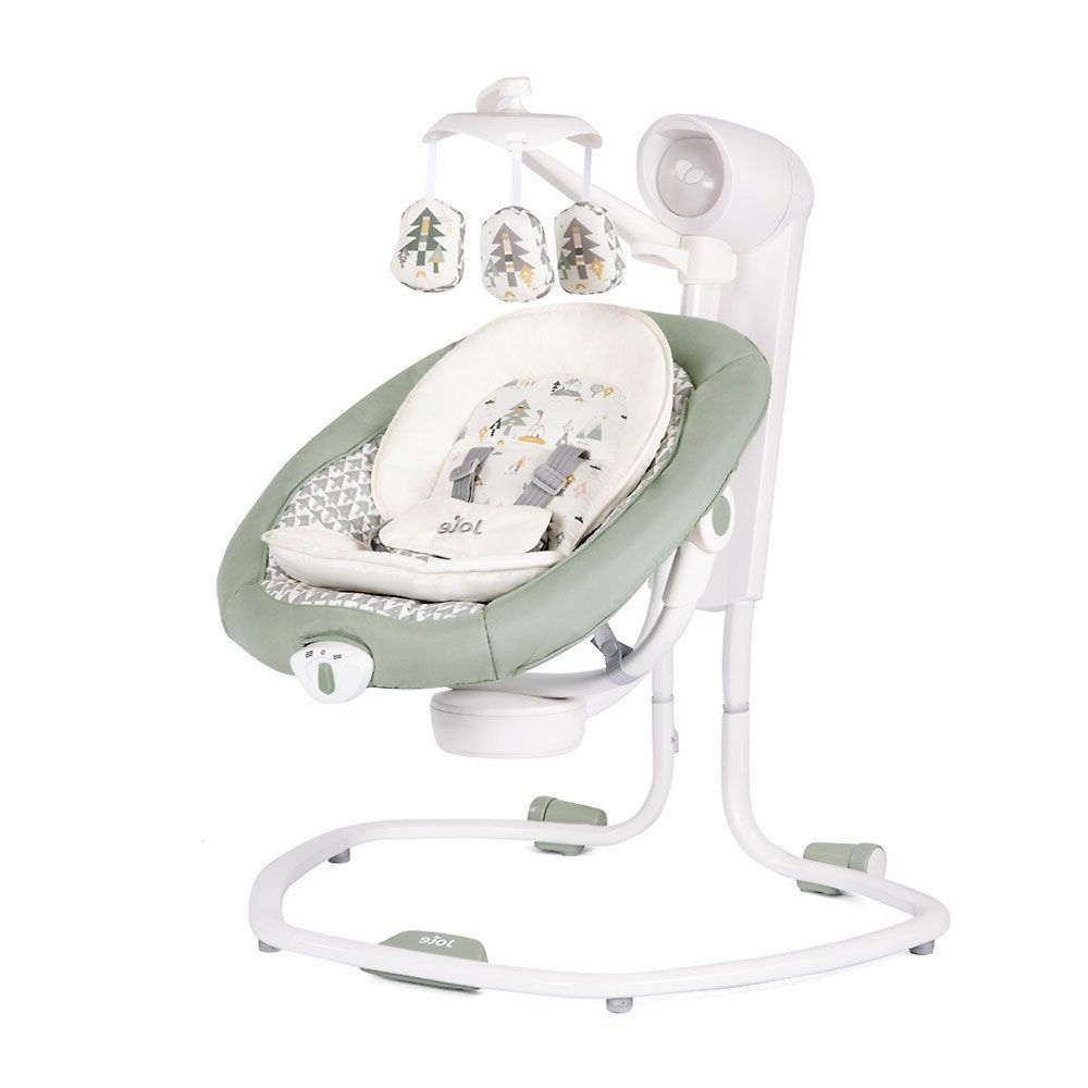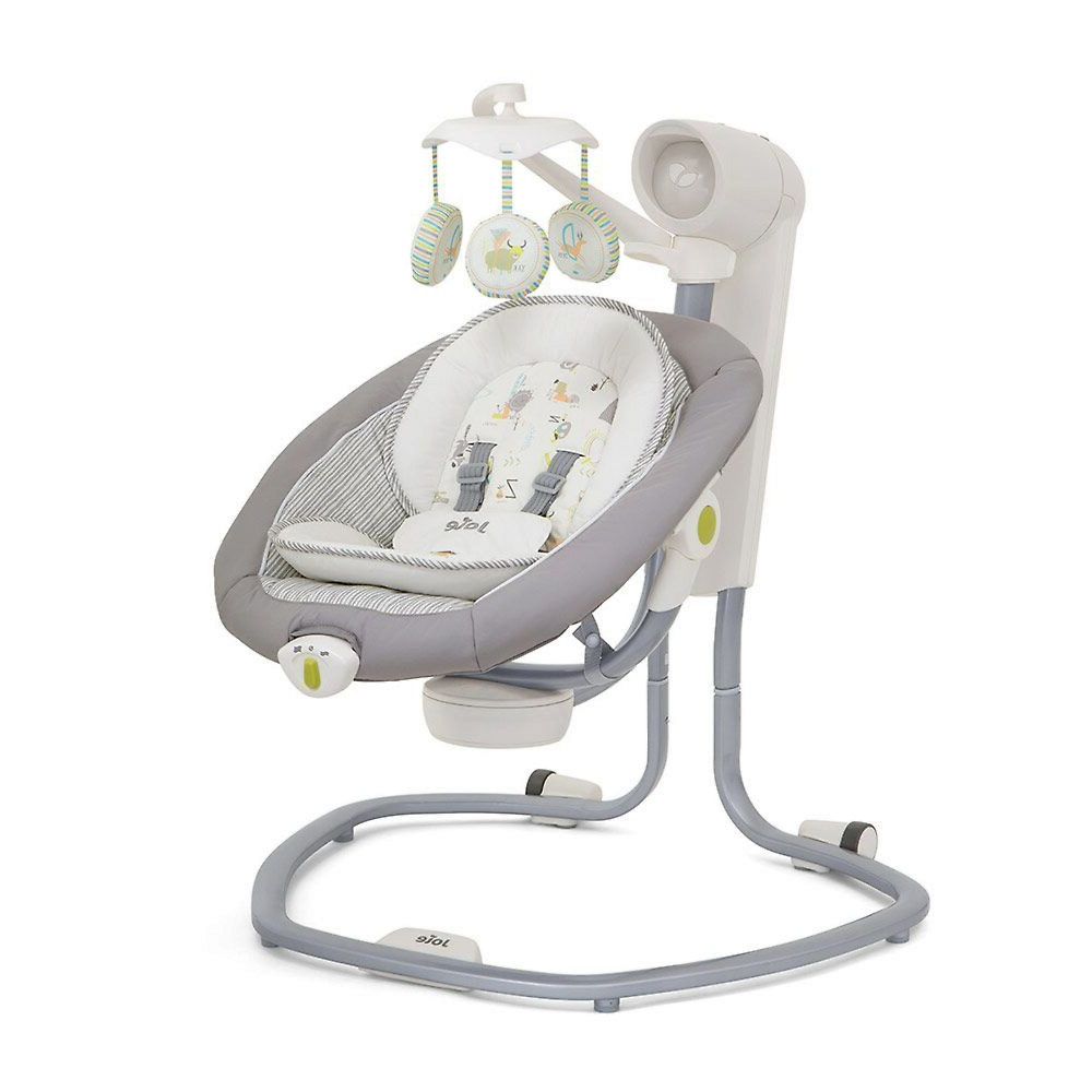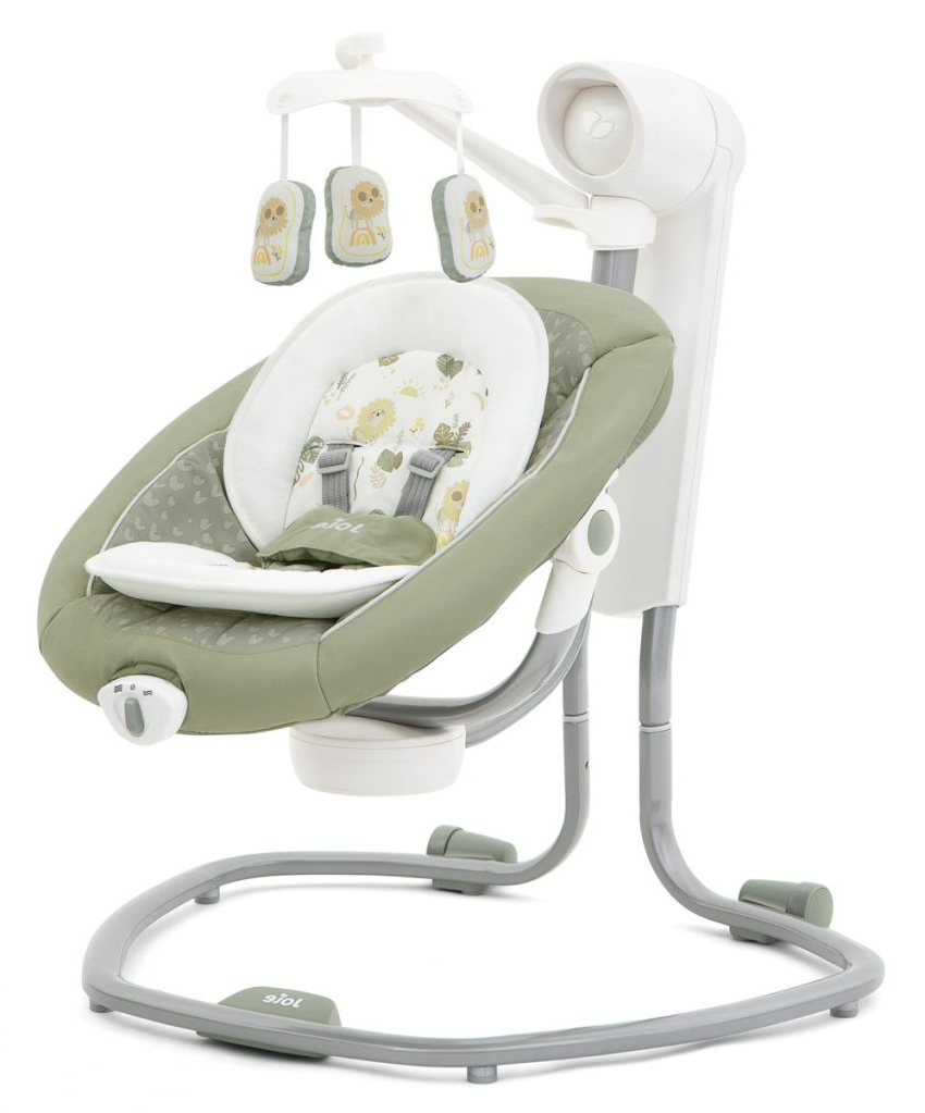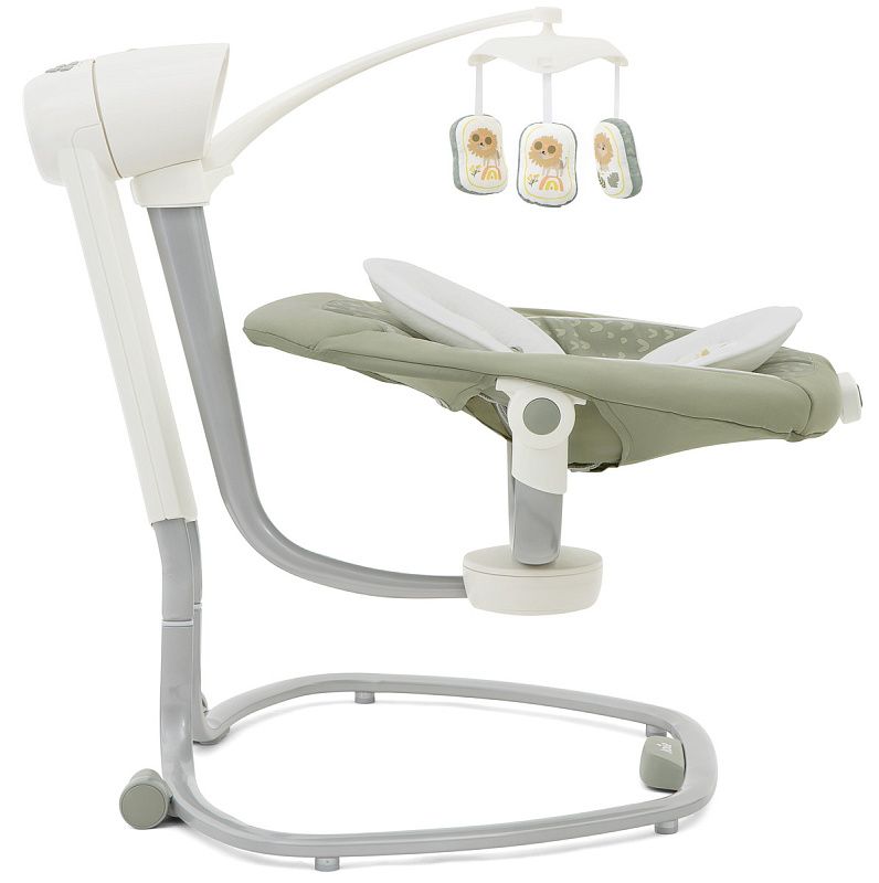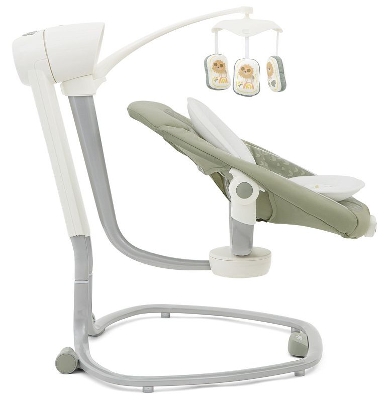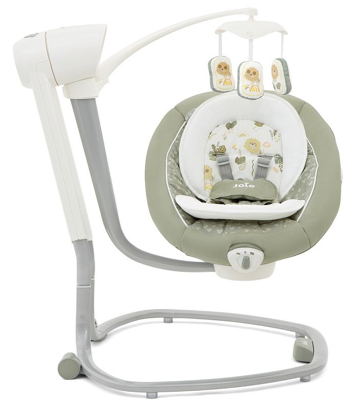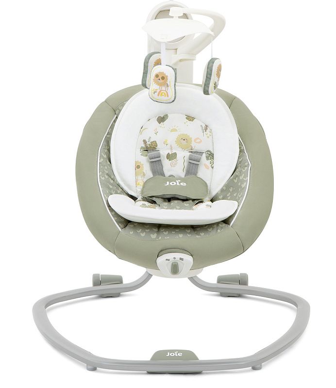 Приятные особенности:Электронные качели Joie Serina Swivel уже завоевали сердца многих родителей.Мягкий и уютный шезлонг имеет анатомическую форму, что очень важно для правильного развития спинки. Чтобы кроха не выпал, ворочаясь во сне или играя, предусмотрены пятиточечные ремни безопасности. Сиденье имеет форму ракушки с закругленными краями, чтобы ребенок не поранился. Вы можете регулировать наклон в 3 различных положениях, включая горизонтальное для сна.Сиденье Joie Serina Swivel устанавливается как боком, так и спиной к основе, от чего зависит траектория его движения (справа налево, или вперед-назад). Для детишек разного возраста предусмотрено 6 скоростей качания и 2 скорости вибрации (для работы вибромодуля нужна батарейка). Для развлечения малыша, а также для развития его визуальных, тактильных и слуховых способностей, над люлькой крепится вращающаяся дуга с игрушками и есть функция музыкального сопровождения (5 колыбельных мелодий и 5 природных композиций).Металлический каркас Joie Serina Swivel легкий и устойчивый. Чтобы качели было удобно перемещать по квартире, есть встроенная ручка и два маленьких колесика в основании.