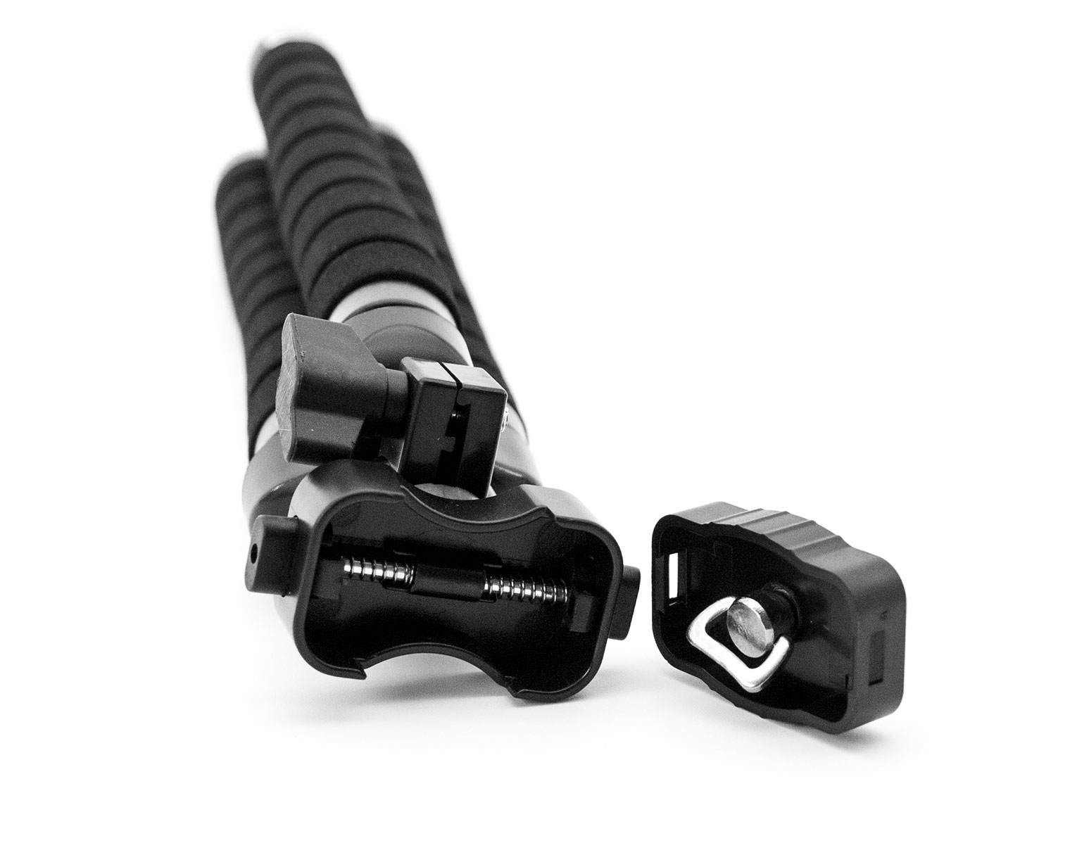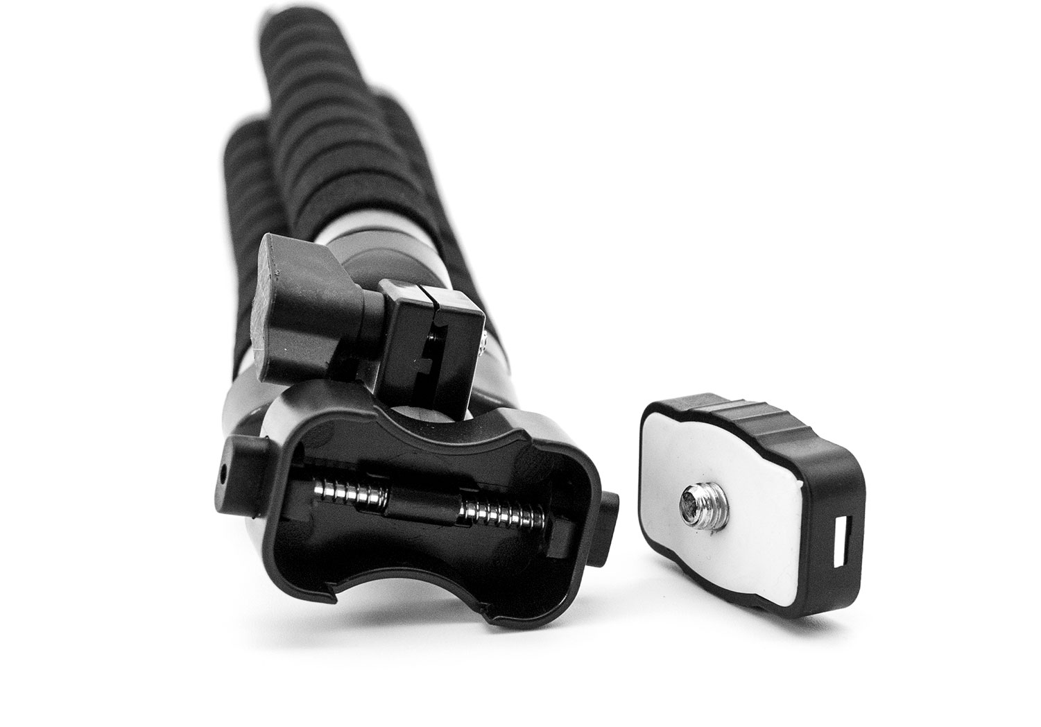 Приятные особенности: Гибкое крепление-трипод (гибкий штатив) Ramili TR001 с винтом 1/4 дюйма и съемным основанием-фиксатором предназначено для размещения камеры или любого другого устройства, оснащенного отверстием/гайкой с резьбой 1/4 дюйма. При помощи этого крепления камеру и другие подходящие устройства можно быстро и надёжно закрепить почти на любом не предназначенном для этого предмете. Например, на элементах мебели, на ветке дерева, на раме или ручке детской коляски.Благодаря удобной конструкции съемного фиксатора треногу можно легко отстегнуть от присоединенного устройства без выкручивания винта простым нажатием на две кнопки по бокам фиксатора площадки. Мягкое и пористое покрытие треноги обеспечивает надежную фиксацию практически с любой поверхностью. Мягкий на ощупь и гибкий штатив-крепление Ramili TR001 изготовлен из высококачественных материалов и обеспечивает надёжную фиксацию. 4 шарнира обеспечивают широкие возможности для точной настройки положения и ракурса зафиксированного на штативе устройства.
