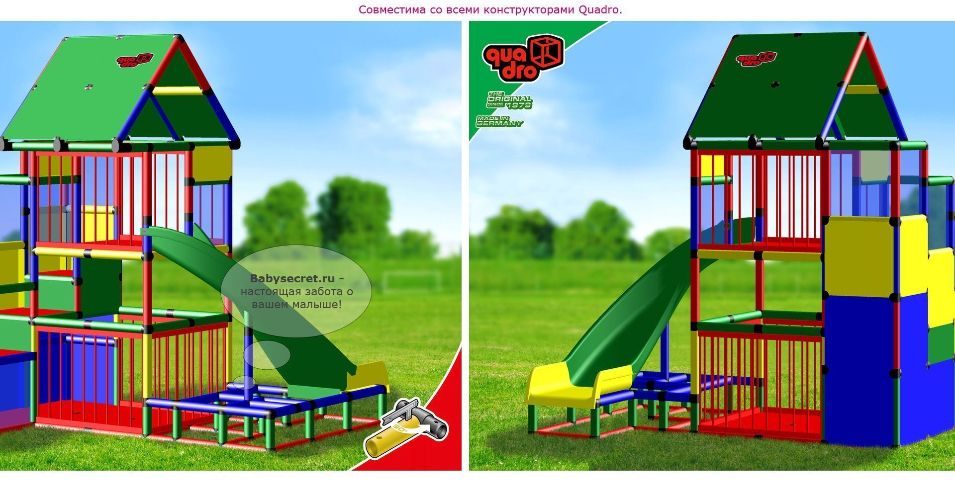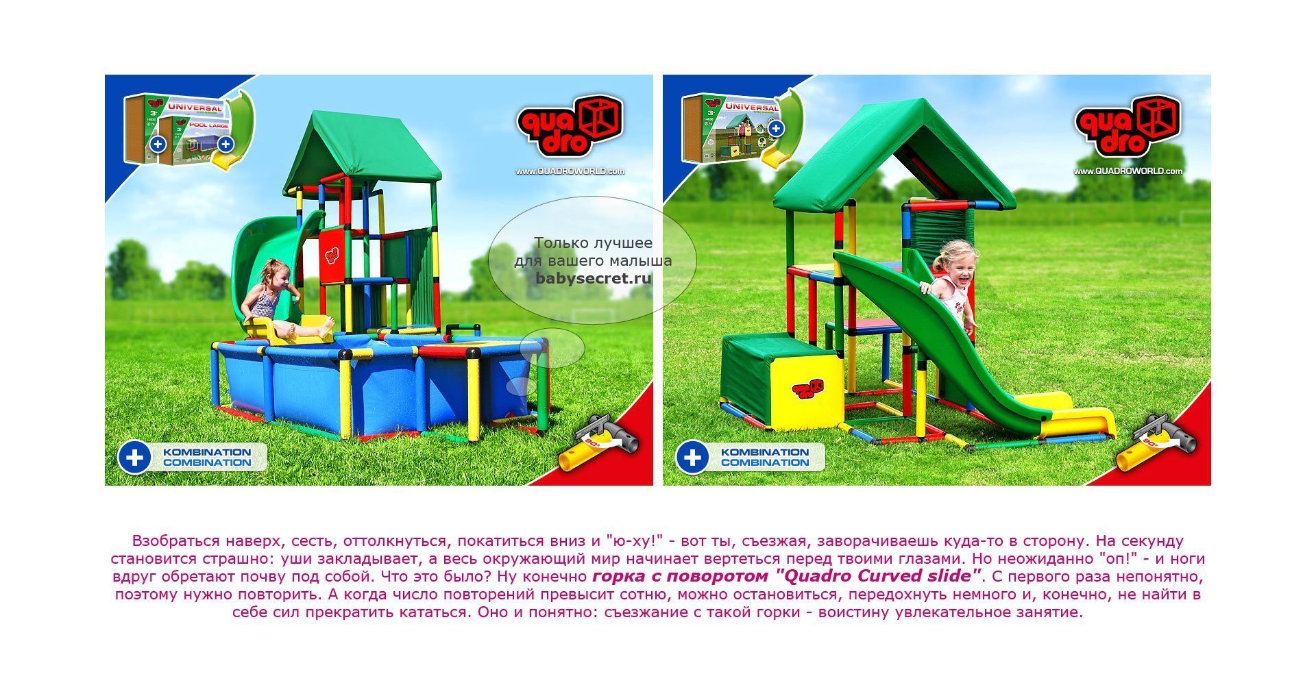Приятные особенности горки с поворотом Quadro 10020:взобраться наверх, сесть, оттолкнуться, покатиться вниз и "ю-ху!" - вот ты, съезжая, заворачиваешь куда-то в сторону. На секунду становится страшно: уши закладывает, а весь окружающий мир начинает вертеться перед твоими глазами. Но неожиданно "оп!" - и ноги вдруг обретают почву под собой. Что это было? Ну конечно горка с поворотом "Quadro Curved slide". С первого раза непонятно, поэтому нужно повторить. А когда число повторений превысит сотню, можно остановиться, передохнуть немного и, конечно, не найти в себе сил прекратить кататься. Оно и понятно: съезжание с такой горки - воистину увлекательное занятие.