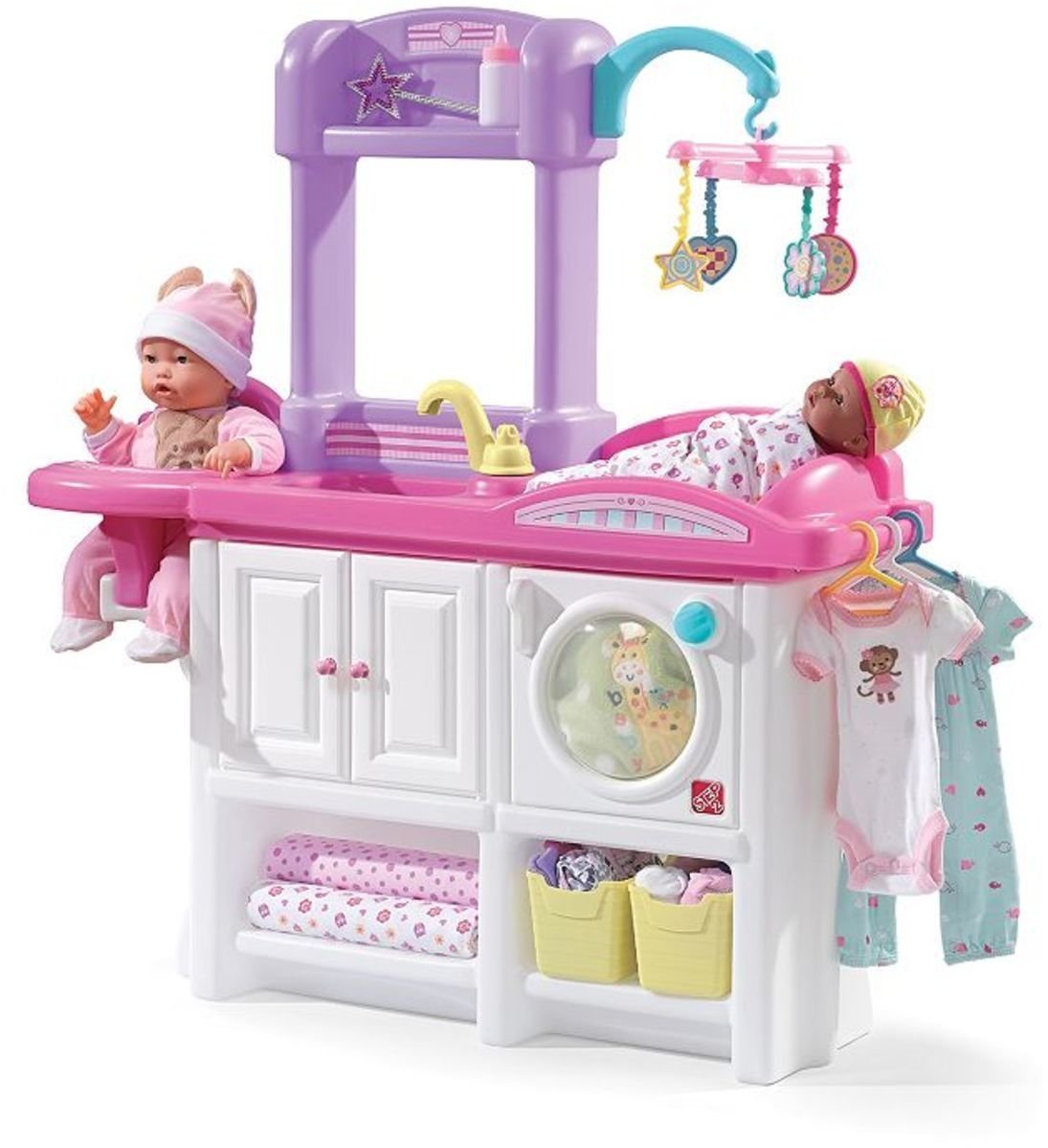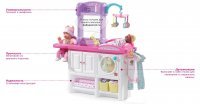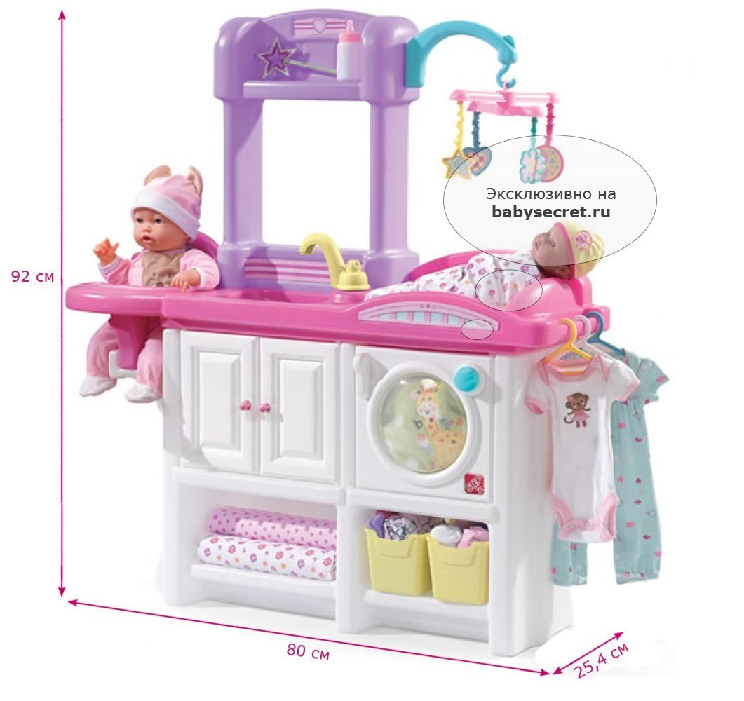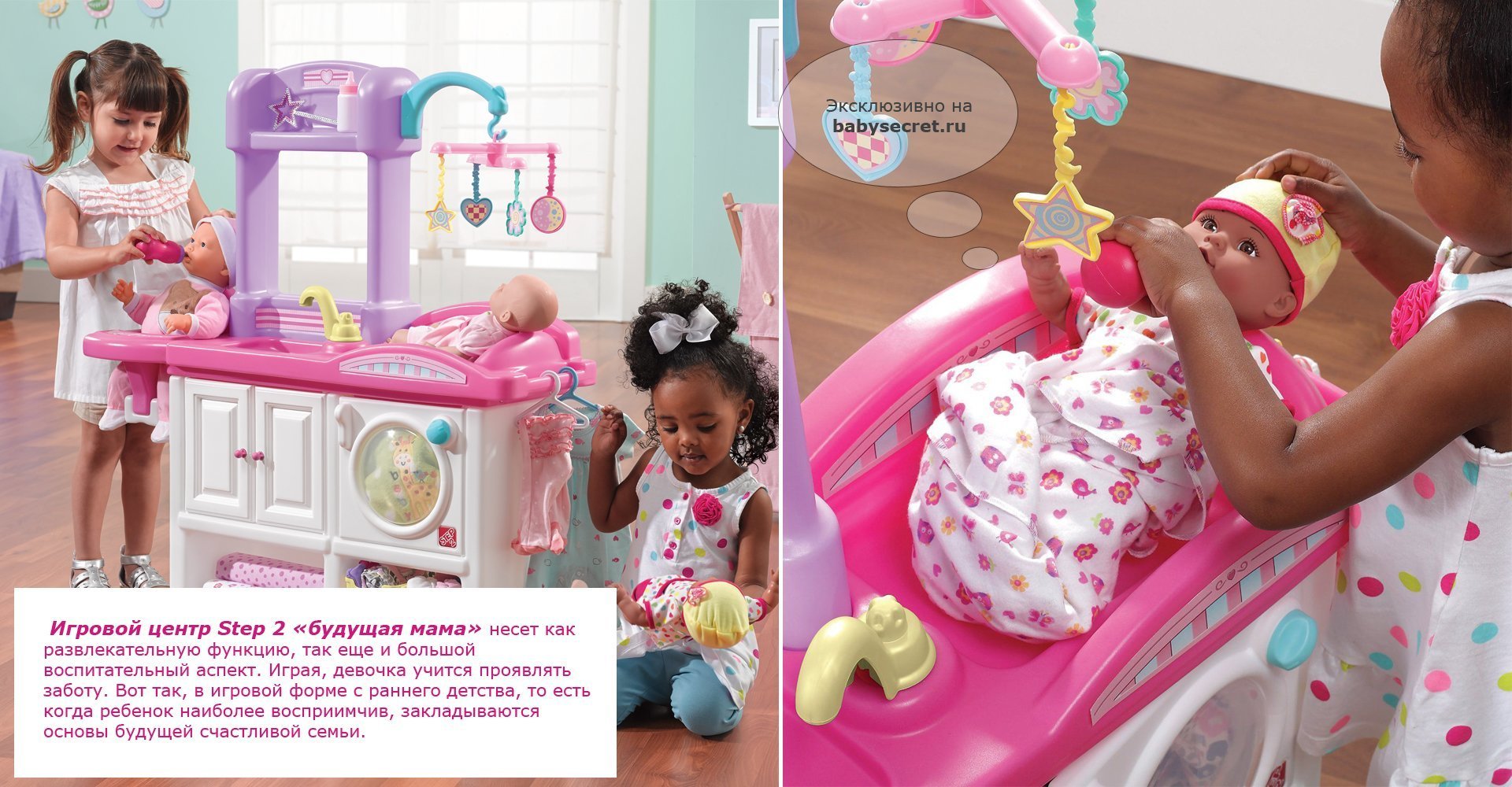Приятные особенности игрового центра Step 2 «будущая мама»: конструкция разработана для игр в куклы: столик для пеленания с подвесными игрушками, место для кормления, раковина с краном, полочка для вещей, и, конечно же, стиральная машина, чтобы будущие мамы проявили любовь и заботу. Центр несет как развлекательную функцию, так еще и большой воспитательный аспект. Играя, девочка учится проявлять заботу. Вот так, в игровой форме с раннего детства, то есть когда ребенок наиболее восприимчив, закладываются основы будущей счастливой семьи. Также, реализуя всевозможные ролевые игры, ваш ребенок развивает фантазию, мышление, привычку и способность творческого подхода к любому делу.