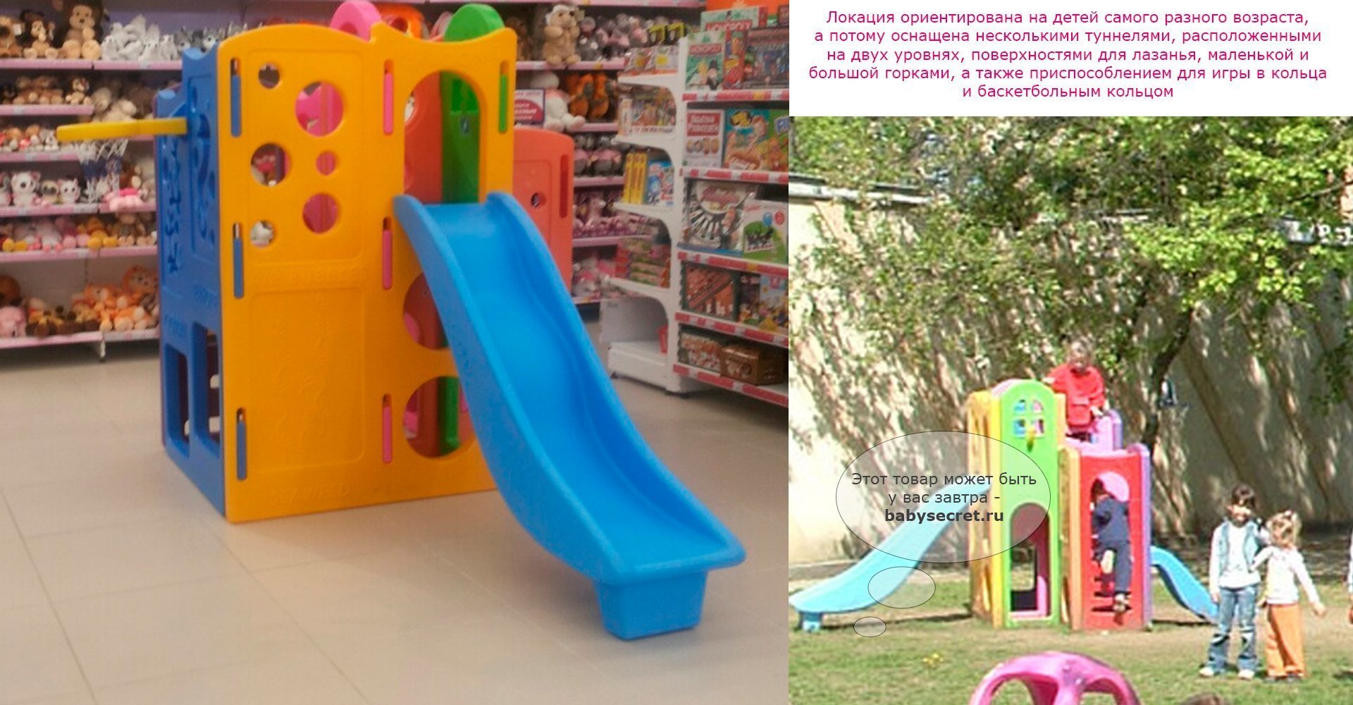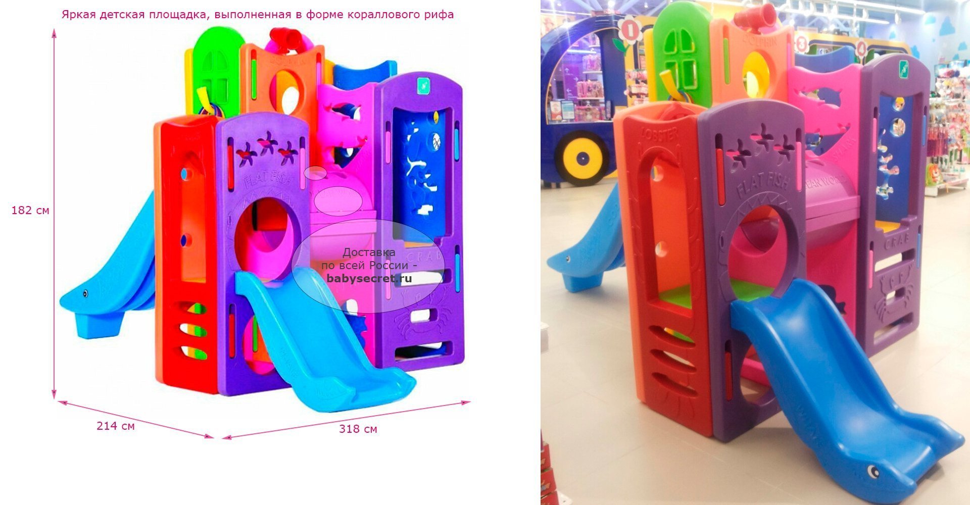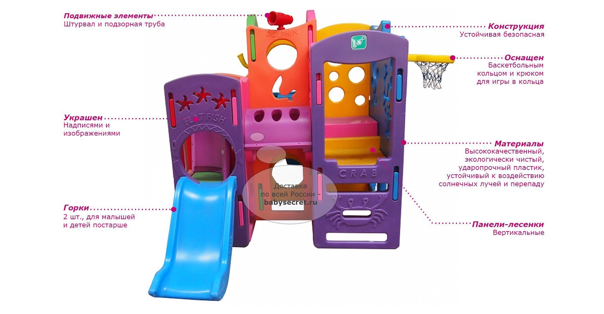 Приятные особенности игрового комплекса Lerado Тайны океана:яркая детская площадка, выполненная в форме кораллового рифа. Локация ориентирована на детей самого разного возраста, а потому оснащена несколькими туннелями, расположенными на двух уровнях, поверхностями для лазанья, маленькой и большой горками, а также приспособлением для игры в кольца и баскетбольным кольцом. При этом на корпусе комплекса изображены обитатели морских глубин, что позволит малышу во время игры изучить морскую фауну, а на верхнем уровне находятся штурвал и подзорная труба. Стоит также отметить, что каждая из горок оканчивается покатым уклоном, который сделает приземление мягким.