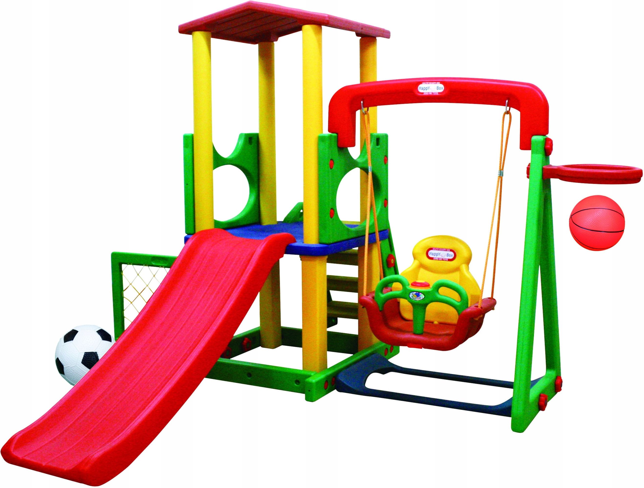 Приятные особенности:Игровой центр Happy Box JM-731BD – предназначен для игр детям от 1,5 лет и старше. Центр легко собирается и разбирается. Его конструкция прочная и надежная. Все материалы выполнены из крепкого пластика, а элементы имеют закругленные кромки, так что малыш будет в полной безопасности. Игровой центр состоит из горки с гладкой поверхностью и округлыми бортами безопасности, качелей с музыкальной панелью. Лесенка надежна и безопасна с нескользящими ступенями. Футбольные ворота и баскетбольное кольцо крепятся с любой стороны конструкции. Площадка на втором уровне снабжена ограничительными бортами безопасности и крышей.