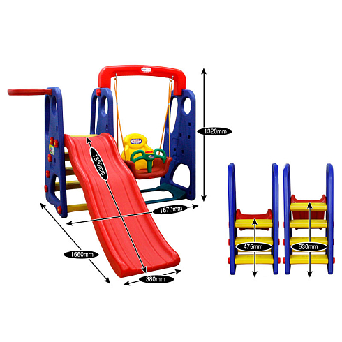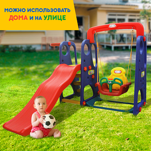 Приятные особенности:Детский игровой комплекс для дома и улицы: детская горка, баскетбольное кольцо с мячом, подвесные качели - это предел мечтаний любого ребенка, можно установить и в доме, и на открытой площадке в любое время года. Он незаменим для любителей подвижных игр и активного отдыха. Катание прекрасно развивает координацию движений, способствует физическому развитию ребёнка. Очень легко собирается, разбирается, прост в уходе и компактен в хранении. Спортивный комплекс красив, безопасен и функционален. Он обеспечивает гармоничное физическое развитие малыша, хорошую координацию движений, меткость и ловкость, расширяет возможности сюжетно-ролевой игры.