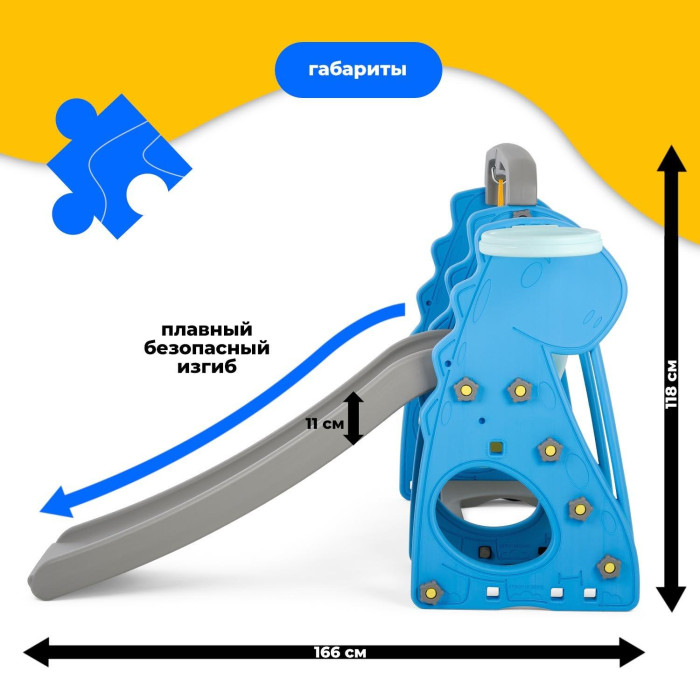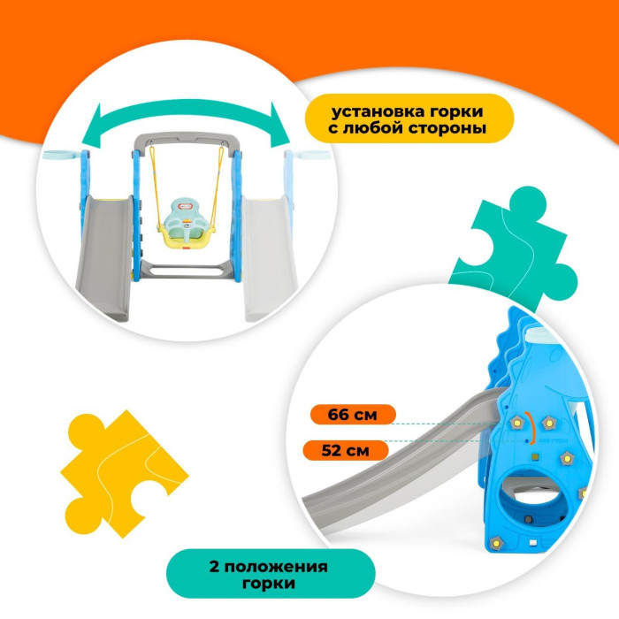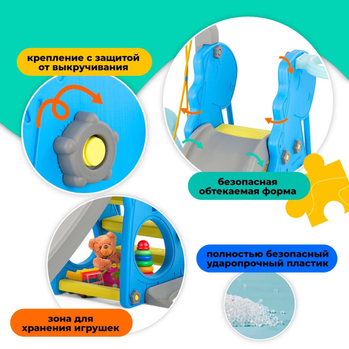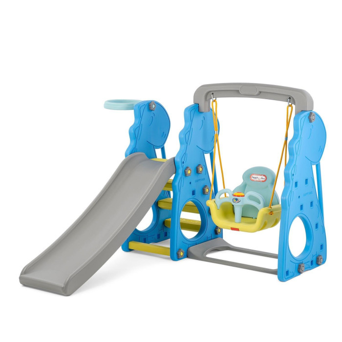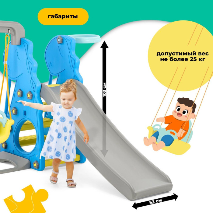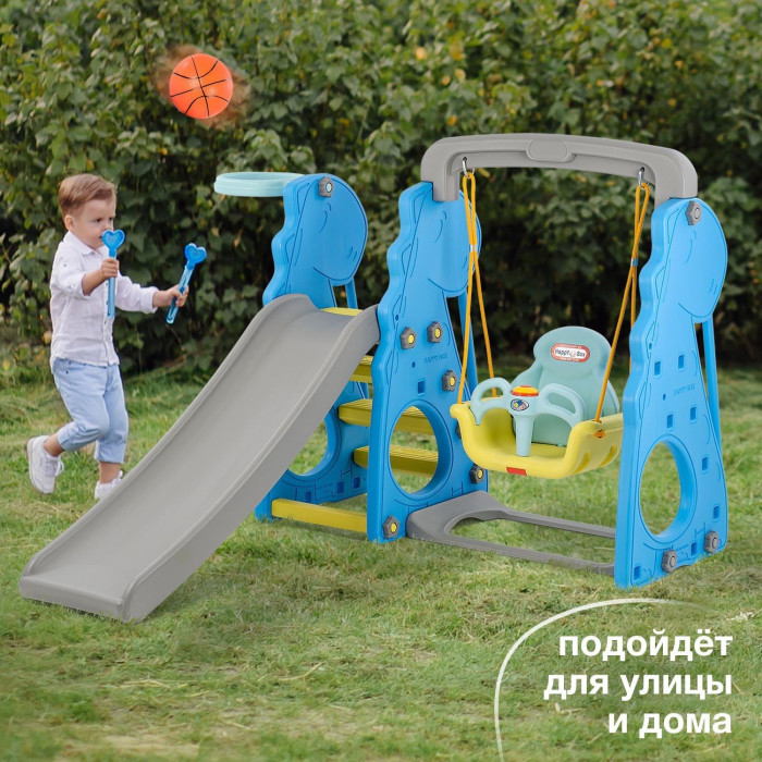 Комплектация:детская горка, качели, баскетбольное кольцо, баскетбольный мяч