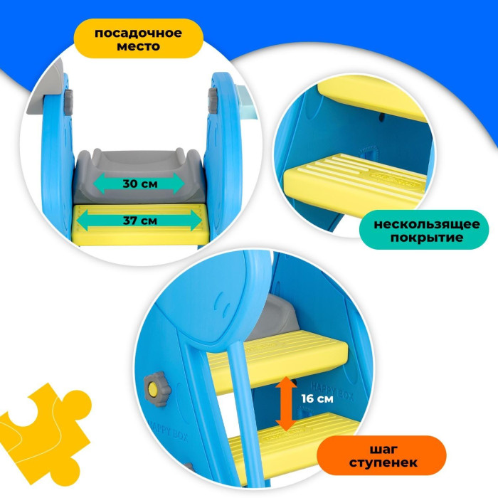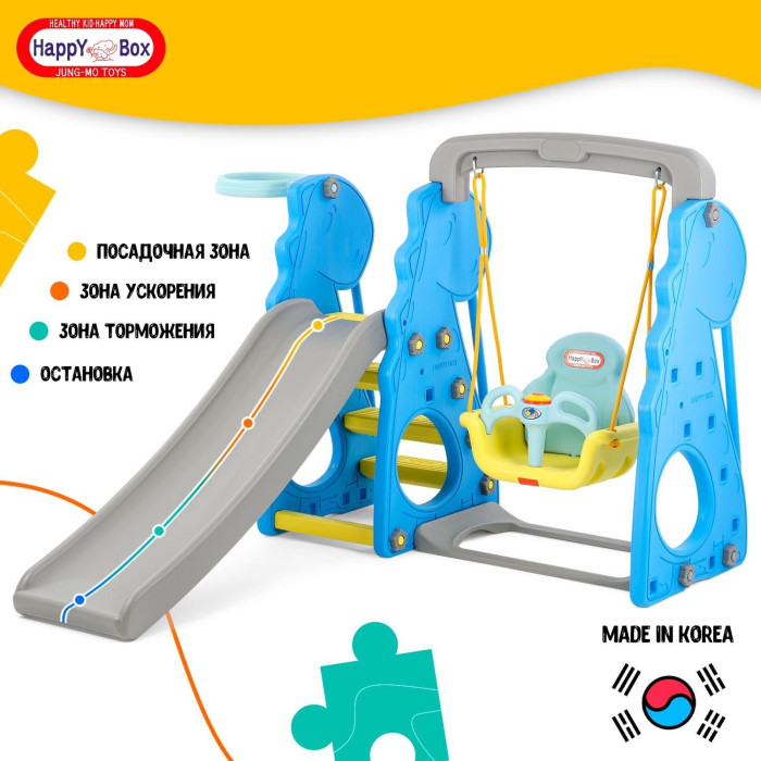 Приятные особенности:Детская игровая горка с качелями Happy Box JM-751D «Dinosaur» это радость в квадрате, ведь на ней малыши могут заниматься двумя самыми любимыми делами: скатываться с горки и качаться на качелях. Оба развлечения служат развитию координации и вестибулярного аппарата и учат ребенка управлять своим телом, но главное — приносят ему море удовольствия. Однако если малышу в игровом комплексе важны развлекательная составляющая и яркий дизайн, то родители в первую очередь озабочены безопасностью.Каждая деталь игрового комплекса разработана и выполнена с заботой о малыше. Сама горка имеет плавный, безопасный изгиб с четырьмя зонами (посадки, ускорения, торможения и остановки) для абсолютной безопасности. Ступеньки — комфортный для малыша шаг (16 см) и нескользящее покрытие. Качели легко, но надежно крепятся к основе прочными веревками с защитой от спутывания. Особого внимая заслуживает посадочное место качелей: удобное и эргономичное, оно снабжено съемной спинкой и бампером и может трансформироваться по мере роста ребенка.