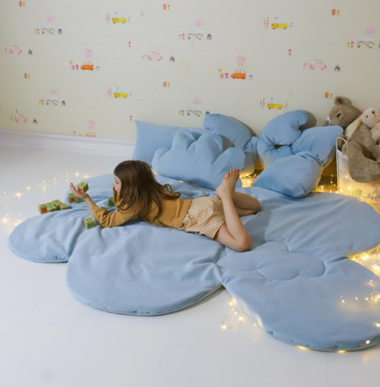 Приятные особенности: Ковер из мебельного кашемира небесно-голубого цвета. В стоимость ковра не входят декоративные подушки, их можно дооформить в разделе декор. Ковер двусторонний с вшитым внутрь синтепоном. Размер 2*1,3 м, толщина 2-3 см .