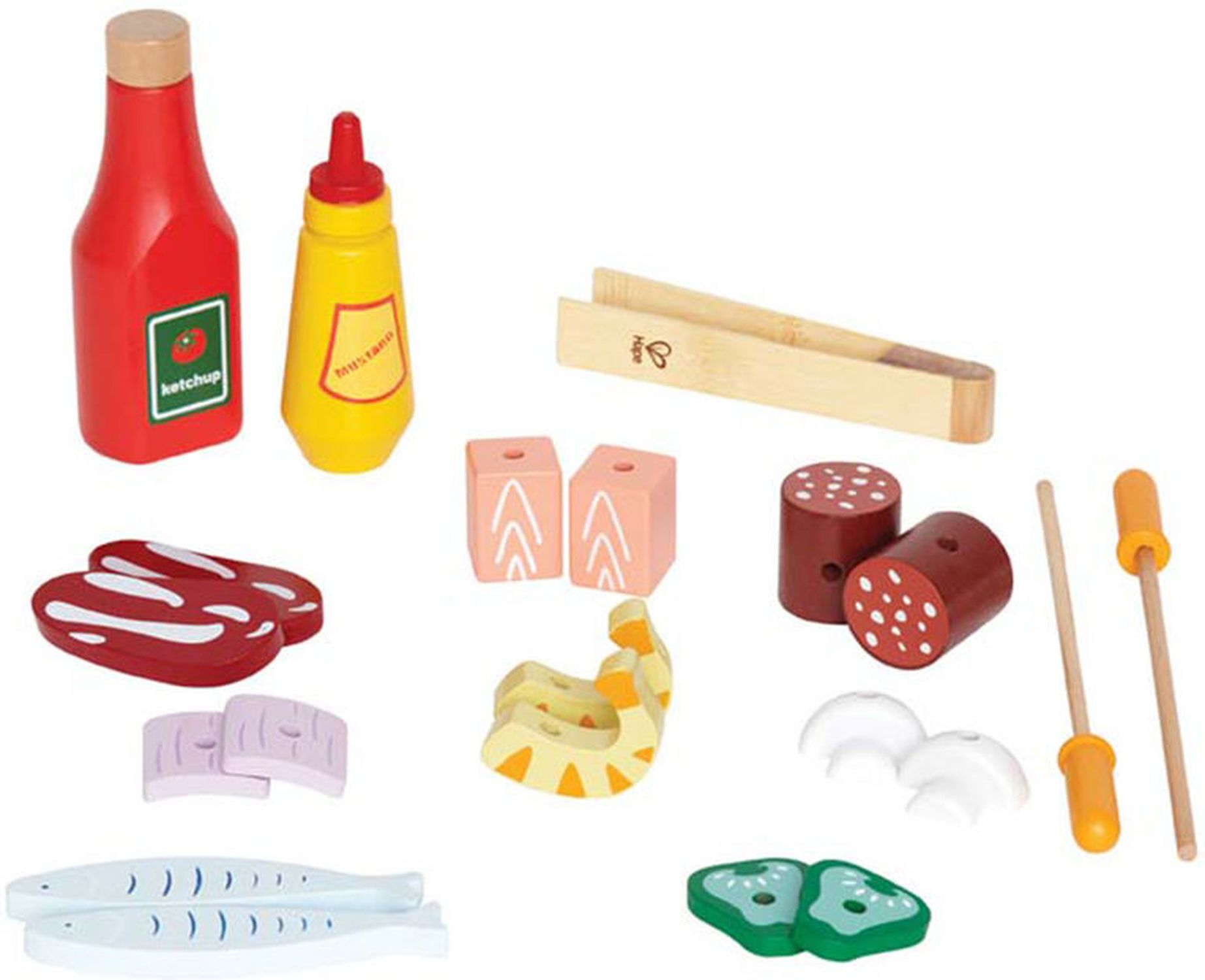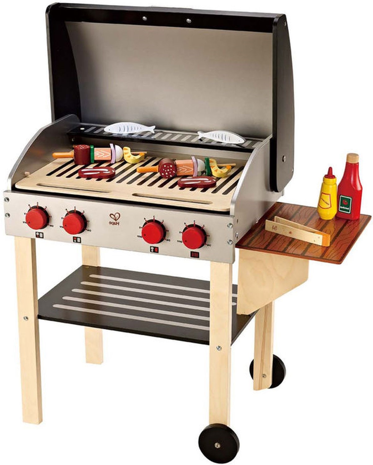 Приятные особенности:Играть в шеф-повара стало еще веселее! Подарите своему начинающему мастеру гриль для барбекю. Набор из 22 предметов: гриль, 2 шампура, 2 рыбы, 2 стейка, 2 креветки, 2 гриба, 2 ломтика болгарского перца, томатный соус и бутылки с горчицей, щипцы. У вашего малыша есть все, чтобы пожарить барбекю на заднем дворе.Игровой набор способствует обучению и взаимодействию между малышами, пробуждает воображение разнообразными игровыми продуктами, посудой и аксессуарами. Ручки издают щелкающие звуки, которые помогают сделать игру еще более реалистичной.