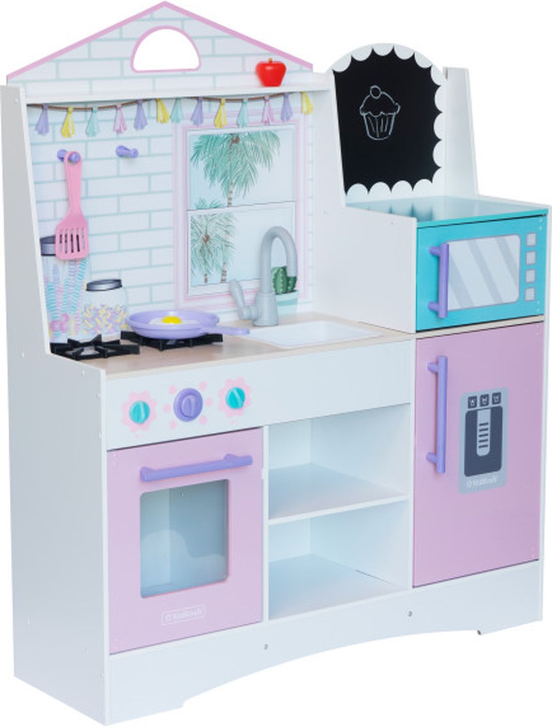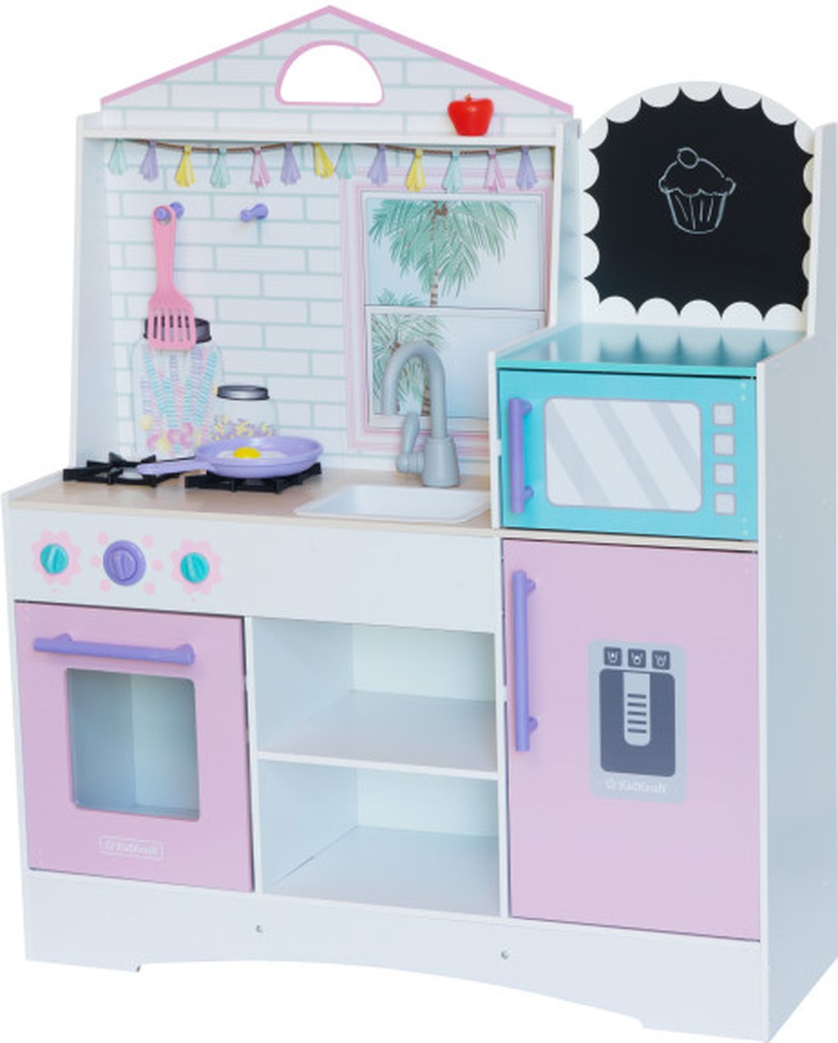 Приятные особенности :Нежный дизайн кухни покорит маленьких поваров. Милый декор в виде кисточек и конфет придает кухня еще больше уюта и реалистичности. Настенная грифельная доска позволяет детям выражать свои творческие способности. Удобные крючки позволяют повесить на них различные аксессуары, а поворотные ручки и забавный смеситель еще больше привлекают детей. Откройте дверцы духовки, микроволновой печи и холодильника, чтобы сделать игру еще более интересной. Сковорода и лопатка и два продукта входят в набор. Две полки под раковиной обеспечивают место для хранения дополнительной посуды и готовых блюд. Веселая графика на микроволновке и холодильнике вдохновит на создание творческих историй.