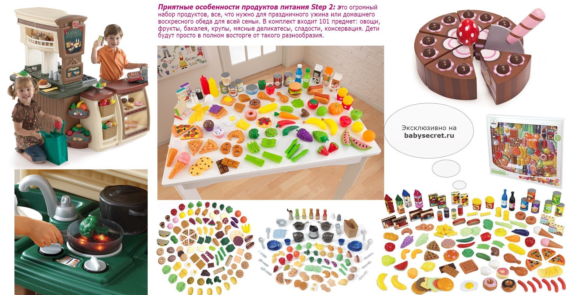 Приятные особенности продуктов питания Step 2: это огромный набор продуктов, все, что нужно для праздничного ужина или домашнего воскресного обеда для всей семьи. В комплект входит 101 предмет: овощи, фрукты, бакалея, крупы, мясные деликатесы, сладости, консервация. Дети будут просто в полном восторге от такого разнообразия.