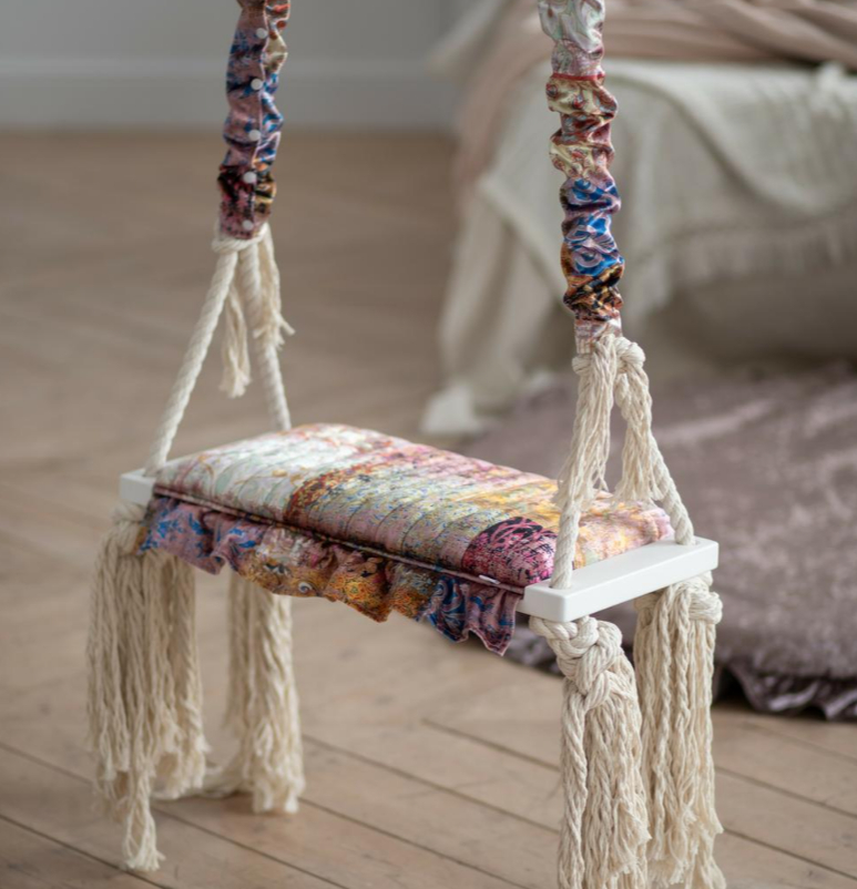 Приятные особенности: расивейшие интерьерные качели Amari велюр пэчворк с мягким сидением и ручками. Мягкая простеганная подушка и накладки на канаты съемные, выполнены из мебельной ткани велюр премиум качества. Ручки и сидение съемное на липах. Канат для качели Х/Б светлого цвета. Каркас сидения массив, экологичная окраска цвет белый . Ширина 60 см, глубина 25 см. Высота регулируется для вашего помещения по запросу.