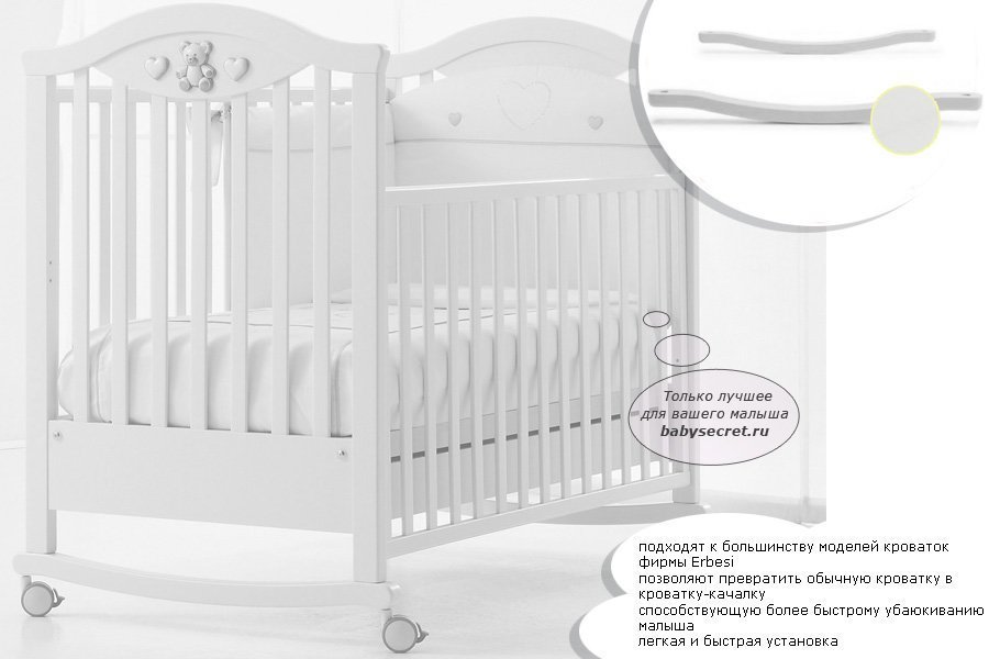 Приятные особенности опции качания для кроваток Erbesi: выполненные из высококачественного МДФ, покрытого нетоксичными лаками и красками, они позволят превратить любую кроватку итальянского производителя Erbesi в кроватку-качалку. Функция качания позволяет быстрее убаюкать и успокоить малыша. С такими опциями процесс укачивания Вашей крохи станет еще более быстрым и легким.