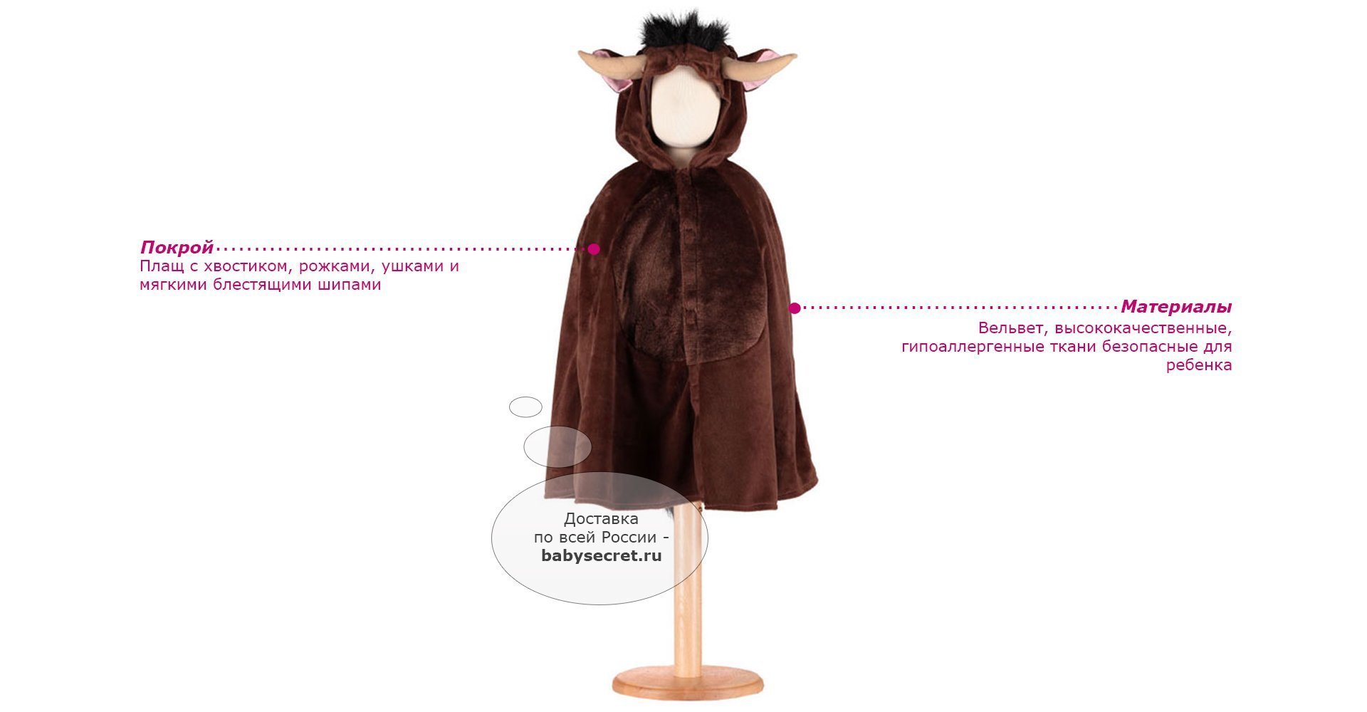 Производитель: Travis Designs (Англия) Основные характеристики: великолепный, праздничный, оригинальный детский карнавальный костюм плащ с хвостиком, рожками, ушками и мягкими блестящими шипами рекомендуется машинная стирка при 40 градусах, деликатный режим Приятные особенности карнавального костюма Travis Designs"Монстр": карнавальный костюм «Монстр» - это плюшевый плащ с хвостиком, рожками, ушками и мягкими блестящими шипами. Размеры 1,5-2 года: рост 86-92 см обхват груди 51-53 см талия 49-51 см Размеры 2-3 года: рост 92-98 см обхват груди 53-55 см талия 51-53 см Размеры 3-5 года: рост 98-110 см обхват груди 55-59 см талия 53-56 см Размеры 6-8 лет: рост 116-128 см обхват груди 61-67 см талия 58-60 см Артикул: MON