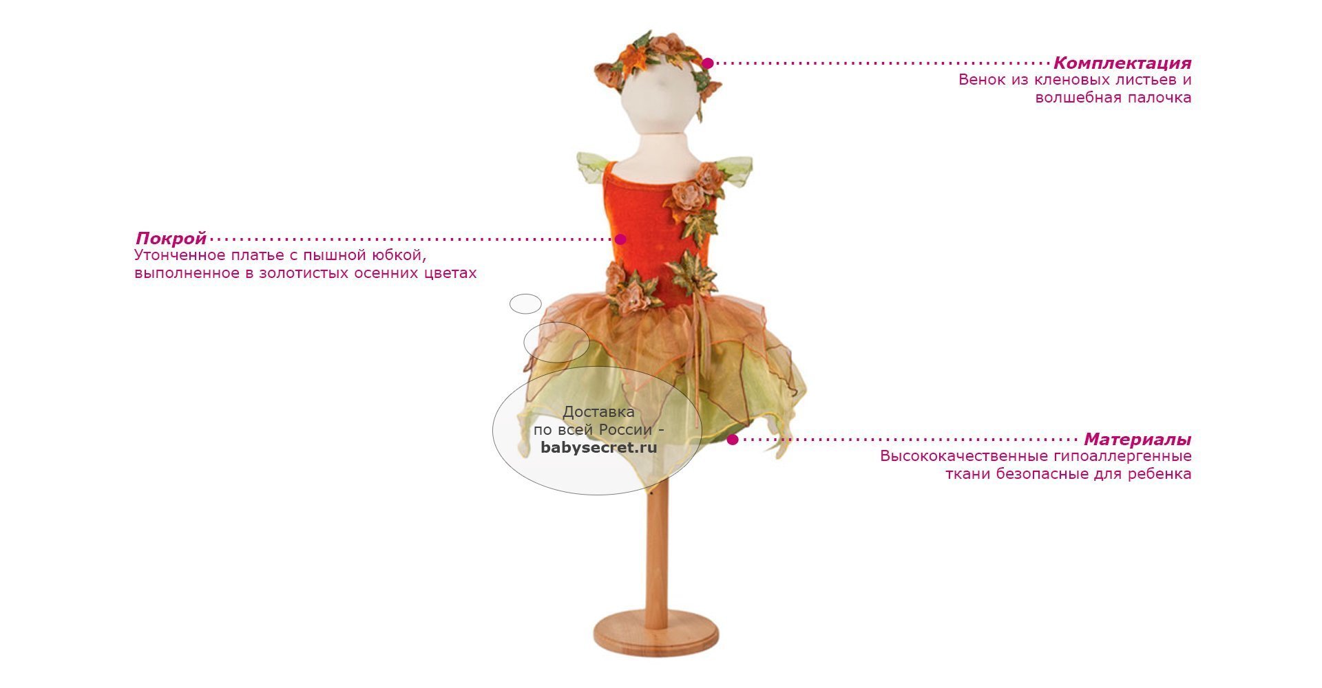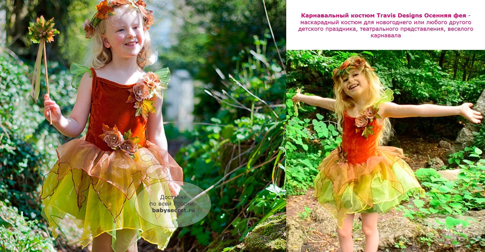 Производитель: Travis Designs (Англия) Основные характеристики: детский карнавальный костюм Осенняя фея утонченное платье с пышной юбкой, выполненное в золотистых осенних цветах рекомендуется машинная стирка при 40 градусах, деликатный режим Приятные особенности карнавального костюма Travis Designs Осенняя Фея: маскарадный костюм для новогоднего или любого другого детского праздника, театрального представления, веселого карнавала. Костюм отличает качественный материал, аккуратный пошив. Яркий детский карнавальный костюм Осенняя фея позволит вашей малышке быть самой красивой девочкой на детском утреннике, бал-маскараде или карнавале. В комплекте: венок из кленовых листьев и волшебная палочка Размеры 3-5 лет: рост 98-110 см обхват груди 55-59 см талия 53-56 см Размеры 6-8 лет: рост 116-128 см обхват груди 61-67 см талия 58-60 см Артикул: AUF3 (3-5 лет) Артикул: AUF6 (6-8 лет)