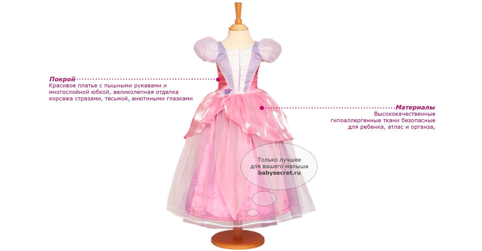 Производитель: Travis Designs (Англия) Основные характеристики: яркий детский карнавальный костюм для девочки красивое платье с пышными рукавами и многослойной юбкой, великолепная отделка корсажа стразами, тесьмой, анютиными глазками рекомендуется машинная стирка при 40 градусах, деликатный режим Приятные особенности карнавального костюма для девочки Travis Designs Принцесса Панси: удивительно красивое розовое платье для новогоднего или любого другого детского праздника, театрального представления, веселого карнавала. Платье отличает качественный материал, аккуратный пошив. Размеры 3-5 лет: рост 98-110 см обхват груди 55-59 см талия 53-56 см Размеры 6-8 лет: рост 116-128 см обхват груди 61-67 см талия 58-60 см Артикул: PRP3 (3-5 лет) Артикул: PRP6 (6-8 лет)