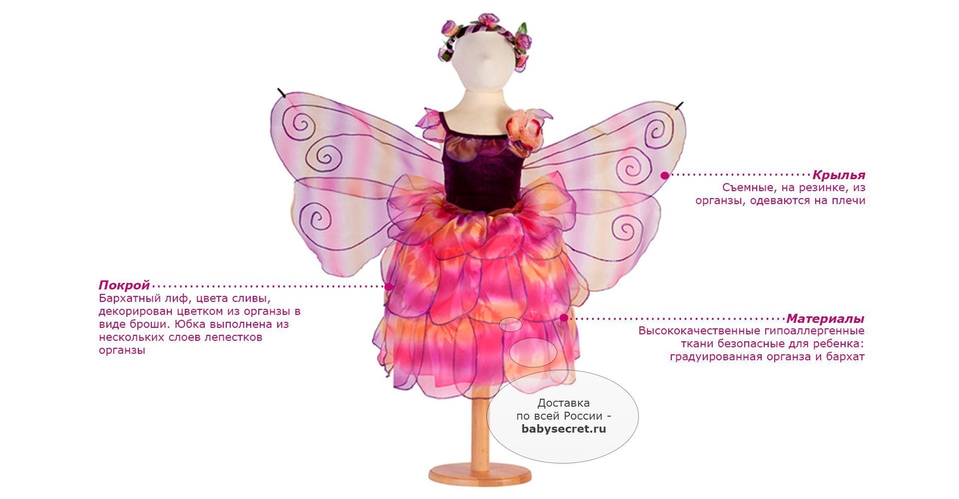 Производитель: Travis Designs (Англия) Основные характеристики: красивый карнавальный костюм для девочки бархатный лиф, цвета сливы, декорирован цветком из органзы в виде броши юбка выполнена из нескольких слоев лепестков органзы съемные крылья, на резинке, из органзы, одеваются на плечи рекомендуется машинная стирка при 40 градусах, деликатный режим Приятные особенности карнавального костюма для девочки Travis Designs Аметистовая мечта :маскарадный костюм для новогоднего или любого другого детского праздника, театрального представления, веселого карнавала. Костюм отличает качественный материал, аккуратный пошив. В чудесном костюме сразу вспоминается о лете. Костюм Аметистовая мечта для девочки идеально подойдет для костюмированного праздника. В комплекте: карнавальный костюм съемные крылышки повязка на голову Размеры 3-5 лет: рост 98-110 см обхват груди 55-59 см талия 53-56 см Размеры 6-8 лет: рост 116-128 см обхват груди 61-67 см талия 58-60 см Размеры 9-11 лет: рост 134-146 см обхват груди 67-76 см талия 61-66 см Артикул: AMD3 (3-5 лет) Артикул: AMD6 (6-8 лет) Артикул: AMD9 (9-11 лет)
