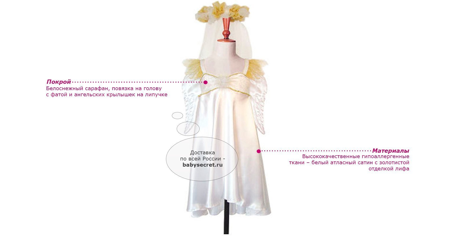 Производитель: Travis Designs (Англия) Основные характеристики: яркий детский карнавальный костюм Ангел белоснежный сарафан, повязка на голову с фатой и ангельских крылышек на липучке рекомендуется машинная стирка при 40 градусах, деликатный режим Приятные особенности карнавального костюма для девочки Travis Designs Ангел: если ваша дочурка любит волшебство и мечтает хоть на минутку превратиться в прекрасного Ангела, этот шикарный карнавальный костюм поможет вам сделать ребенку поистине сказочный подарок! Веселое настроение и масса положительных эмоций будут обеспечены! Яркий детский карнавальный костюм Ангел позволит вашей малышке быть самой красивой девочкой на детском утреннике, бале-маскараде или карнавале. Размеры 3-5 лет: рост 98-110 см обхват груди 55-59 см талия 53-56 см Артикул: ANH3 (3-5 лет)