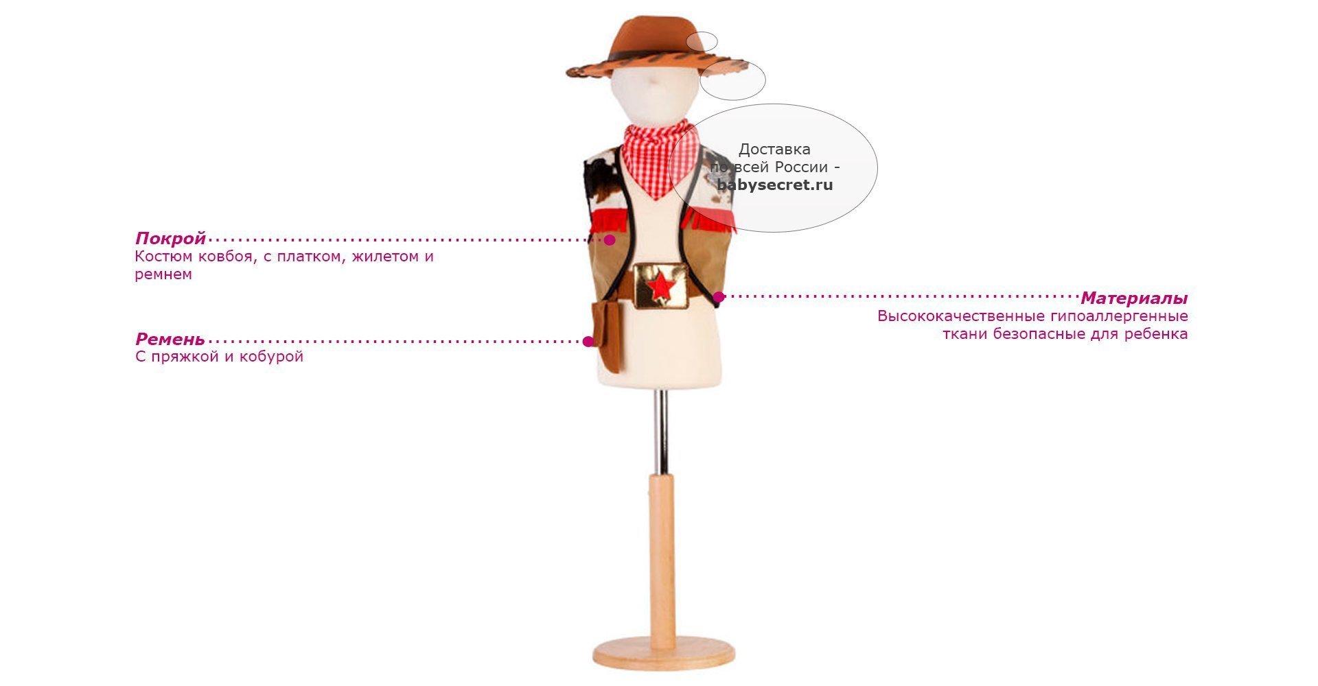 Основные характеристики: праздничный, оригинальный детский карнавальный костюм костюм ковбоя, с платком, жилетом и ремнем ремень с пряжкой и кобурой рекомендуется машинная стирка при 40 градусах, деликатный режим Приятные особенности карнавального костюма для мальчика Travis Designs "Ковбой": вашему ребенку нужен новогодний костюм? Вы решили устроить костюмированный новогодний вечер дома? Новый год – самое время для забавных и бесшабашных затей. Новогодний карнавальный (маскарадный) костюм Ковбоя поможет создать атмосферу праздника и сделать любую Ёлку по-настоящему веселой. Карнавальный костюм Travis Designs Ковбой - лучший наряд на праздник. Отлично подойдёт в подарок ребёнку. Наверняка к тем, кто придет на новогодний утренник в костюме Ковбоя, будет проявлено максимум внимания. У ребенка появится шанс выиграть приз за лучший маскарадный костюм. Размеры 6-8 лет: рост 116-128 см обхват груди 61-67 см талия 58-60 см Артикул: CWST6 (6-8 лет)
