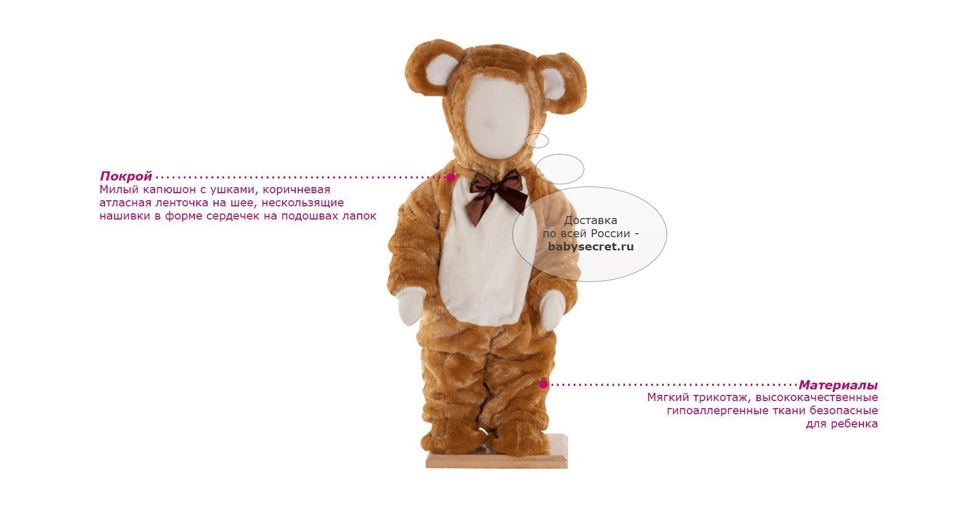 Производитель: Travis Designs (Англия) Основные характеристики: великолепный, праздничный, оригинальный детский карнавальный костюм милый капюшон с ушками, коричневая атласная ленточка на шее, нескользящие нашивки в форме сердечек на подошвах лапок рекомендуется машинная стирка при 40 градусах, деликатный режим Приятные особенности карнавального костюма Travis Designs Медвежонок:вашему ребенку нужен новогодний костюм? Вы решили устроить костюмированный новогодний вечер дома? Новый год – самое время для забавных и бесшабашных затей. Новогодний карнавальный (маскарадный) костюм Медвежонока поможет создать атмосферу праздника и сделать любую Ёлку по-настоящему веселой. Карнавальный костюм Travis Designs Медвежонок - лучший наряд на праздник. Отлично подойдёт в подарок ребёнку. Размеры 3-6 мес: рост 64-72 см вес 6-8 кг Размеры 6-12 мес: рост 72-80 см вес 8-10 кг Размеры 12-18 мес: рост 80-86 см вес 9-12 кг Размеры 1,5-2 года: рост 86-92 см Размеры 2-3 года: рост 92-98 см Артикул: TEB03 (3-6 мес) Артикул: TEB06 (6-12 мес) Артикул: TEB012 (12-18 мес) Артикул: TEB1 (1,5-2года) Артикул: TEB2(2-3 года)