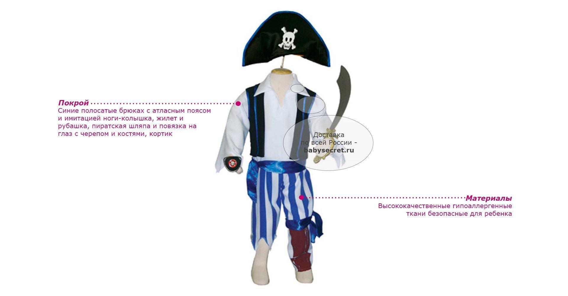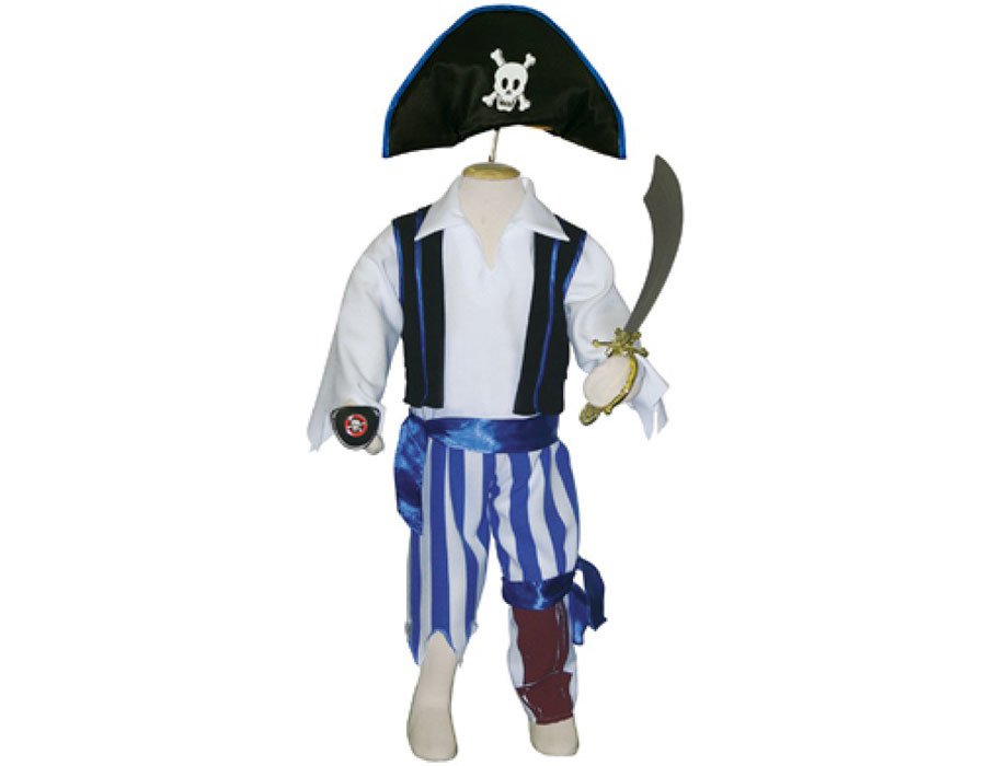 Основные характеристики: праздничный, оригинальный детский карнавальный костюм синие полосатые брюках с атласным поясом и имитацией ноги-колышка, жилет и рубашка, пиратская шляпа и повязка на глаз с черепом и костями, кортик рекомендуется машинная стирка при 40 градусах, деликатный режим Приятные особенности карнавального костюма для мальчика Travis Designs Одноногий пират:вашему ребенку нужен новогодний костюм? Вы решили устроить костюмированный новогодний вечер? Новый год – самое время для забавных и бесшабашных затей. Новогодний карнавальный (маскарадный) костюм Одноногого пирата поможет создать атмосферу праздника и сделать любую Ёлку по-настоящему веселой. Карнавальный костюм Travis Designs Одноногий пират - лучший наряд на праздник. Отлично подойдёт в подарок ребёнку. Наверняка к тем, кто придет на новогодний утренник в костюме пирата, будет проявлено максимум внимания. У ребенка появится шанс выиграть приз за лучший маскарадный костюм. Размеры 3-5 лет: рост 98-110 см обхват груди 55-59 см талия 53-56 см Размеры 6-8 лет: рост 116-128 см обхват груди 61-67 см талия 58-60 см Артикул: P3 (3-5 лет) Артикул: P6 (6-8 лет)