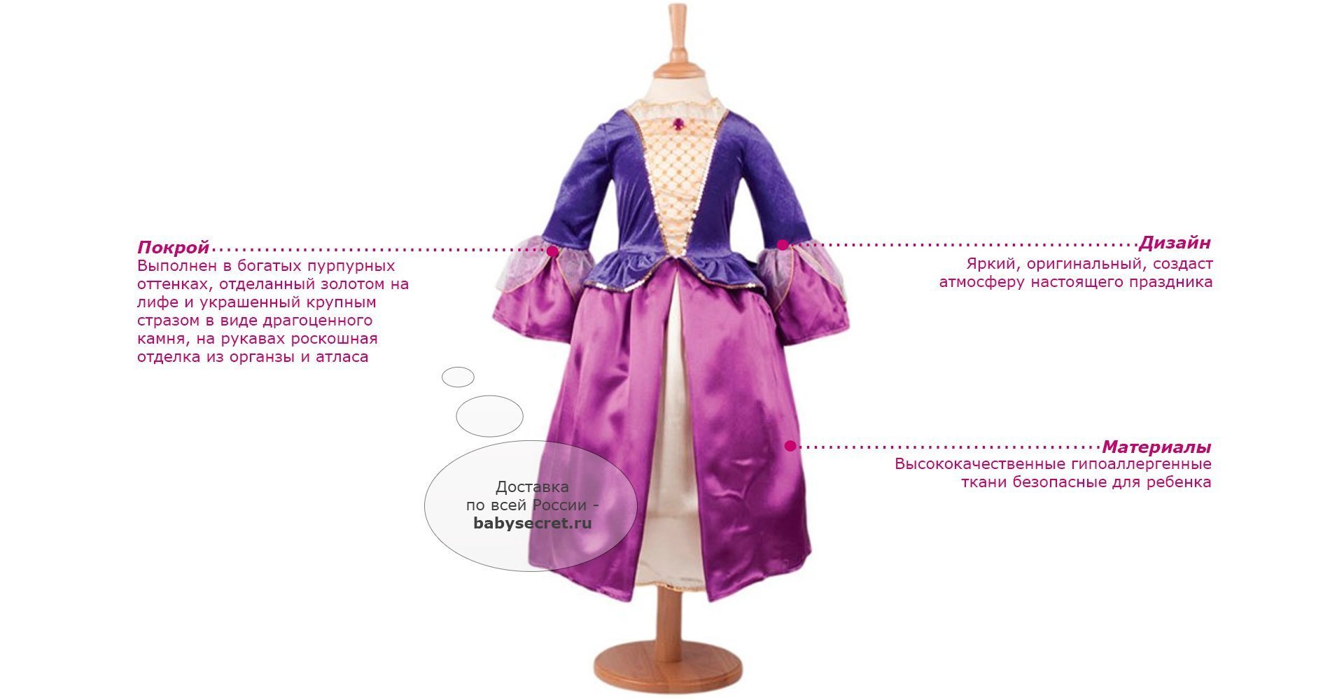 Производитель: Travis Designs (Англия) Основные характеристики: яркий детский карнавальный костюм выполнен в богатых пурпурных оттенках, отделанный золотом на лифе и украшенный крупным стразом в виде драгоценного камня, на рукавах роскошная отделка из органзы и атласа рекомендуется машинная стирка при 40 градусах, деликатный режим Приятные особенности карнавального костюма для девочки Travis Designs ʺПринцессаʺ : маскарадный костюм для новогоднего или любого другого детского праздника, театрального представления, веселого карнавала. Костюм отличает качественный материал, аккуратный пошив. Веселое настроение и масса положительных эмоций будут обеспечены! Яркий детский карнавальный костюм ʺПринцессаʺ позволит вашей малышке быть самой красивой девочкой на детском утреннике, бале-маскараде или карнавале. Размеры3-5 лет: рост 98-110 см обхват груди 55-59 см талия 53-56 см Размеры 6-8 лет: рост 116-128 см обхват груди 61-67 см талия 58-60 см Артикул: RGPR3 (3-5 лет) RGPR6 (6-8 лет)