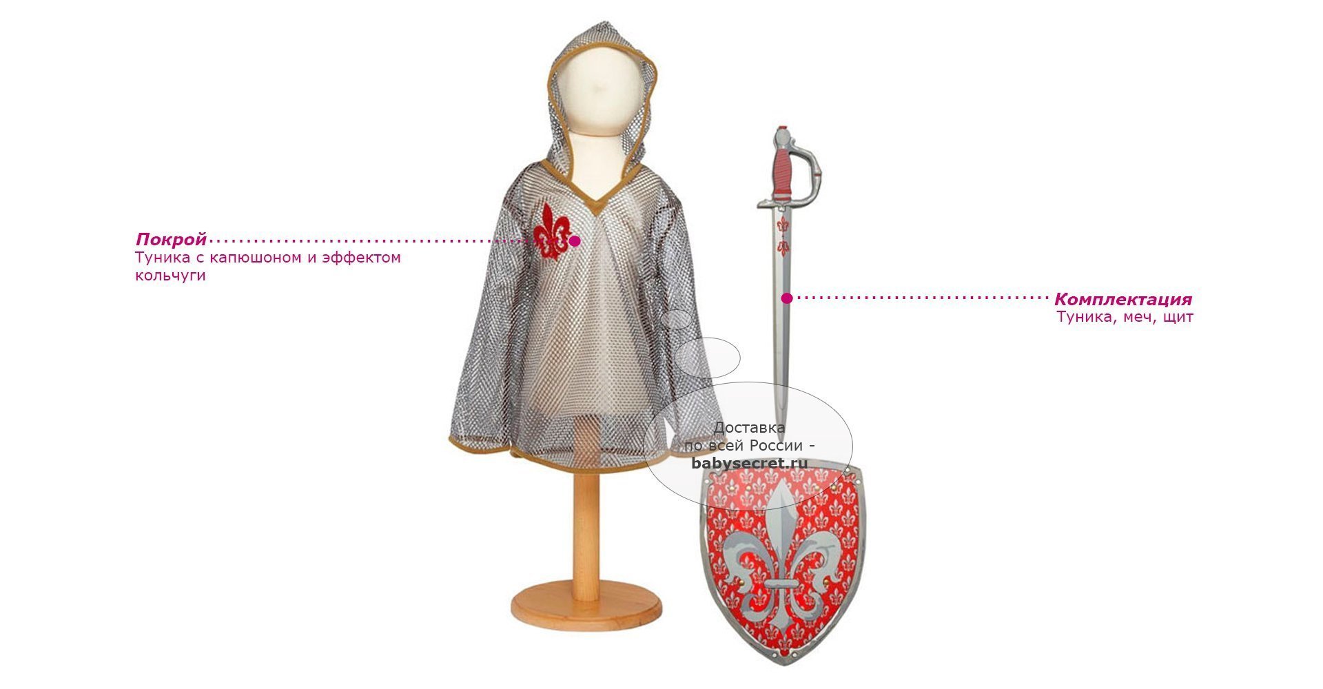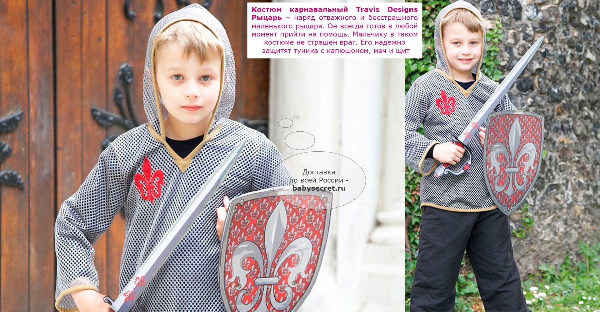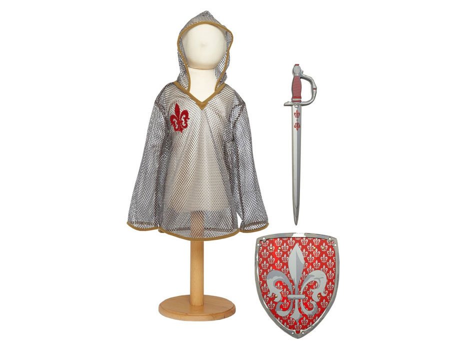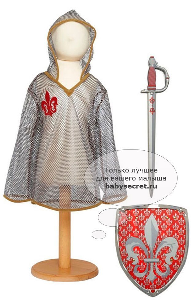 Основные характеристики: праздничный, оригинальный детский карнавальный костюм туника с капюшоном и эффектом кольчуги рекомендуется машинная стирка при 40 градусах, деликатный режим Приятные особенности карнавального костюма для мальчика Travis Designs "Рыцарь": карнавальный костюм «Рыцарь» - это классическая рыцарская туника с капюшоном и эффектом кольчуги. Выполнен из сетки серого цвета и эмблемой лилии красного цвета. В комплекте меч и щит. В комплекте: туника меч щит Размеры 3-5 лет: рост 98-110 см обхват груди 55-59 см талия 53-56 см Размеры 6-8 лет: рост 116-128 см обхват груди 61-67 см талия 58-60 см Артикул: KST