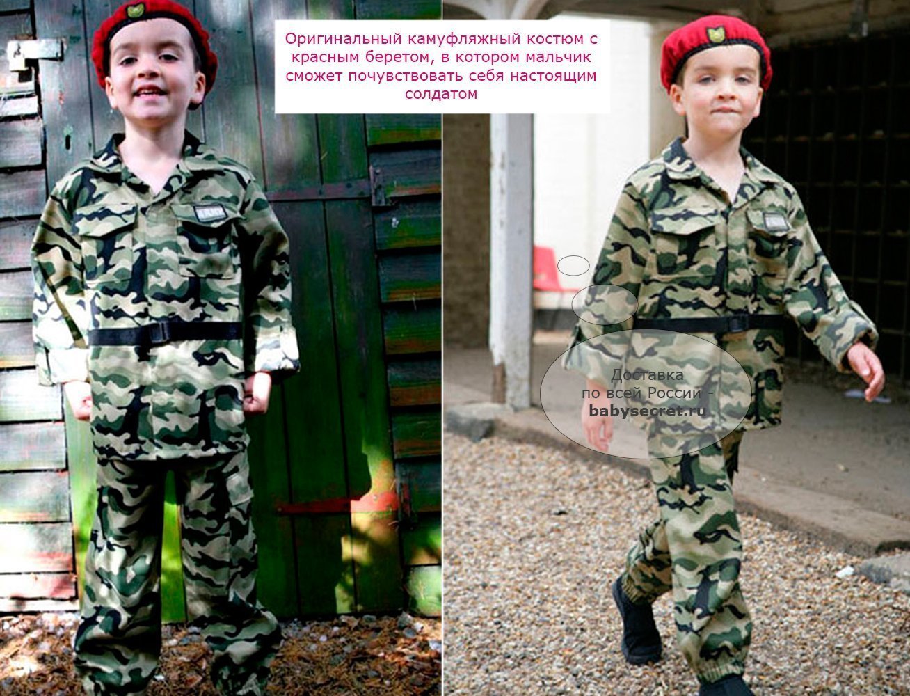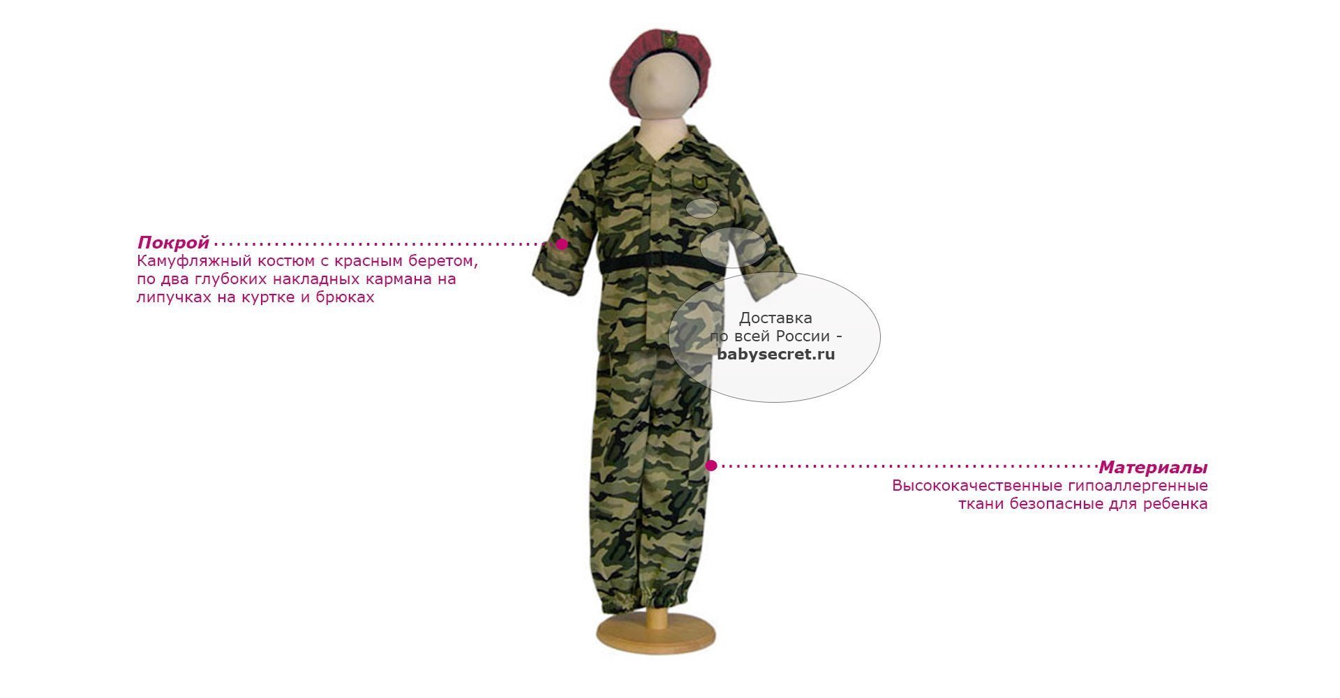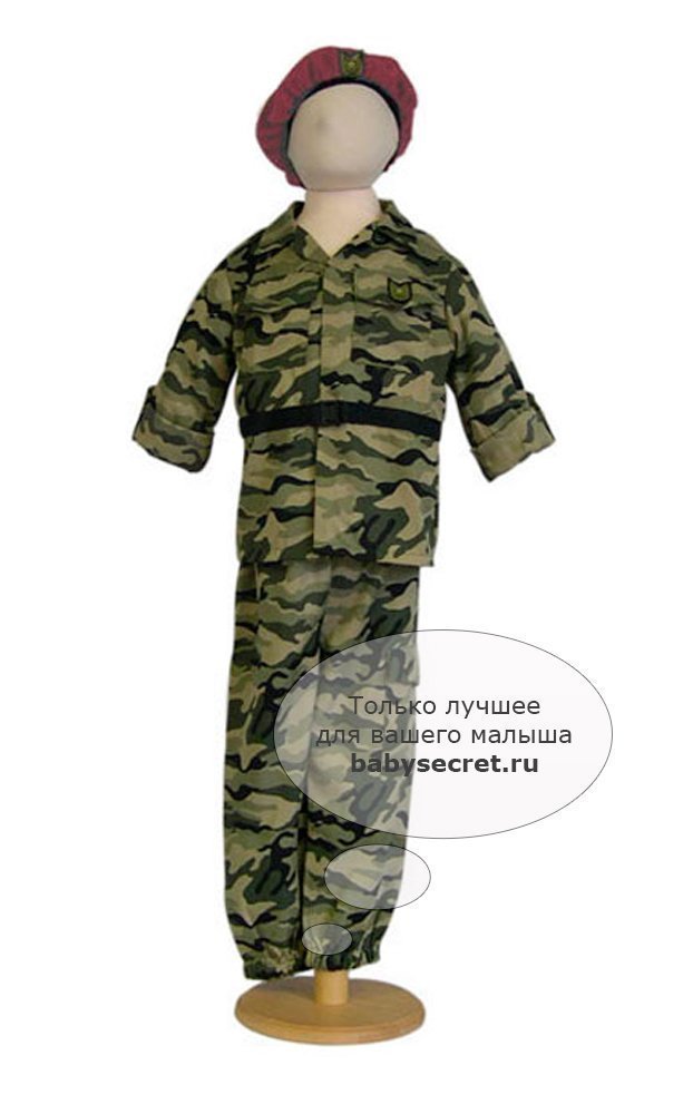 Основные характеристики: праздничный, оригинальный детский карнавальный костюм камуфляжный костюм с красным беретом, по два глубоких накладных кармана на липучках на куртке и брюках рекомендуется машинная стирка при 40 градусах, деликатный режим Приятные особенности карнавального костюма для мальчика Travis Designs Солдат: вашему ребенку нужен новогодний костюм? Вы решили устроить костюмированный новогодний вечер? Новый год – самое время для забавных и бесшабашных затей. Новогодний карнавальный (маскарадный) костюм Солдата поможет создать атмосферу праздника и сделать любую Ёлку по-настоящему веселой. Карнавальный костюм Travis Designs Солдат - лучший наряд на праздник. Отлично подойдёт в подарок ребёнку. Наверняка к тем, кто придет на новогодний утренник в костюме солдата, будет проявлено максимум внимания. У ребенка появится шанс выиграть приз за лучший маскарадный костюм. Размеры 3-5 лет: рост 98-110 см обхват груди 55-59 см талия 53-56 см Размеры 6-8 лет: рост 116-128 см обхват груди 61-67 см талия 58-60 см Артикул: CS3 (3-5 лет) Артикул: CS6 (6-8 лет)