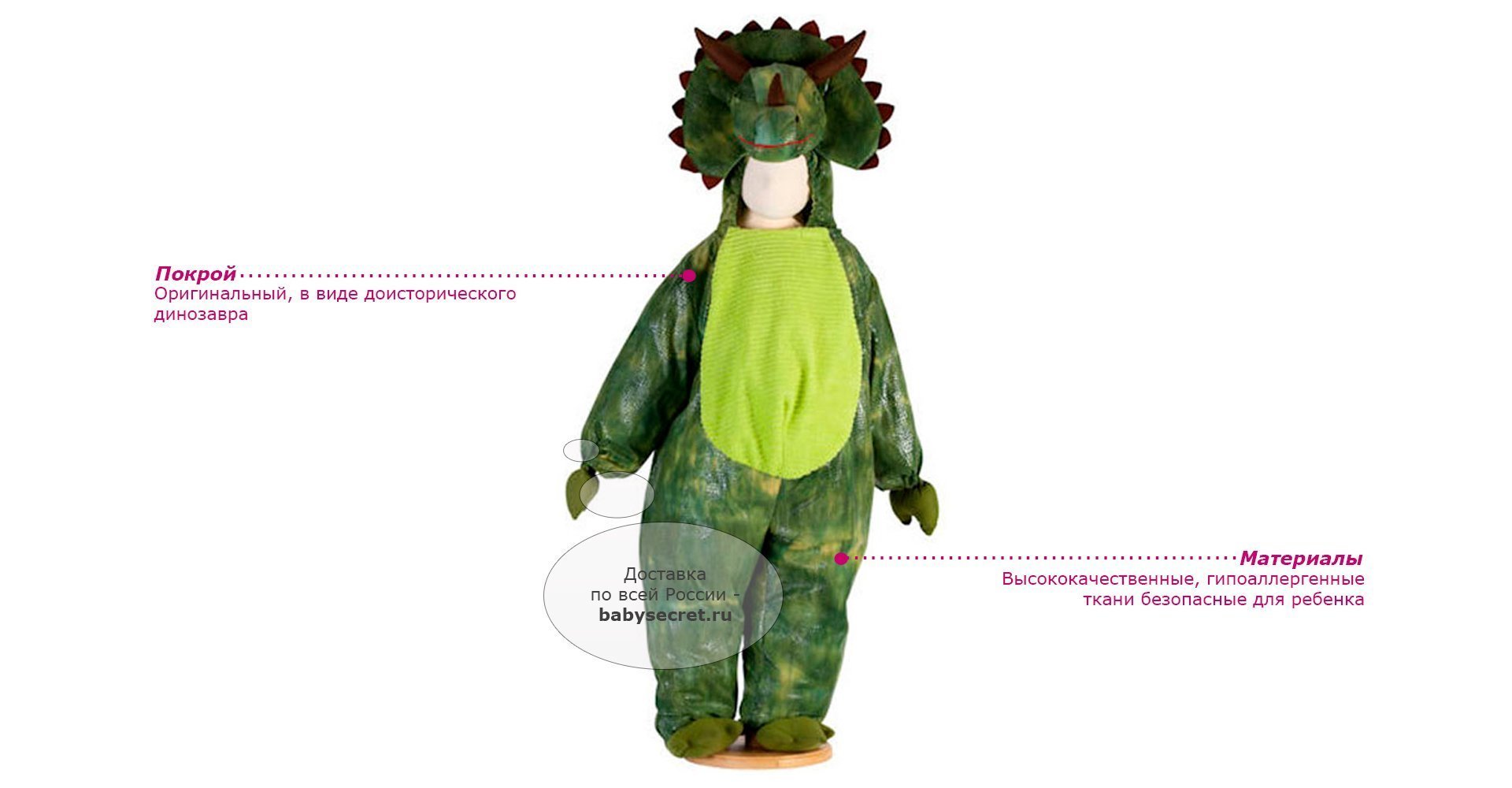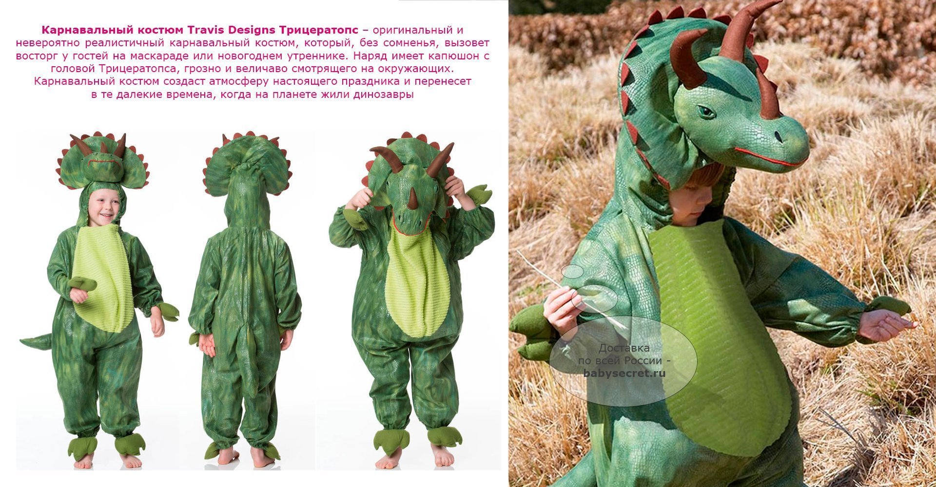 Основные характеристики: яркий детский карнавальный костюм оригинальный дизайн, в виде доисторического динозавра высококачественные гипоаллергенные ткани, безопасные для ребенка возможна машинная стирка в деликатном режиме Приятные особенности карнавального костюма Travis Designs Трицератопс: для любителей динозавров! Интересная идея костюма обрадует любого ребенка. Размеры 2-3 года: рост 92-98 см обхват груди 53-55 см талия 51-53 см Размеры 3-5 года: рост 98-110 см обхват груди 55-59 см талия 53-56 см Размеры 6-8 лет: рост 116-128 см обхват груди 61-67 см талия 58-60 см Артикул: TRI2 (2-3 года) Артикул: TRI3 (3-5 лет) Артикул: TRI6 (6-8 лет)