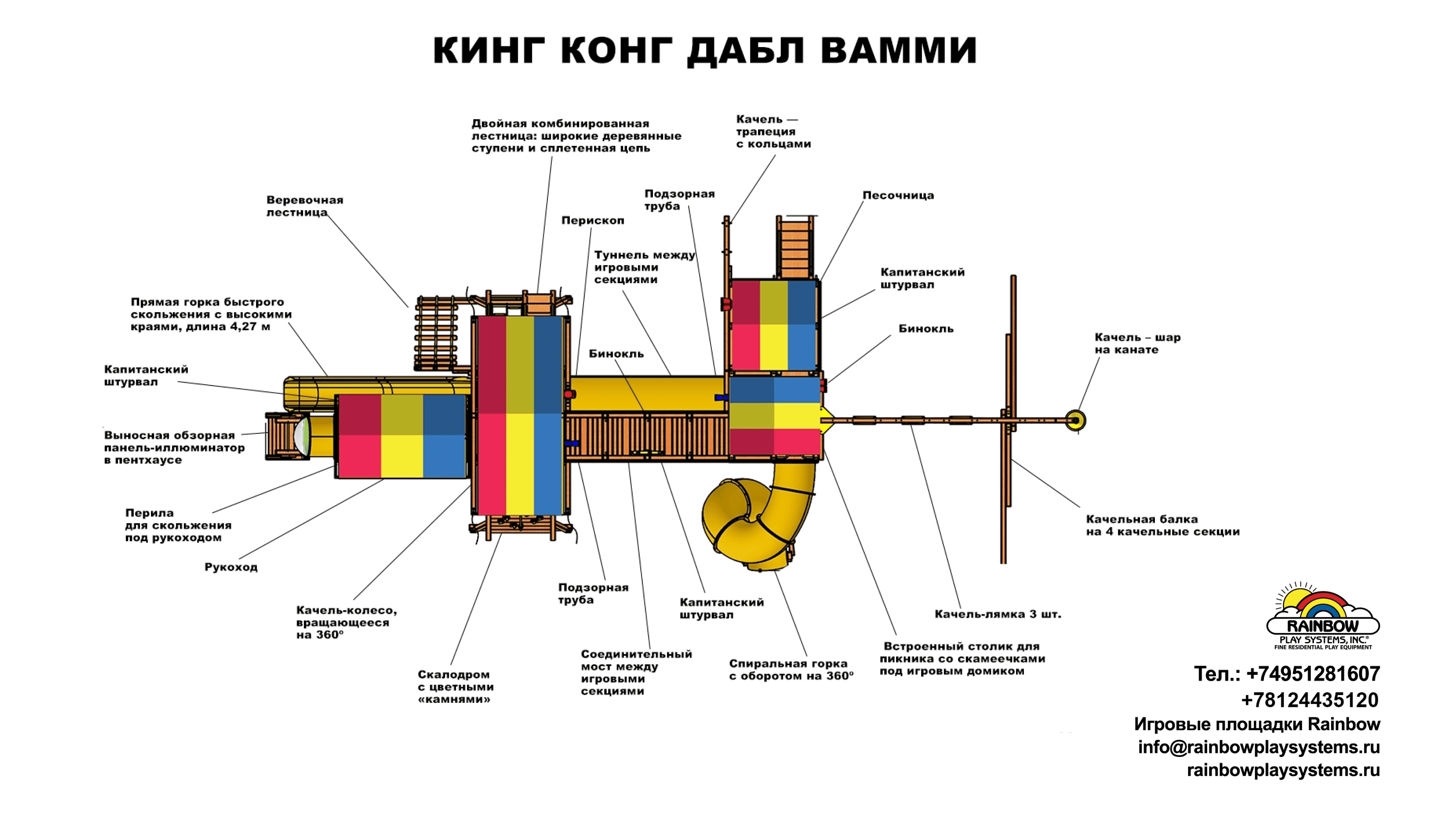 Приятные особенности :Детская игровая площадка King Kong Double Whammy WR восхищает своей величественностью. Множество игровых зон: наблюдательные вышки, горки, пространство для лазания и огромное разнообразие качелей - дети будут в восторге! Такая игровая площадка будет гордостью любого загородного дома и точкой притяжения всех гостей, как маленьких, так и взрослых.