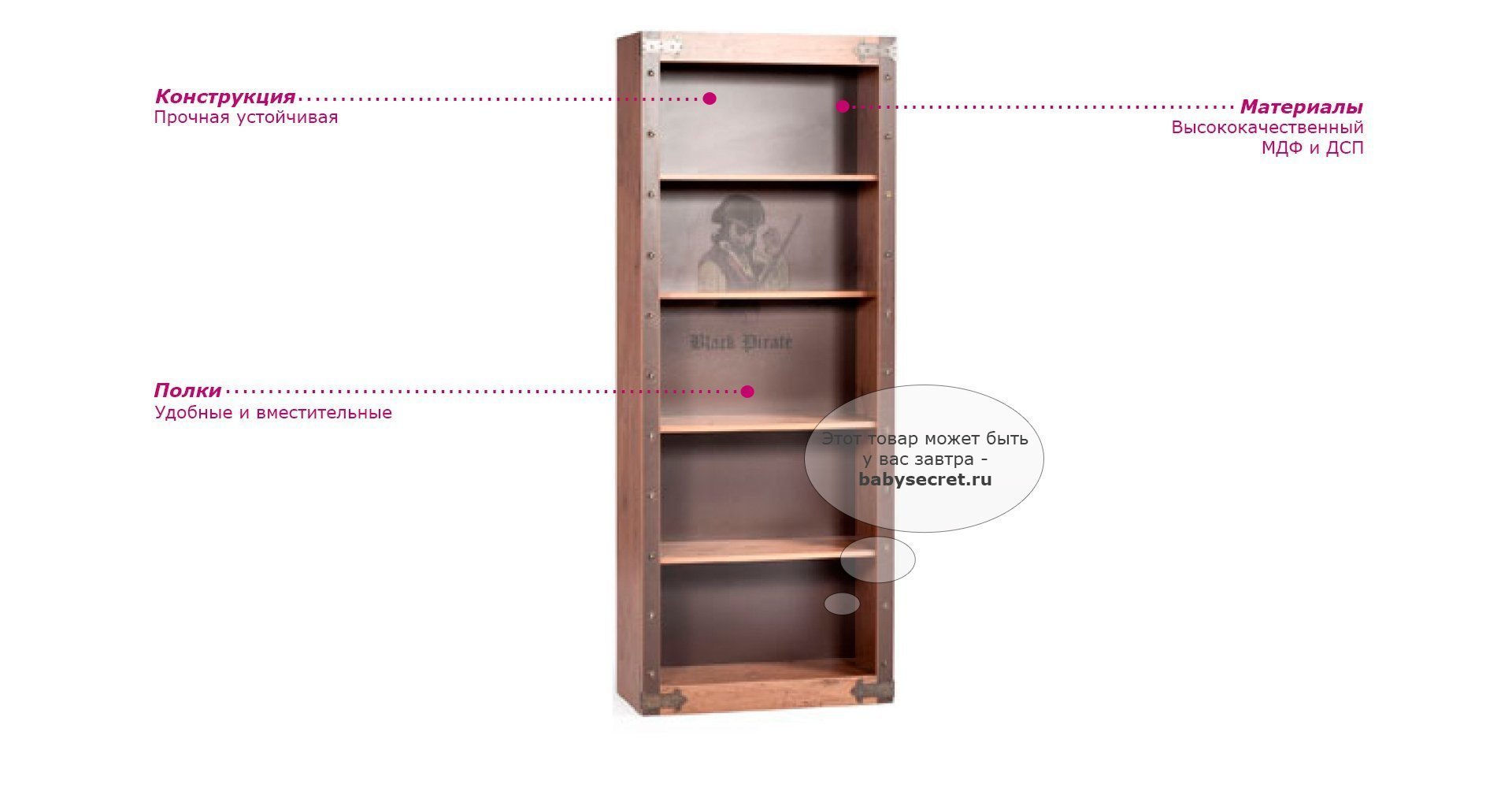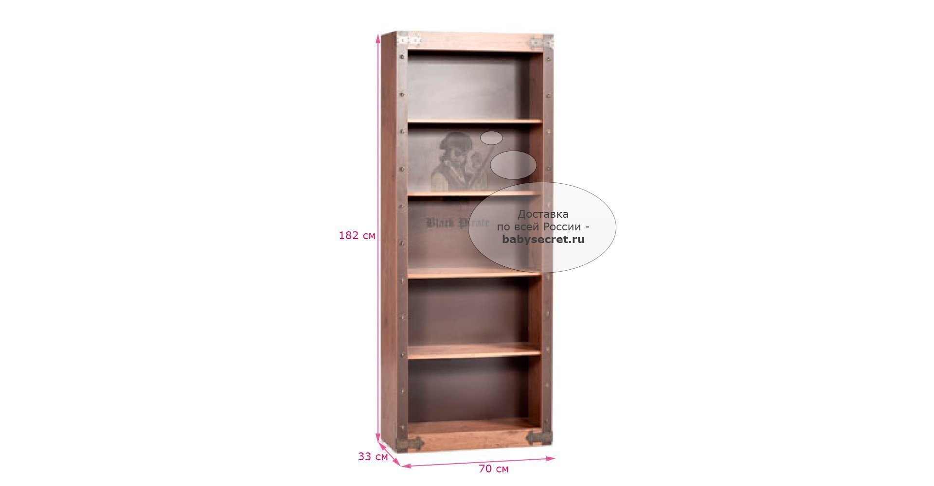 Производитель: Cilek (Турция) Материалы: Основные характеристики: Приятные особенности книжного стеллажа Cilek Black Pirate:лопни моя селезенка, если это не комната настоящего пирата! Отличие настоящей комнаты для маленького сорванца состоит в обязательном наличии не просто удобной и качественной мебели, но и полноценного игрового пространства, развивающего воображение ребенка и позволяющего проявить необходимую активность. Стеллаж имеет небольшие размеры, благодаря чему можно использовать даже в небольших комнатах без ущерба свободному игровому пространству. Простая конструкция. Модель имеет открытые полки, на которых можно разместить имеющиеся у ребенка книги и игрушки. Все детские стеллажи сертифицированы и допущены к продажам и использованию на территории России. Одним из приоритетов в производстве мебели для детей является экологическая чистота материала и его безопасность для здоровья ребенка. Общие размеры:внешние (шхгхв) 70.7x33.3x182.6 см Вес: 36 кг Габариты в упаковке (ШxДxВ): Коробка стеллаж : 0.096 м3 , 36 кгГарантия: 12 мес.