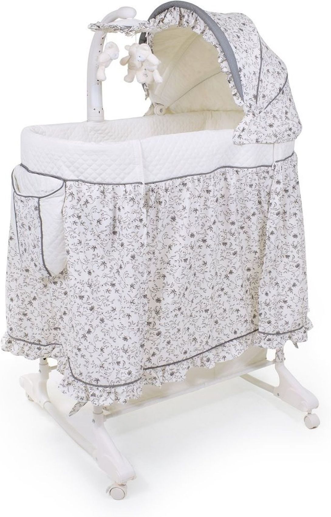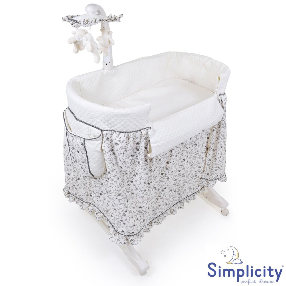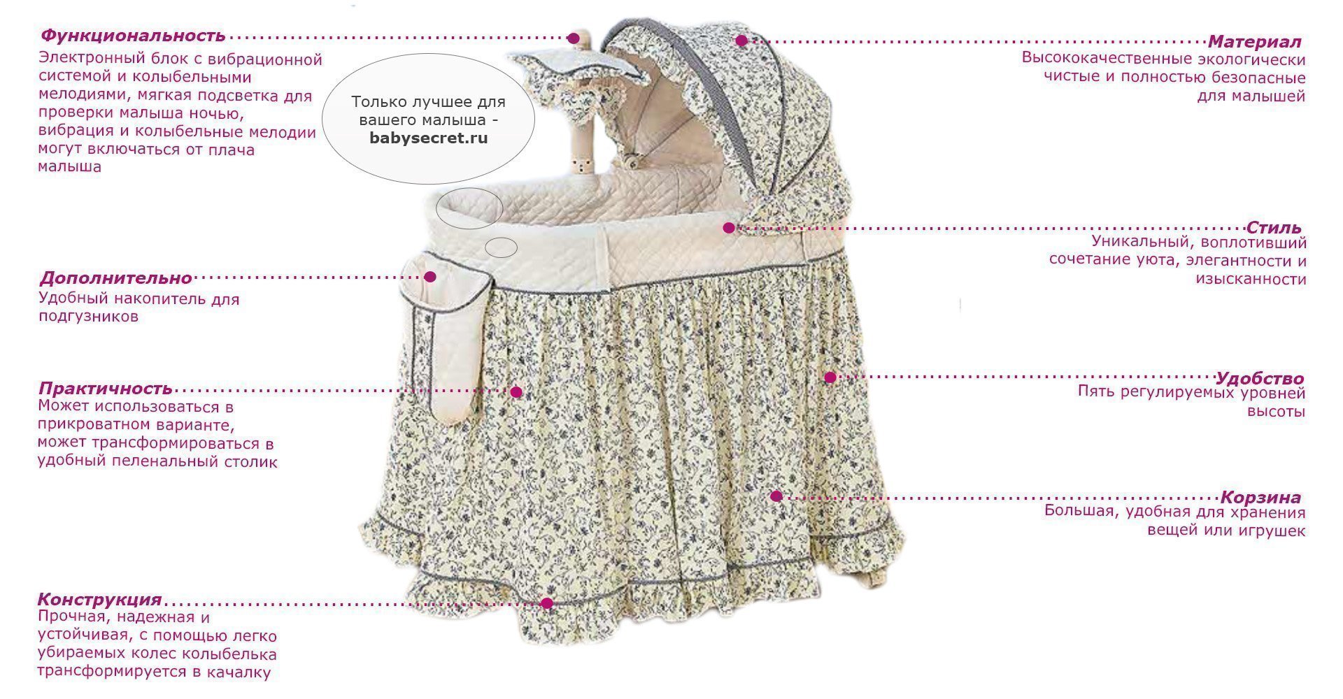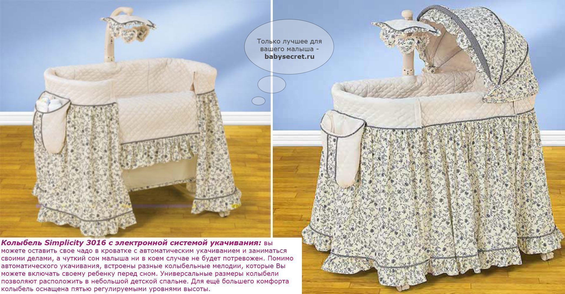 Приятные особенности колыбели Simplicity 3016 с электронной системой укачивания:для удобства колыбель оснащена электронной системой укачивания, которая оградит Вас от постоянной миссии по укачиванию малыша. Вы можете оставить свое чадо в кроватке с автоматическим укачиванием и заниматься своими делами, а чуткий сон малыша ни в коем случае не будет потревожен. Помимо автоматического укачивания, встроены разные колыбельные мелодии, которые Вы можете включать своему ребенку перед сном. Подвесные игрушки будут радовать глаз. Универсальные размеры колыбели позволяют расположить в небольшой детской спальне. Можно использовать в качестве пеленального столика, что поможет сэкономить место в детской комнате. Для ещё большего комфорта колыбель оснащена пятью регулируемыми уровнями высоты, а также имеет большую корзину для хранения детских игрушек или других мелочей. Молодым мамам очень понравится и то, что колыбель удобна в чистке – по мере загрязнения элементы из ткани можно снять и постирать, и колыбелька снова как новая. Удобно, красиво, а самое главное – идеально для здорового сна.