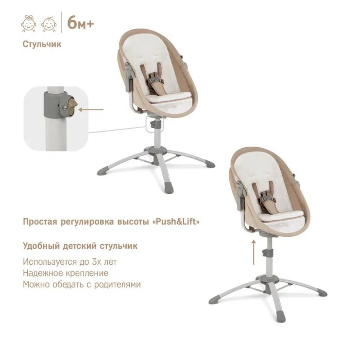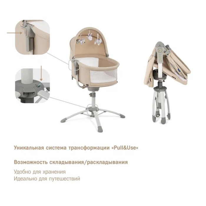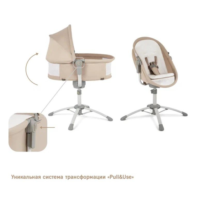 4. Стульчик для кормления. Когда ребенок будет уверенно сидеть, колыбель можно трансформировать в стульчик для кормления. Для этого нужно изменить наклон ложа через одновременное нажатие на 2 кнопки управления системой трансформации «Pull&Use», расположенные с каждой стороны люльки. Изменяя высоту стульчика, подбирается положение, при котором ребенок сможет сидеть за столом вместе со взрослыми.