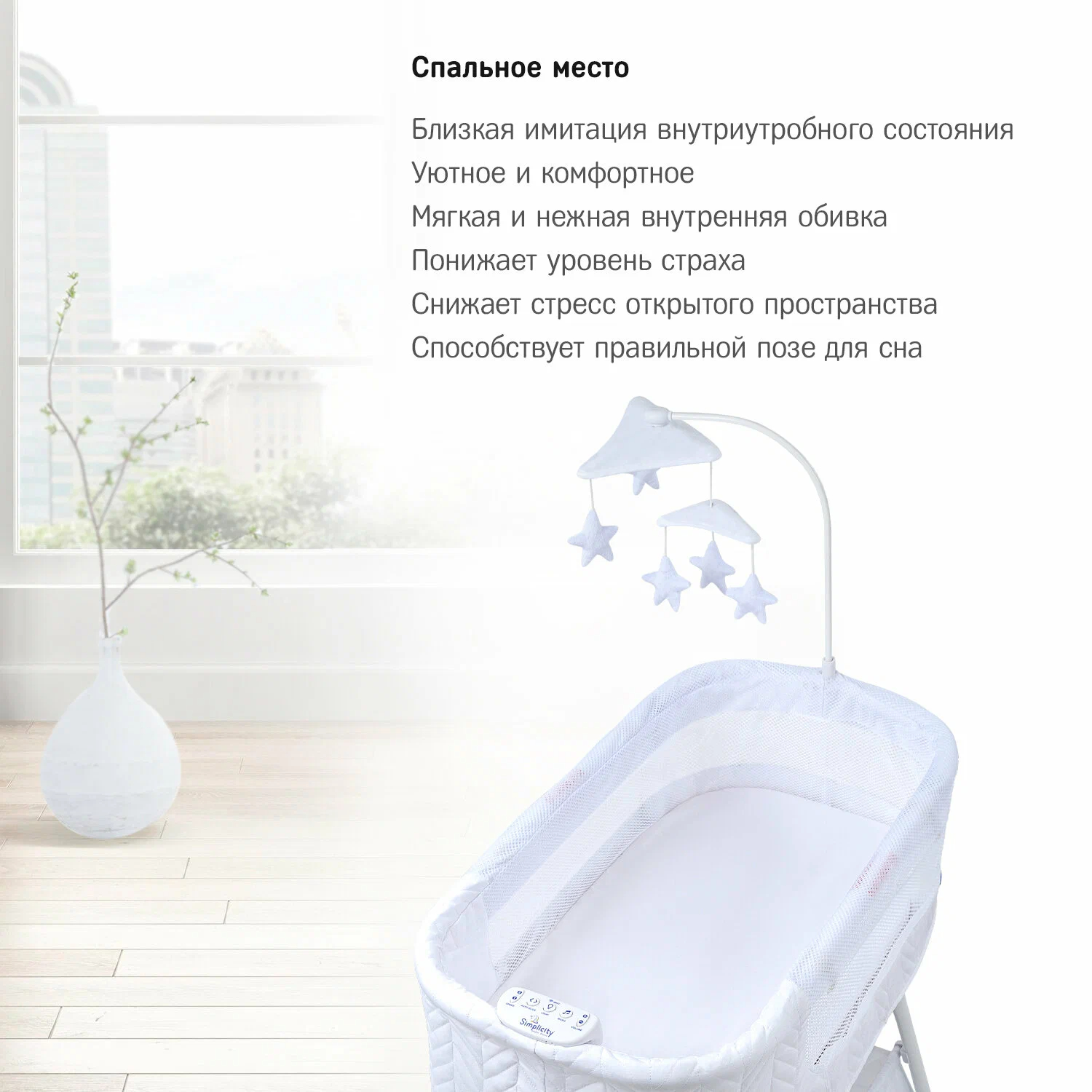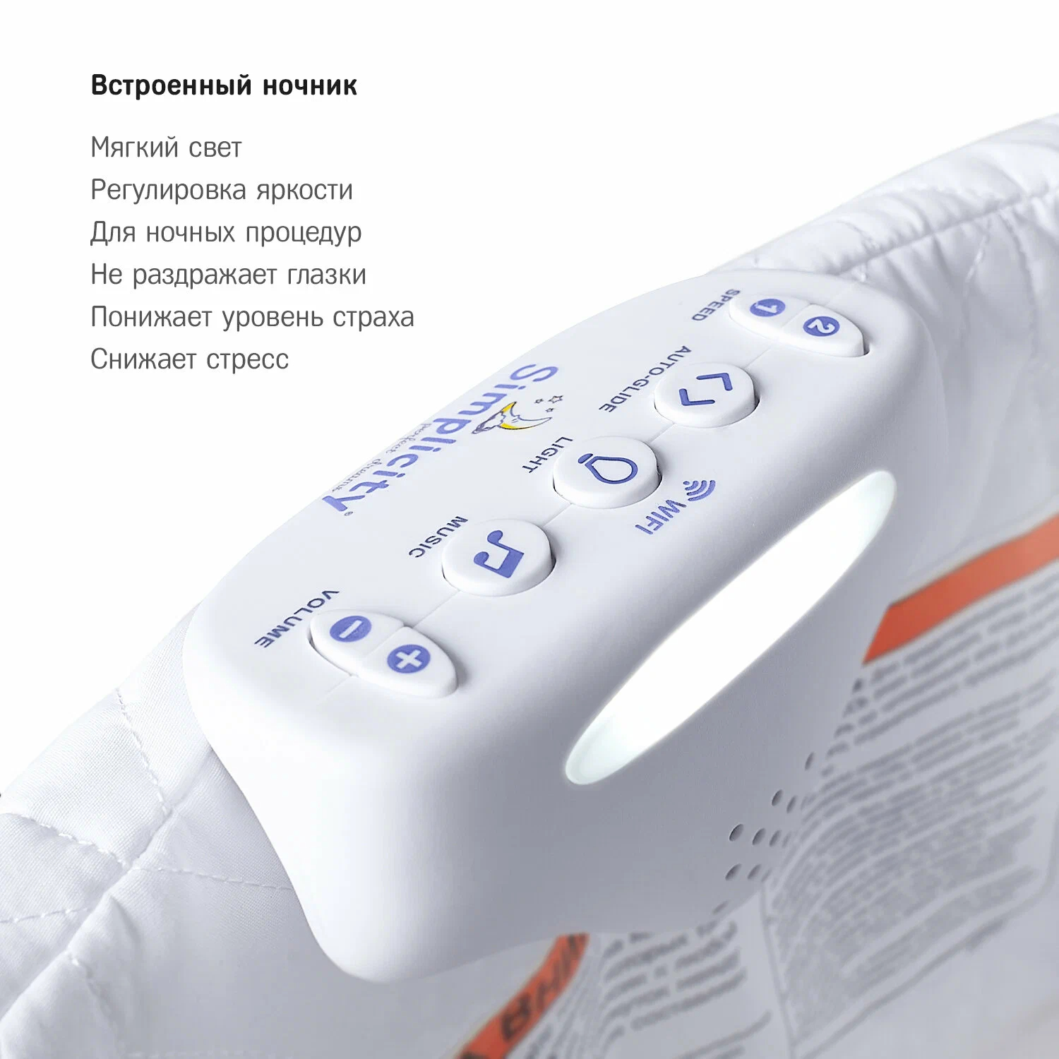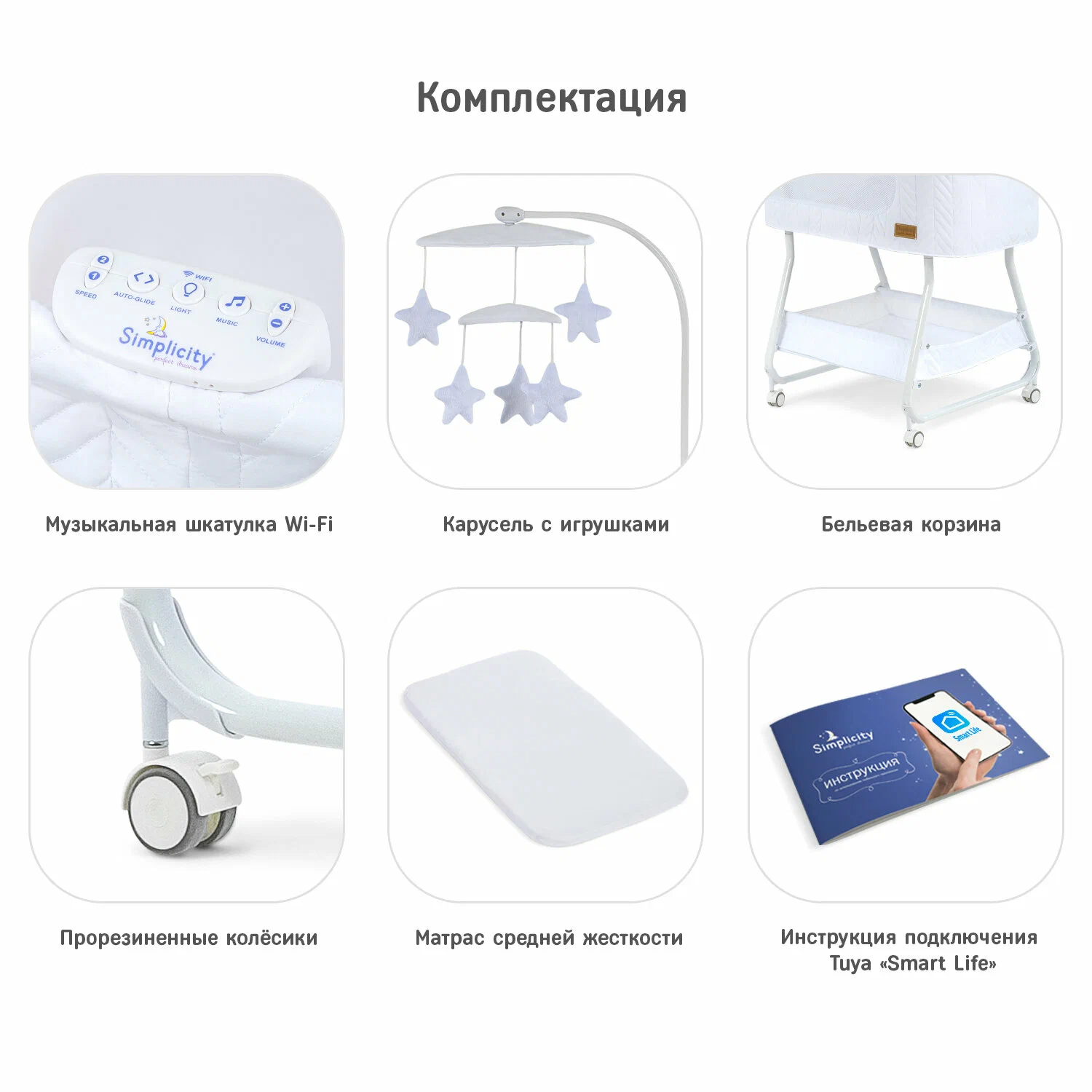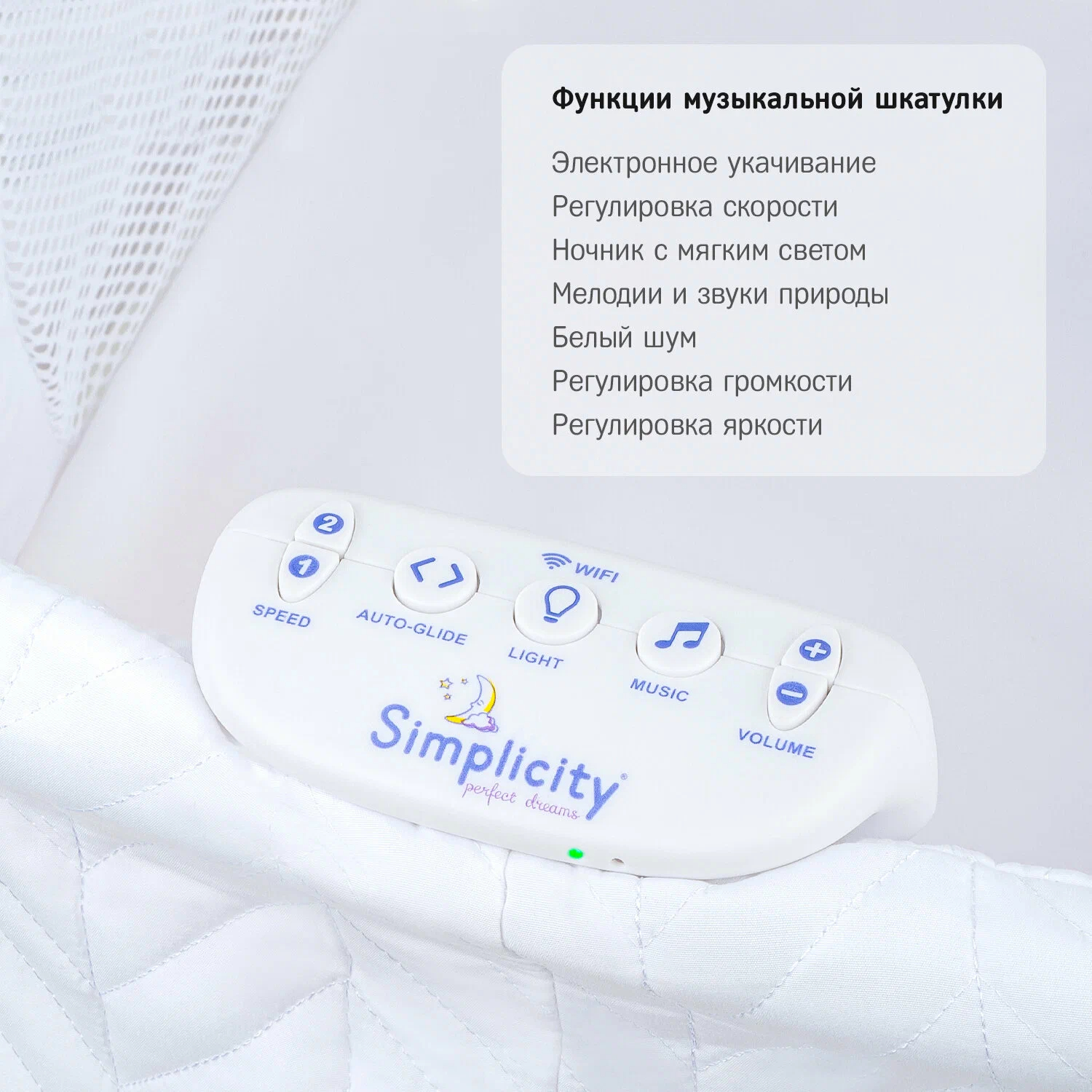 Основные характеристики:Колыбель для новорожденных Simplicity GL4090 Elite – это новое инновационное поколение электронных колыбелей серии Wi-Fi с ручным, сенсорным и голосовым управлением посредством Яндекс «Алиса», которые благодаря возможности интеграции в Яндекс «Умный Дом» значительно упрощают уход за ребёнком.В основу дизайна взят полюбившийся покупателям стиль контемпорари. Тканевый чехол сделан из современного мембранного материала Micro-Mesh 360, создающего внутри комфортный микроклимат. Благодаря добавлению сетчатых вставок родителям удобно наблюдать за младенцем и внутрь люльки всегда будет доступ свежего воздуха. Этот современный мембранный материал можно стирать и сушить в машинке, он прекрасно переносит отпаривание и разглаживается утюгом.Люлька для новорожденных имеет уникальную особенность – она оснащена музыкальной шкатулкой Wi-Fi для ручного управления колыбелью, сенсорного управления посредством маминого смартфона и приложения Tuya «Smart Life», а также голосового управления с помощью голосовых команд для колонки Яндекс «Алиса» и приложения «Умный Дом».
