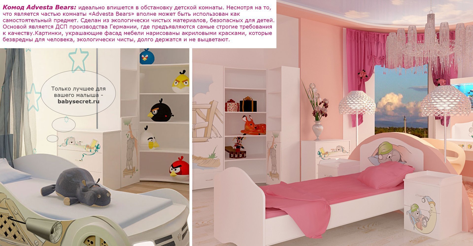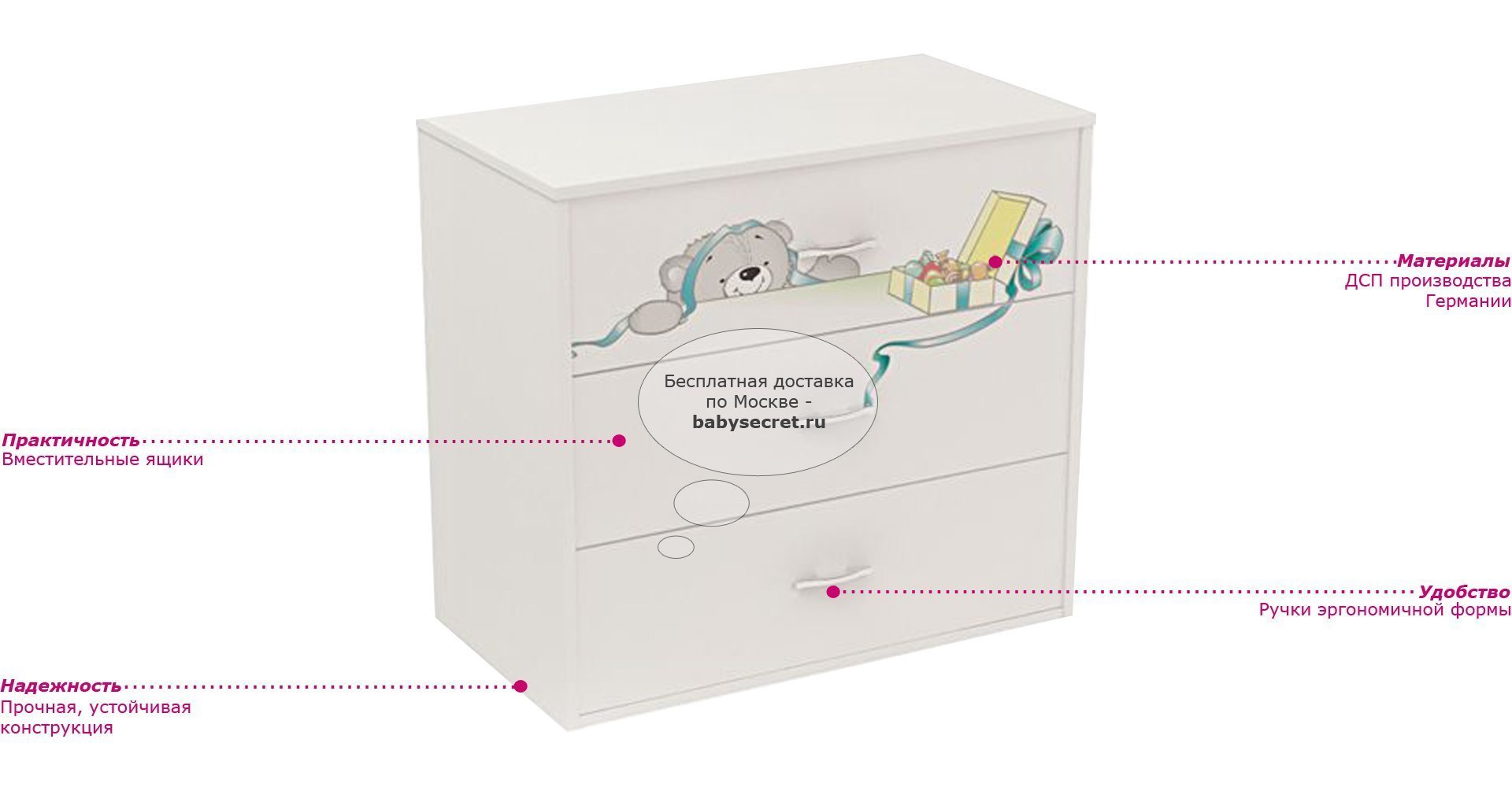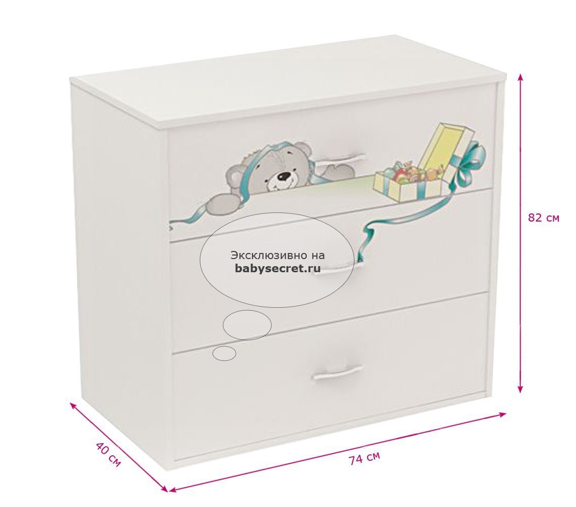 Приятные особенности комода Bears: сделан из экологически чистых материалов, безопасных для детей. Основой является ДСП производства Германии, где предъявляются самые строгие требования к качеству. У мебели есть преимущество, которое понравится, как детям, так и взрослым. Детскую мебель можно красиво оформить специальными картинками, которые изготовлены из прочных и долговечных материалов, позволяющих проводить влажную уборку. Картинки, украшающие фасады мебели нарисованы акриловыми красками, которые безвредны для человека, экологически чисты, долго держатся и не выцветают.